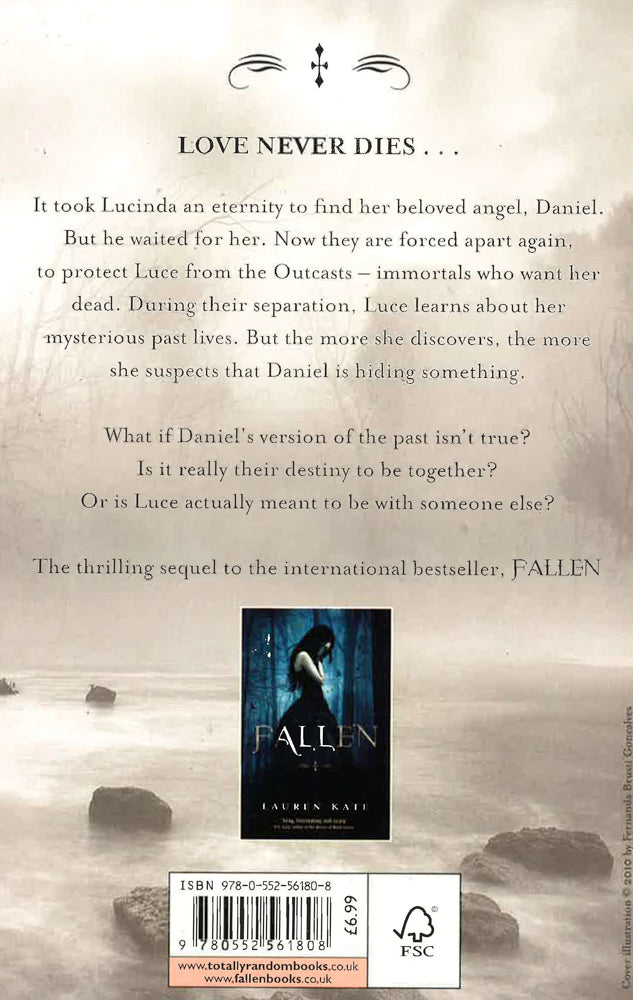 It took Lucinda an eternity to find her beloved angel, Daniel. But he waited for her. Now they are forced apart again, to protect Luce from the Outcasts - immortals who want her dead. During their separation, Luce learns about her mysterious past lives. But the more she discovers, the more she suspects Daniel is hiding something.