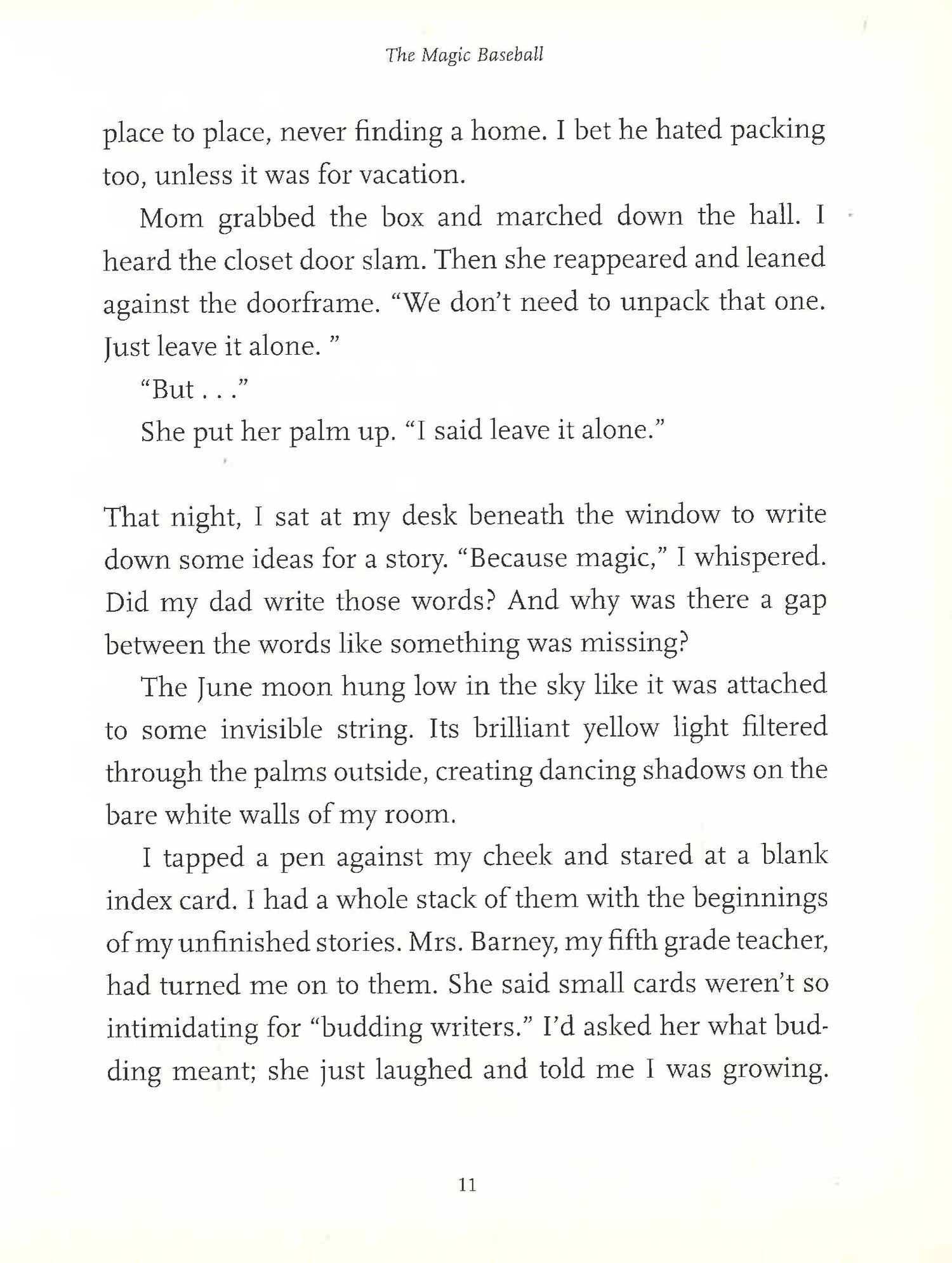 When twelve-year-old Izzy discovers a beat-up baseball marked with the words 'Because magic' while unpacking in yet another new apartment, she is determined to figure out what it means. What secrets does this old ball have to tell? Her mom certainly isn't sharing any especially when it comes to Izzy's father, who died before Izzy was born. But when she spends the summer in her Nana's remote New Mexico village, Izzy discovers long-buried secrets that come alive in an enchanted landscape of watermelon mountains, whispering winds, and tortilla suns. Infused with the flavor of the southwest and sprinkled with just a pinch of magic, this heartfelt middle grade debut is as rich and satisfying as Nana's homemade enchiladas.