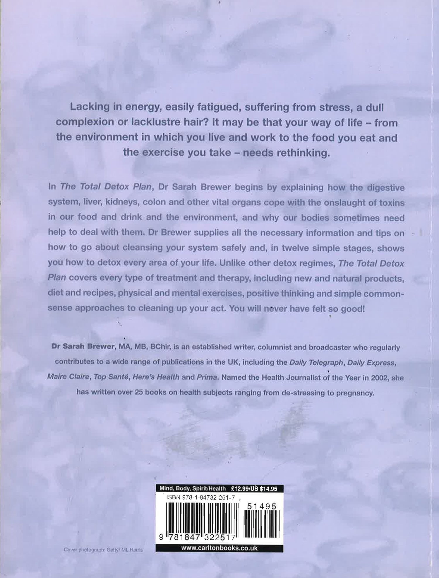 Hundreds of products now claim to remove cellulite, cleanse your system, help you sleep, relieve stress, or give you lustrous hair. These can often be quick fixes that do not help in the long run. Dr. Sarah Brewer supplies all the necessary information on how to cleanse your system safely. Brewer creates her own Total Detox Plan using new and natural products, diet and recipes, exercises and therapies and simple common sense approaches. You will never have felt so good!
