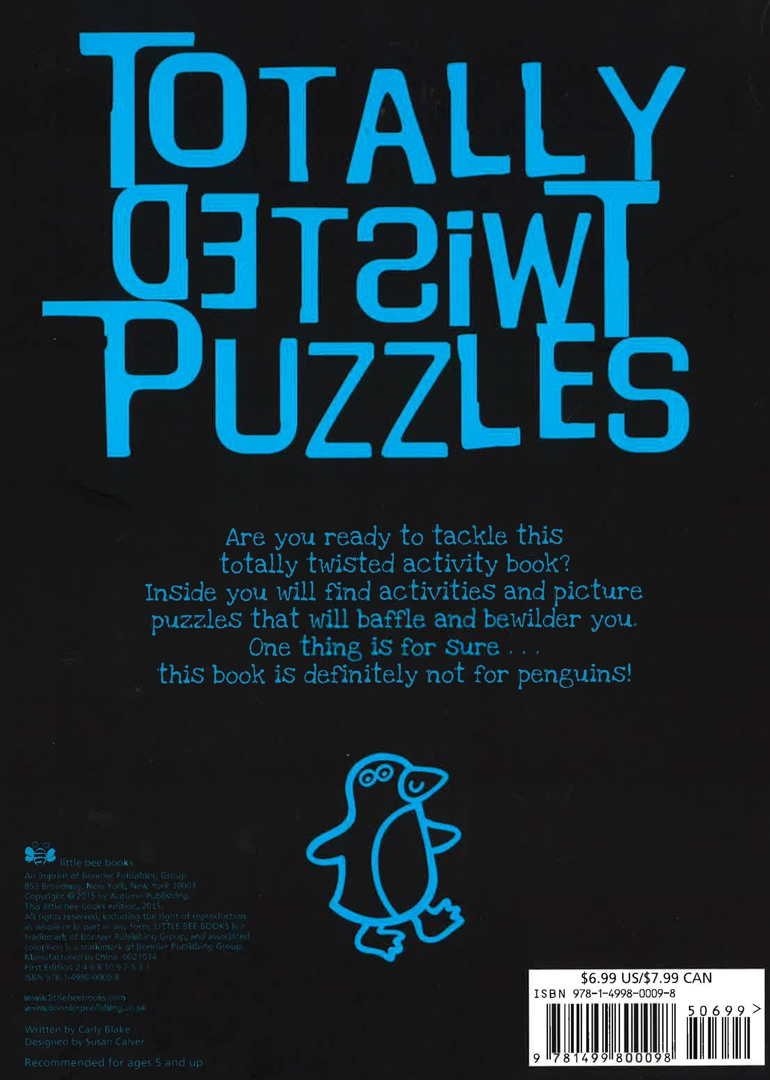 Totally Twisted activity books feature activities, words, and puzzles that will keep kids amused and entertained! Are you ready to tackle this totally twisted activity book? Inside you will find activities and picture puzzles that will baffle and bewilder. One thing is for sure . . . This book is definitely not for penguins!