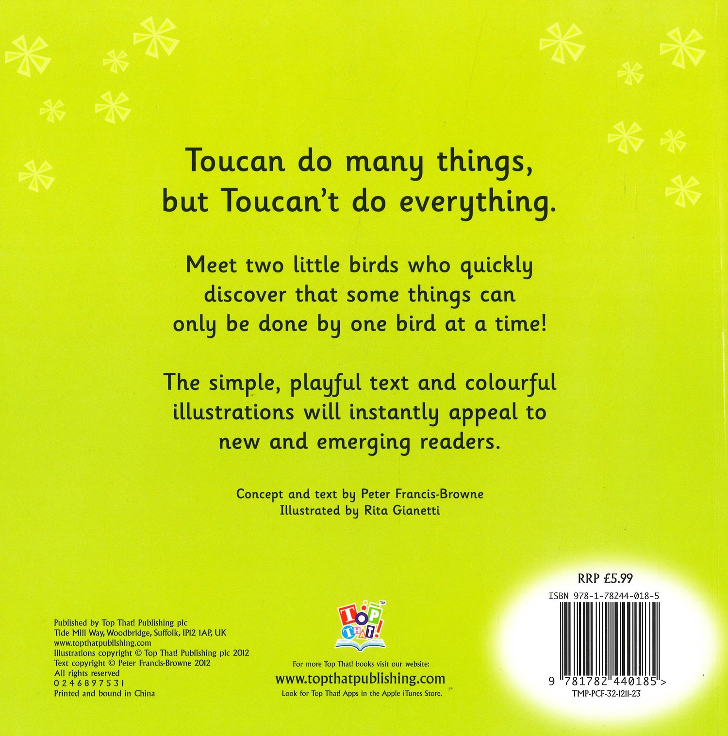 Toucan do many things, but Toucan't do everything. Meet two little birds who quickly discover that some things can only be done by one bird at a time! The simple, playful text and colourful illustrations will instantly appeal to new and emerging readers.