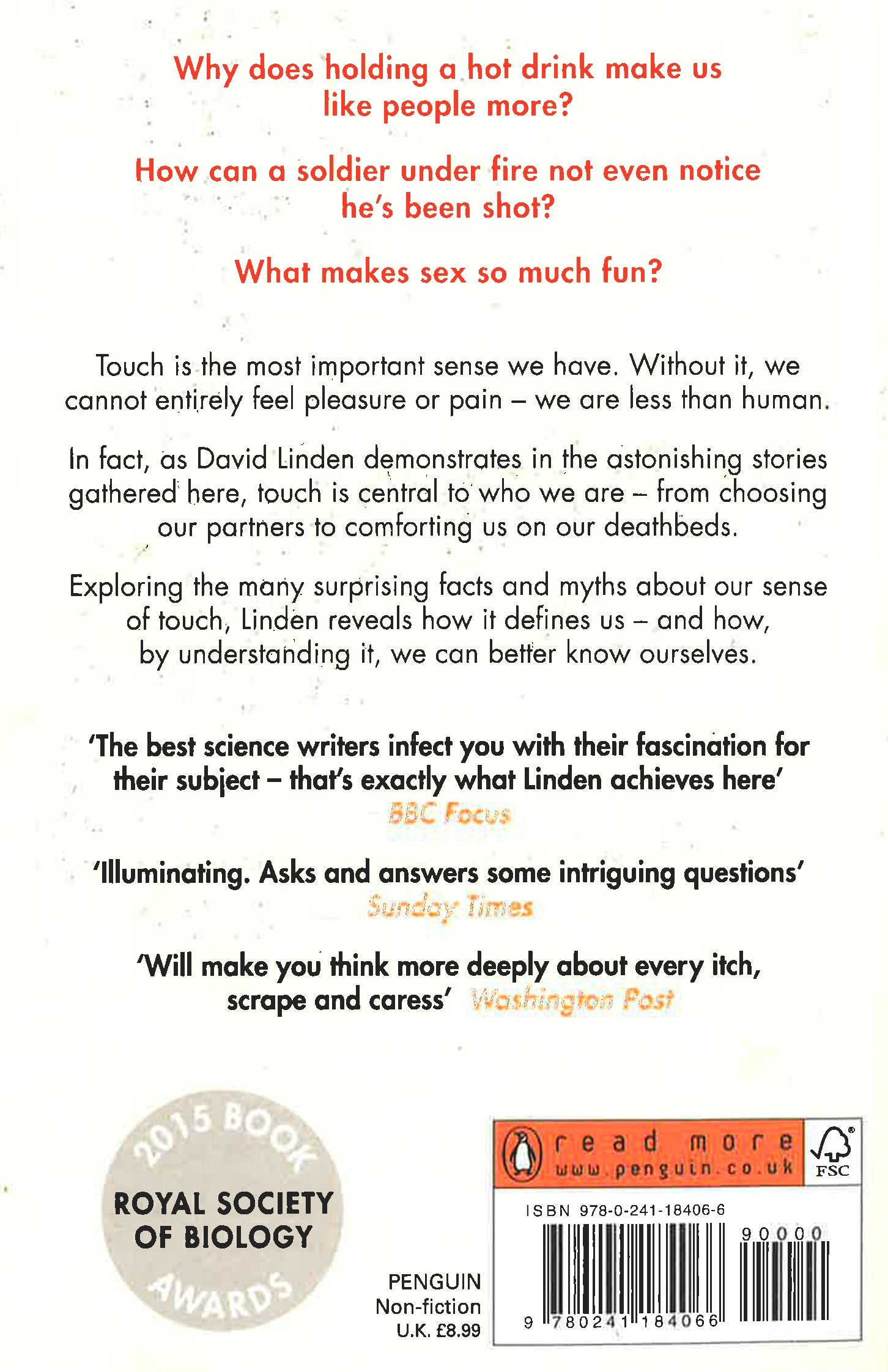 Why does holding a hot drink make us like people more? How can a soldier under fire not even notice he's been shot? What makes sex so much fun? Touch is the most important sense we have. Without it, we cannot entirely feel pleasure or pain - we are less than human. In fact, as David Linden demonstrates in the astonishing stories gathered here, touch is central to who we are - from choosing our partners to comforting us on our deathbeds. Exploring the many surprising facts and myths about our sense of touch, Linden reveals how it defines us - and how, by understanding it, we can better know ourselves.