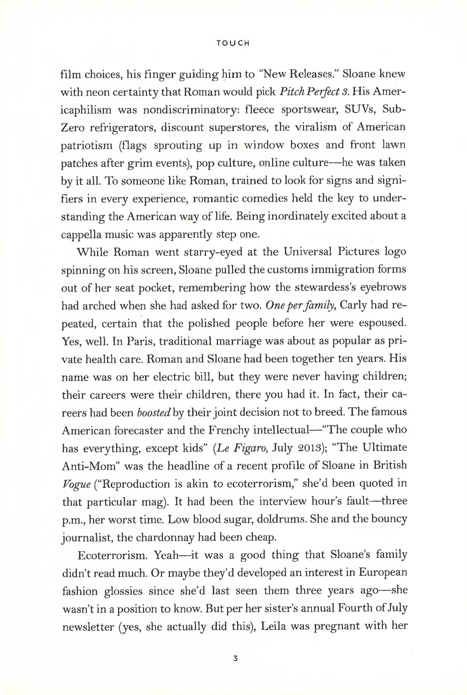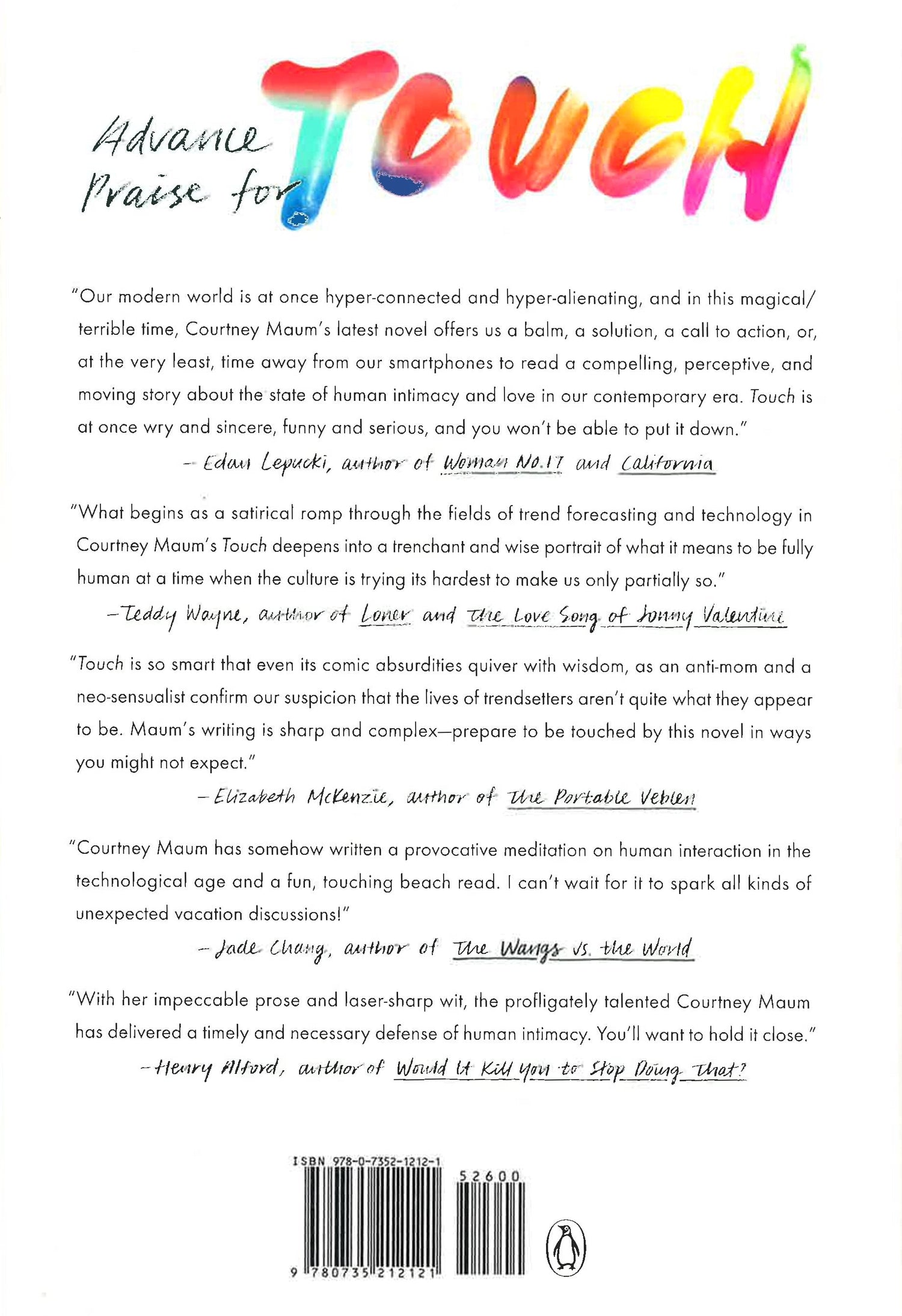 A heartfelt, hilarious tale of a famous trend forecaster who suddenly finds herself at odds with her own predictions...and her own heart. Estranged from her family, best friends with her driverless car, partnered with a Frenchman who believes in post-sexual sex, international trend forecaster Sloane Jacobsen is the perfect candidate to lead tech giant Mammoth's conference for affluent consumers who prefer virtual relationships to the real thing. But early in her contract, Sloane starts picking up on cues that physical intimacy is going to make a major comeback, leaving many--Sloane included--to question if the forty-year-old's intutions are as dependable as they once were. And if Sloane goes rogue against her all-powerful employer, will she be able to let in the love and connectedness she's long been denying herself? A poignant but amusing call to arms that showcases Courtney Maum's signature humor, Touch is a moving investigation into what it means to be an individual in a globalized world.