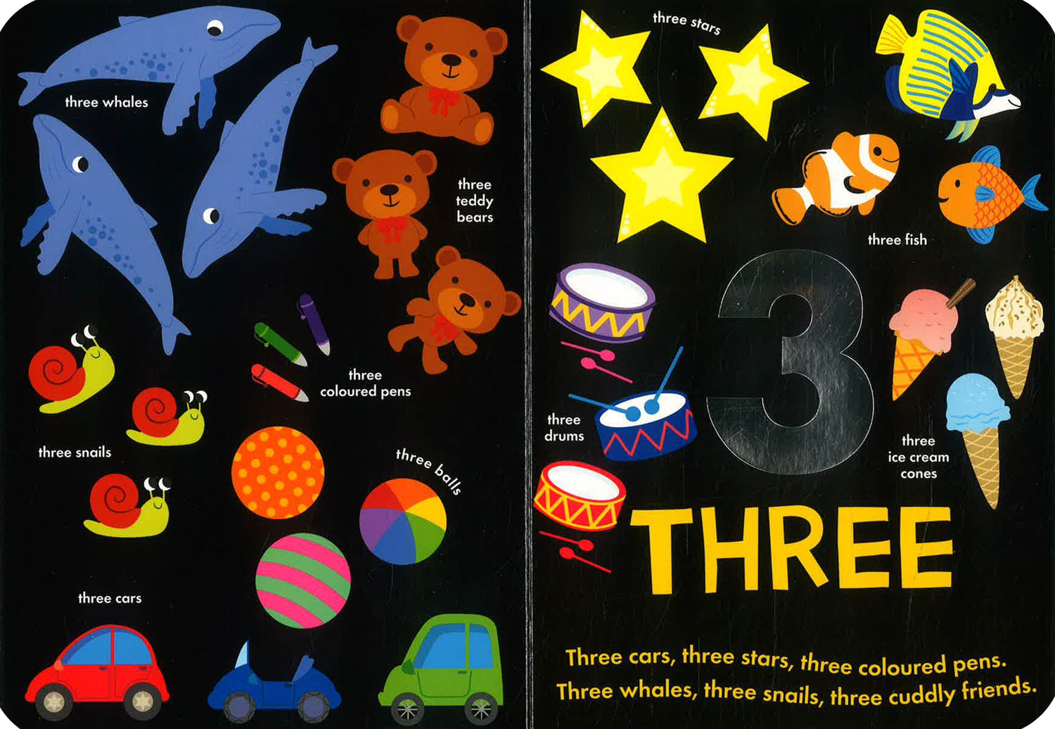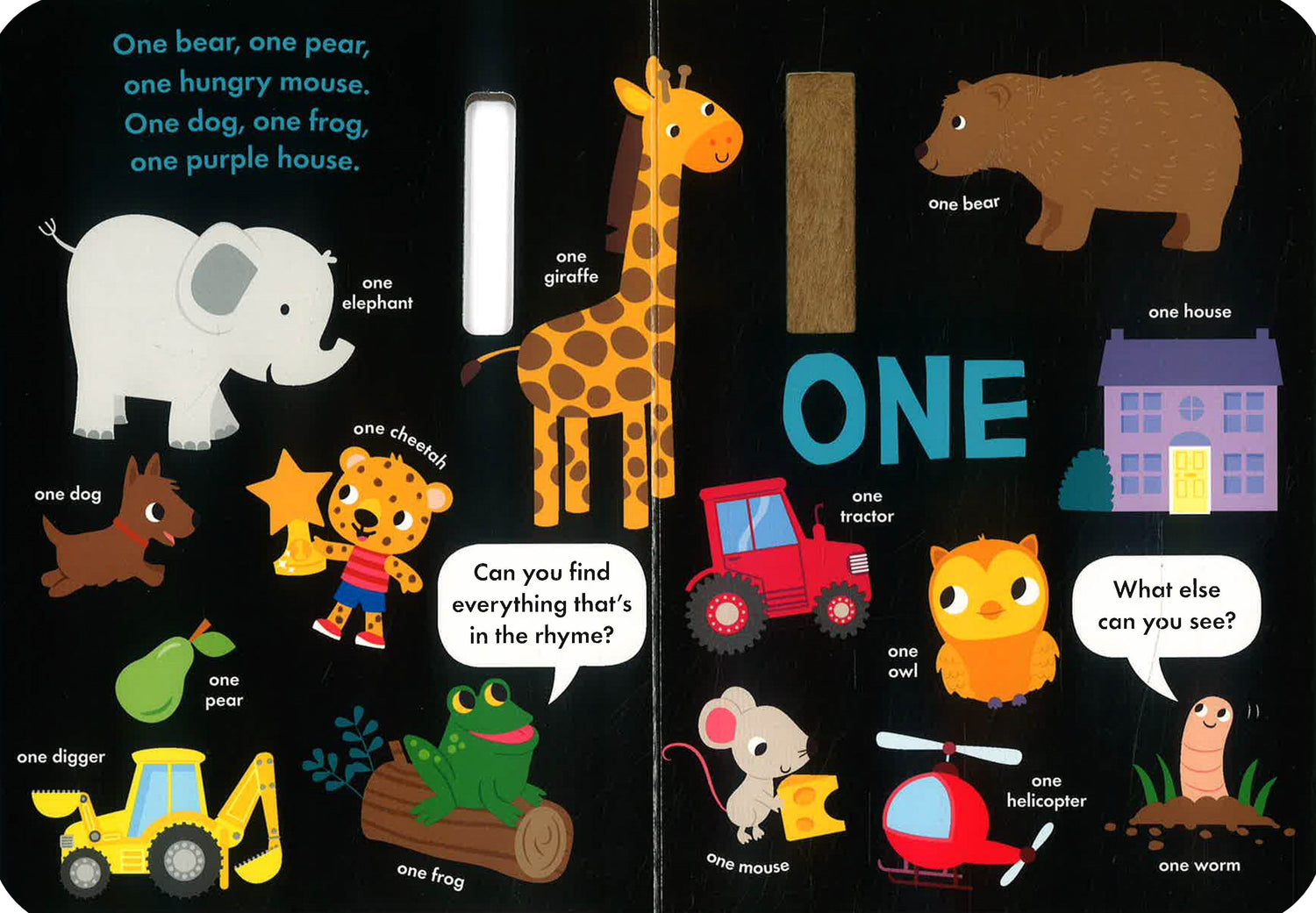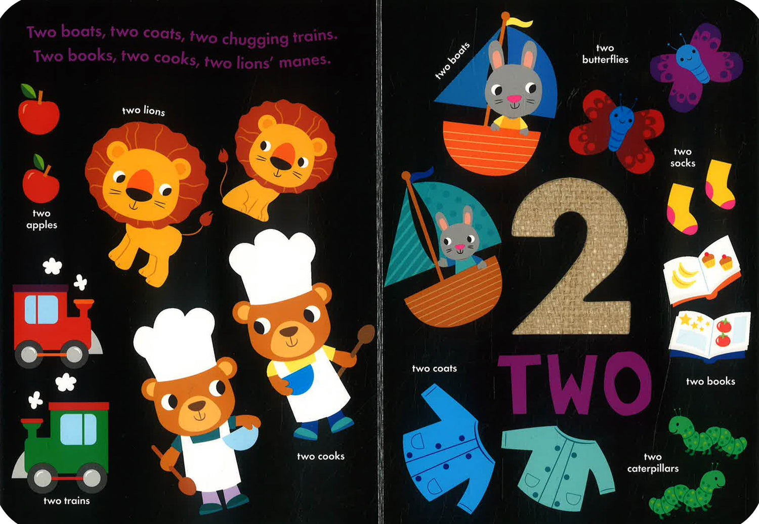 Learn numbers and first words in this cute little book with rhyming text, fun characters and touch-and-feel elements throughout.