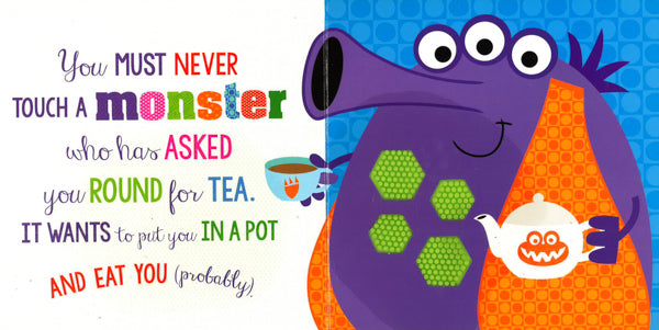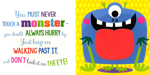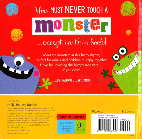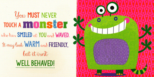 You must never touch a monster . . . except in this book! This monster-themed, touch-and-feel book is perfect for young children! Children will love reading the funny rhyme that tells them the dangers of touching a monster--and then ignoring the advice! Amazing silicone touches are featured throughout, each with a different texture for children to explore. This tactile book offers plenty for young children to enjoy, helping to promote an early love of reading!