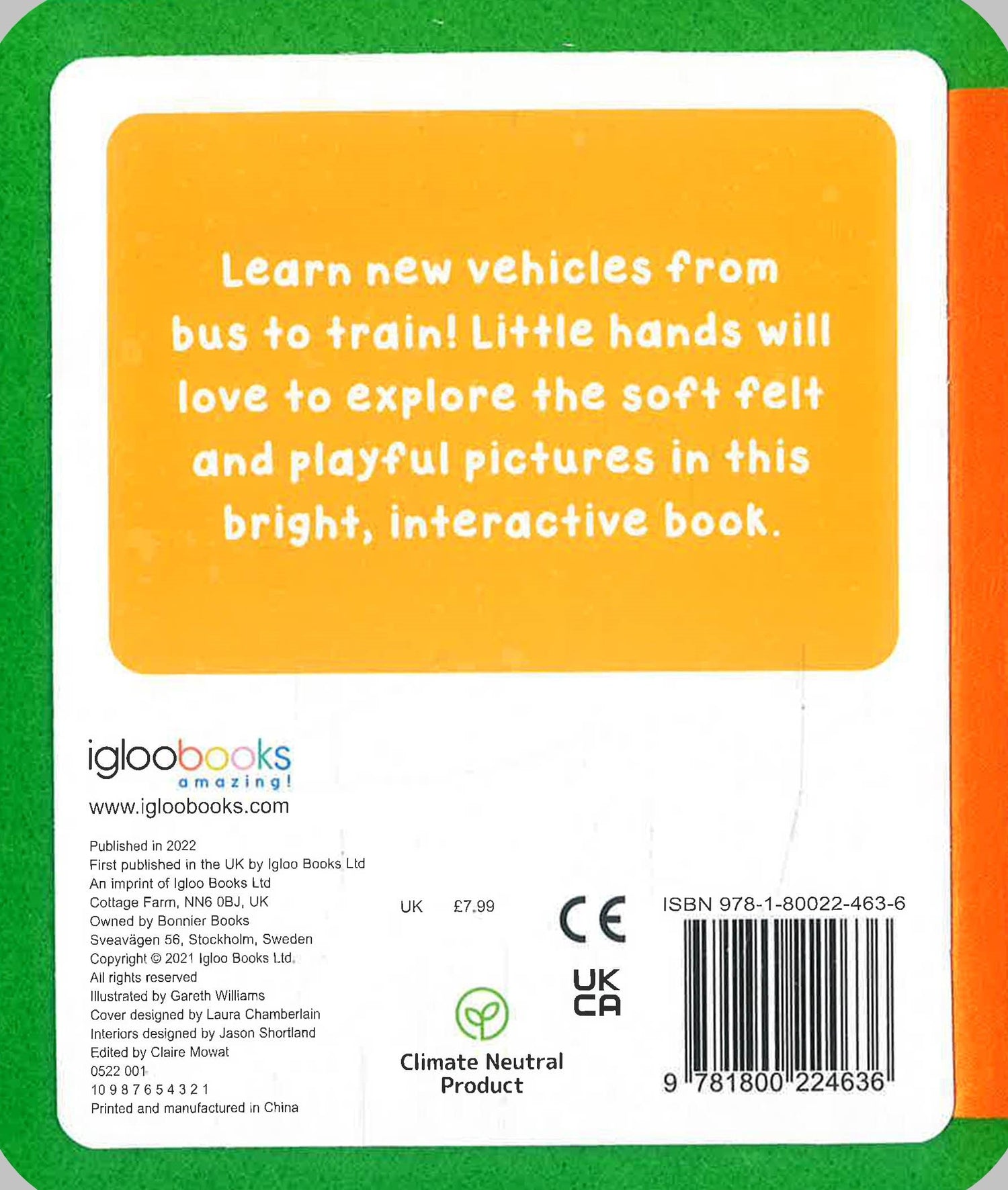 Learn new vehicles from bus to train! Little hands will love to explore the soft felt and playful pictures in this bright, interactive book.