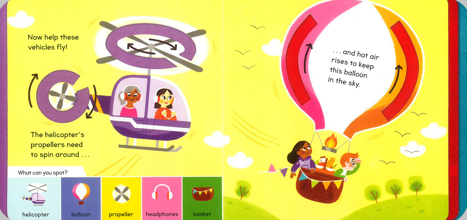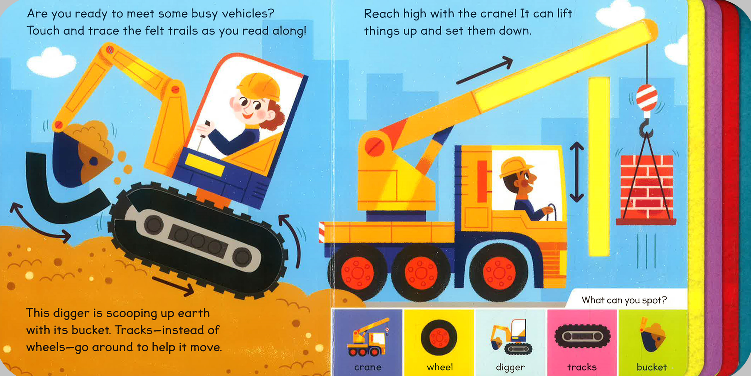This interactive board book will introduce toddlers to various vehicles and things that go! Children can trace the felt trails to see how a digger works, help race cars zoom on the track, steer a wheel, spin a helicopter's propellers, pump gas, and much more. Colorful sheets of felt embedded between the board pages create a cascading effect that is not only visually appealing but makes turning the pages of this book very easy for little hands. In addition to the tactile experience, this book provides items to seek and find on every page!