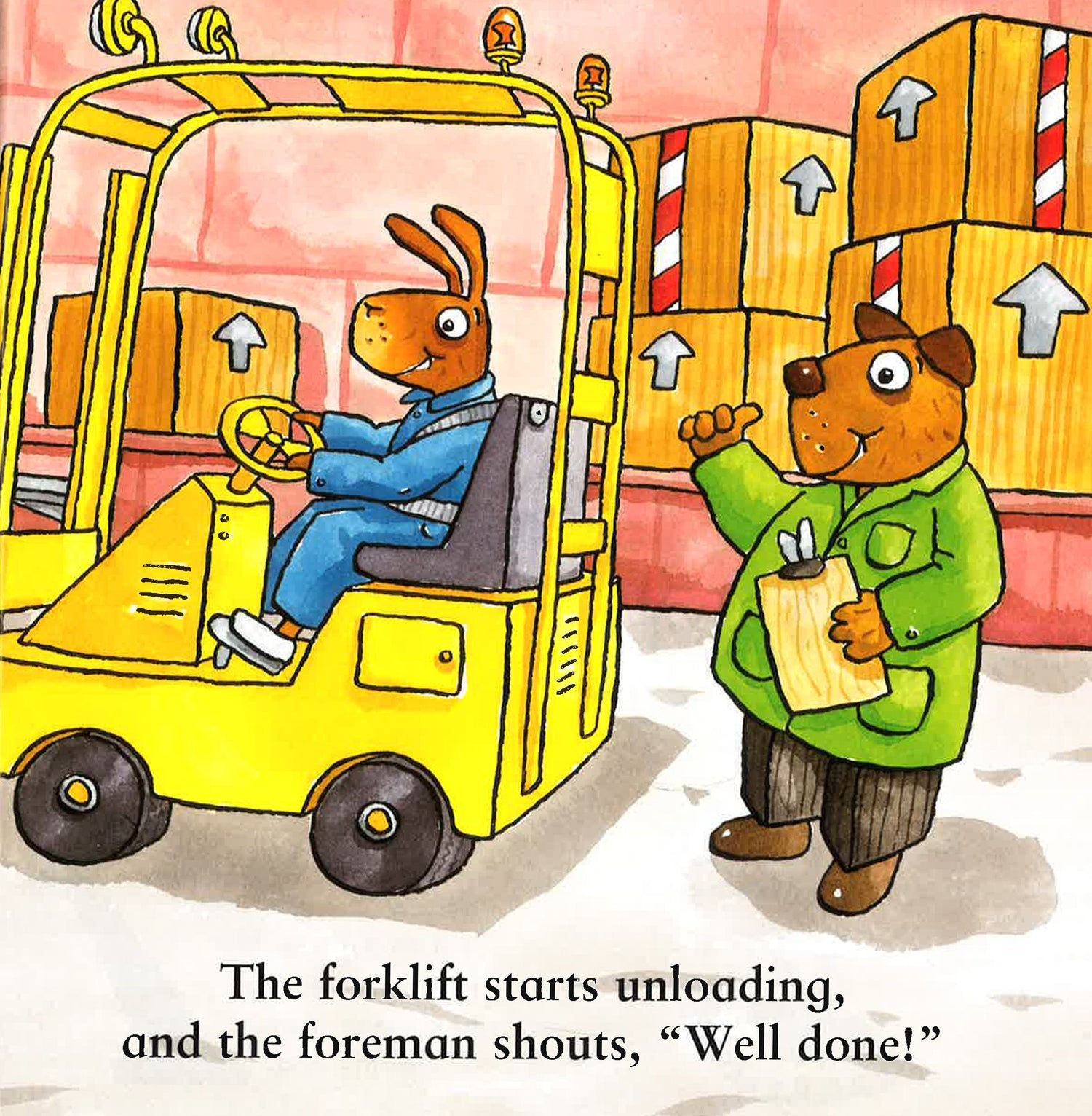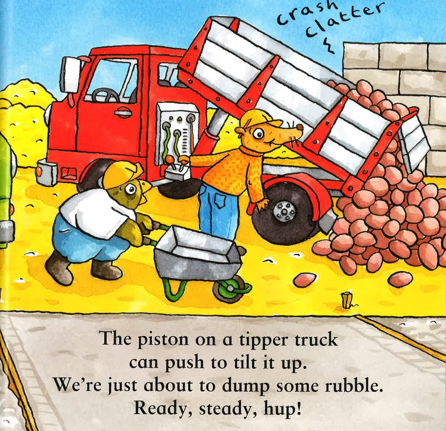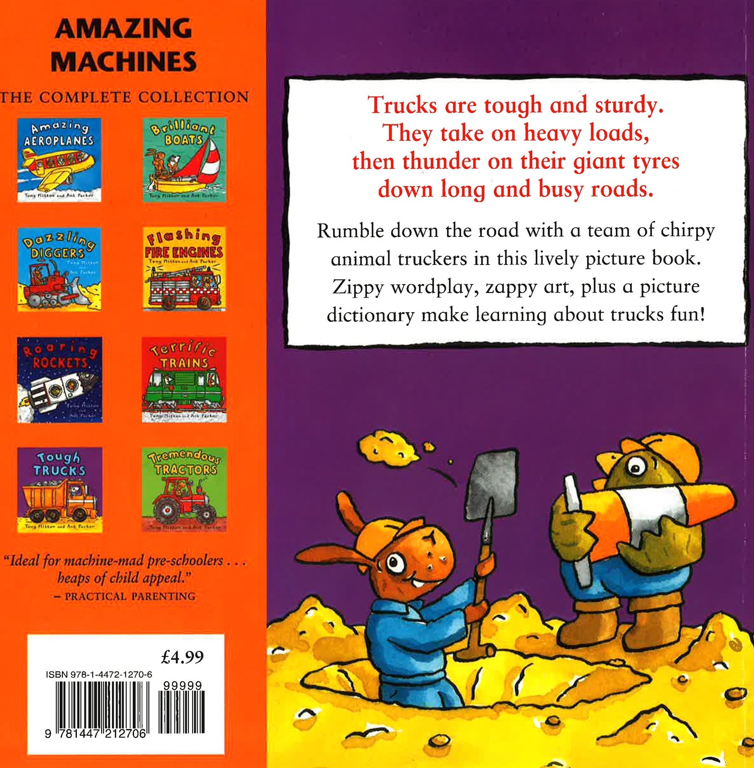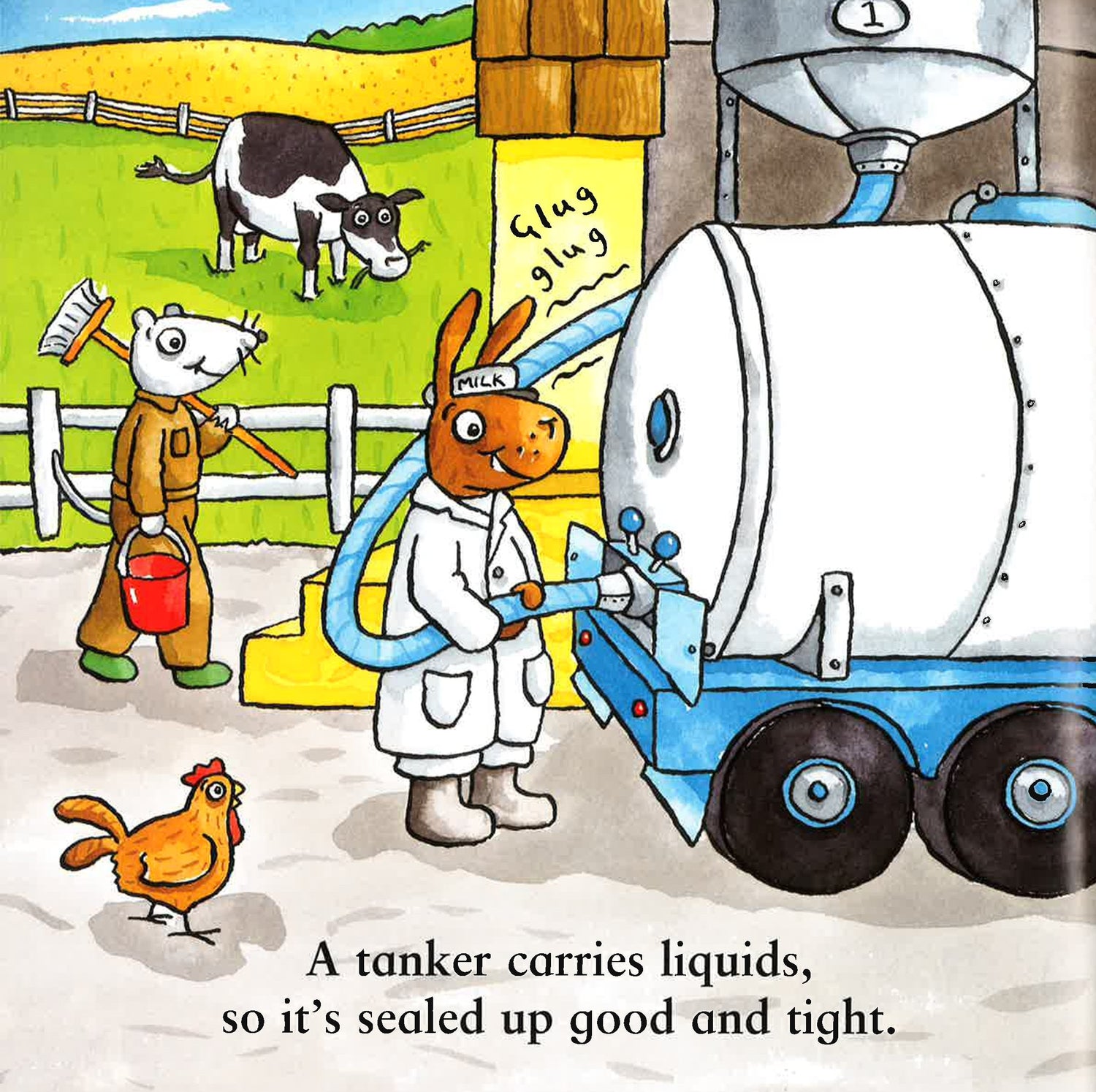 Trucks are tough and sturdy. They take on heavy loads, then thunder on their giant tyres down long and heavy roads. Rumble down the road with a team of chirpy animal truckers in this lively picture book. Zippy wordplay, zappy art, plus a picture dictionary make learning about trucks fun!