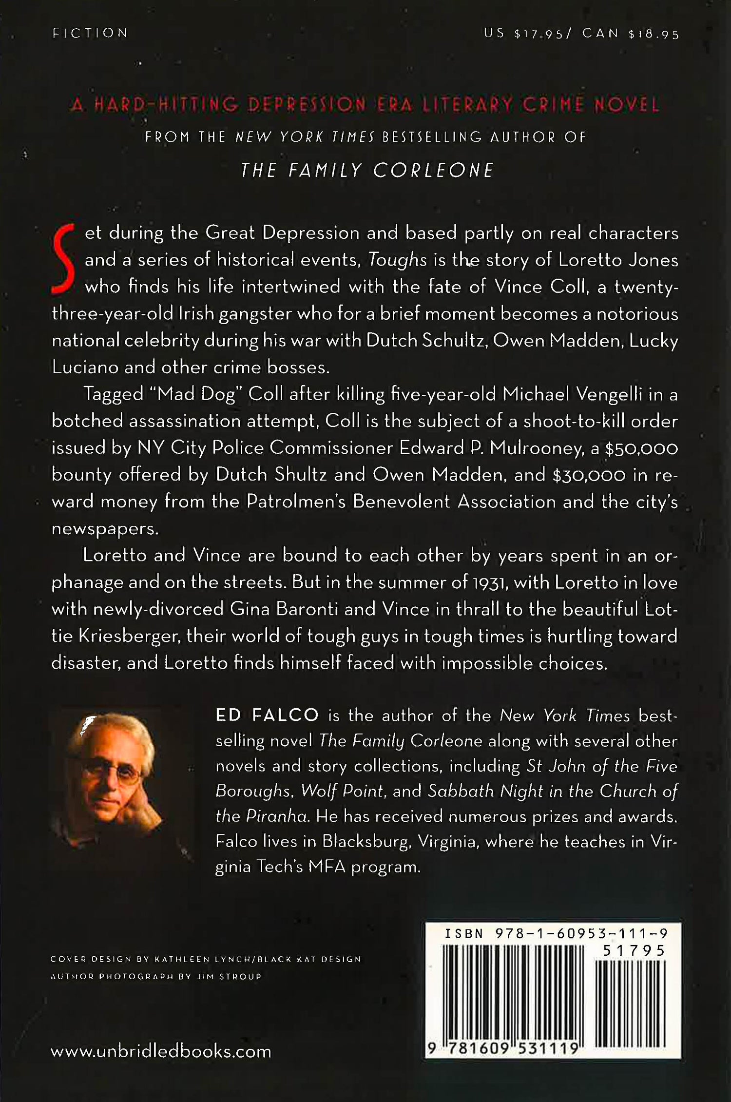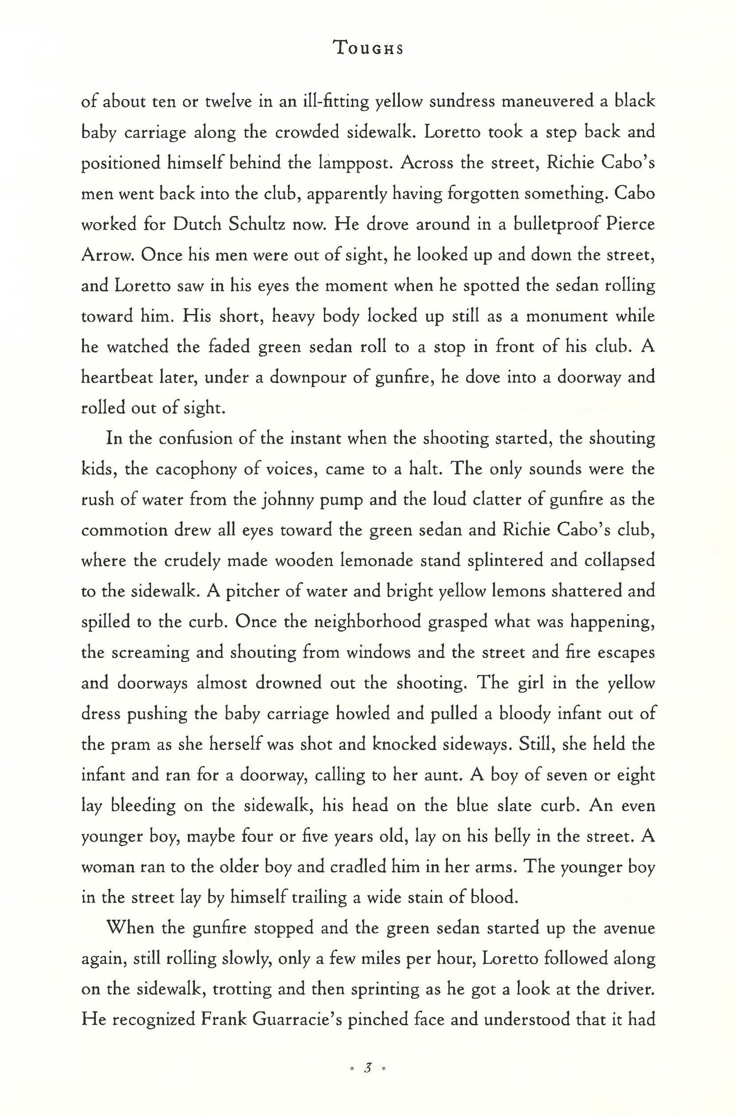 Set during the Great Depression and based in part on real characters and a series of historical events, Toughs follows the story of Loretto Jones as he finds his life intertwined with the fate of Vince Coll, a 23-year-old Irish gangster who for a brief moment rose to the level of a national celebrity during his war with Dutch Schultz, Owen Madden, and Lucky Luciano. Tagged "Mad Dog Coll" after killing five-year-old Michael Vengelli in a botched assassination attempt, Coll was the subject of a shoot-to-kill order issued by New York City Police Commissioner Edward P. Mulrooney, a $50,000 bounty offered by Dutch Shultz and Owen Madden, and $30,000 in reward money from by the Patrolmen's Benevolent Association and the city's newspapers. Loretto and Vince are bound to each other by years spent in an orphanage and on the streets, but in the summer of 1931, with Loretto in love with newly-divorced Gina Baronti, and Vince in thrall to the beautiful Lottie Kriesberger, their world of tough guys in tough times is hurtling toward disaster, and Loretto finds himself faced with impossible choices.
