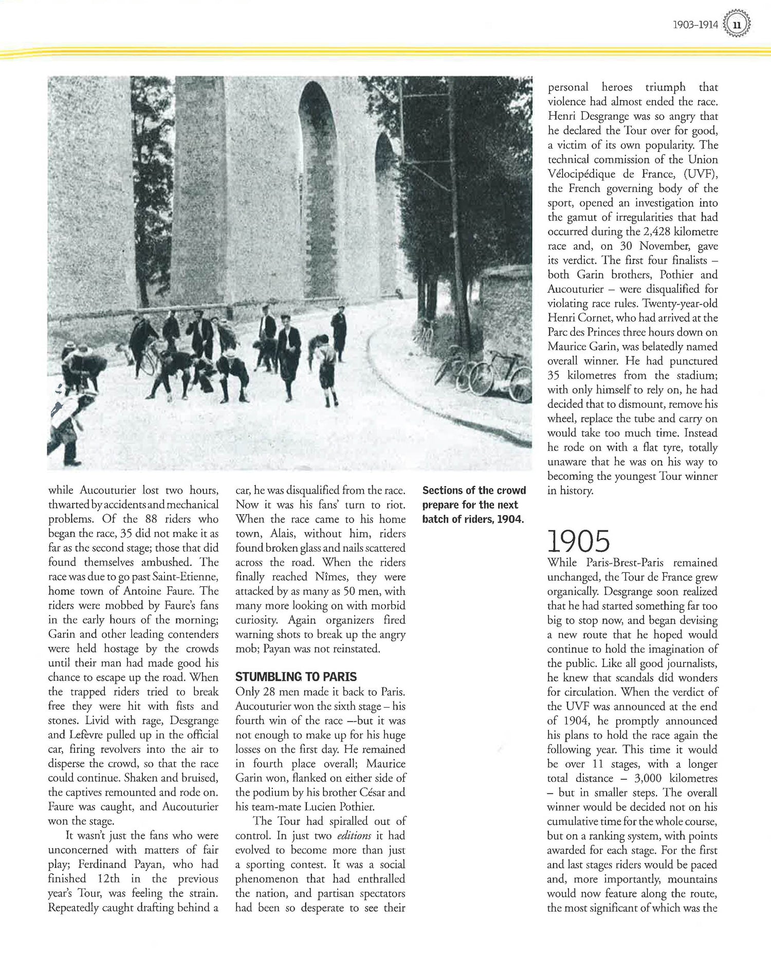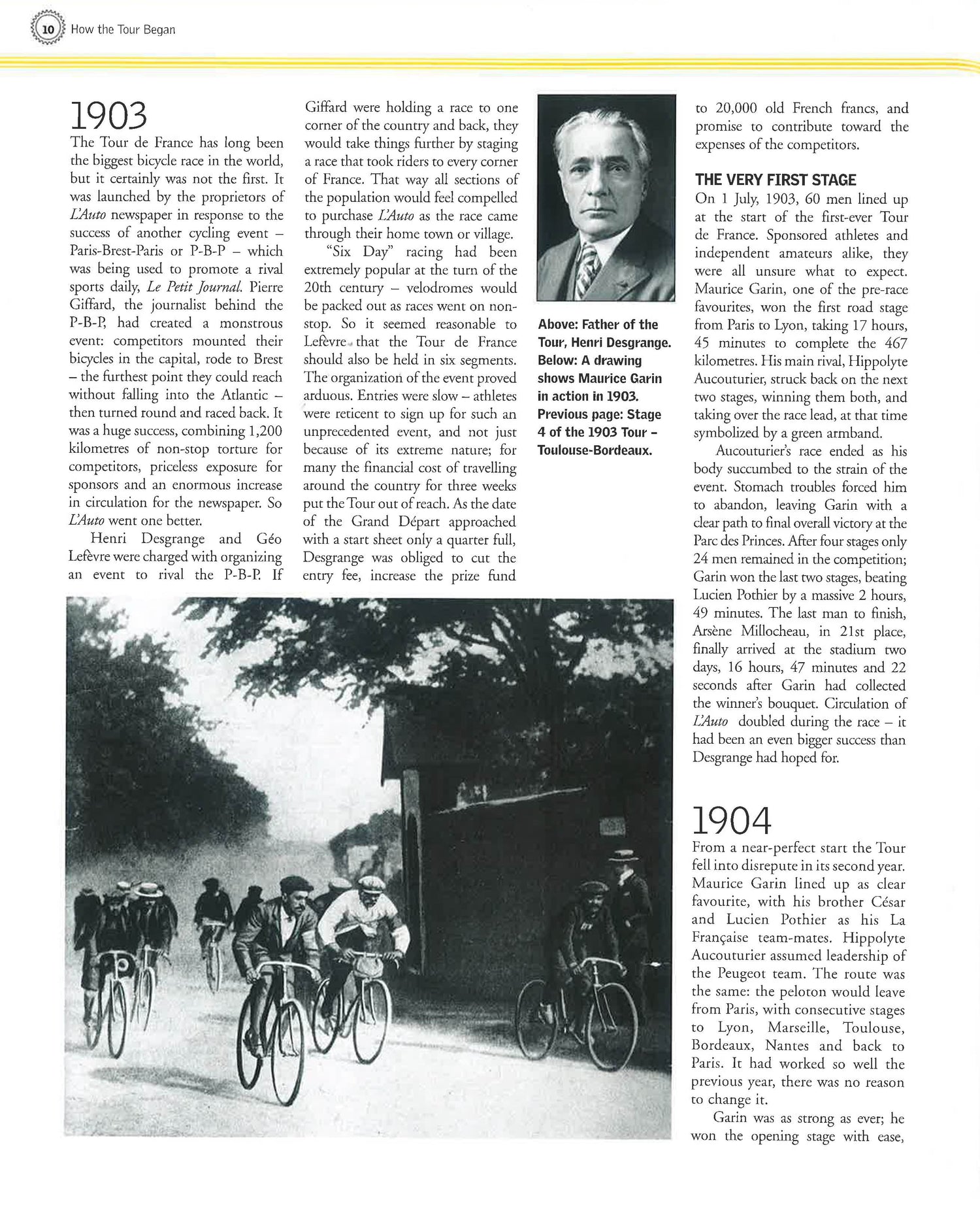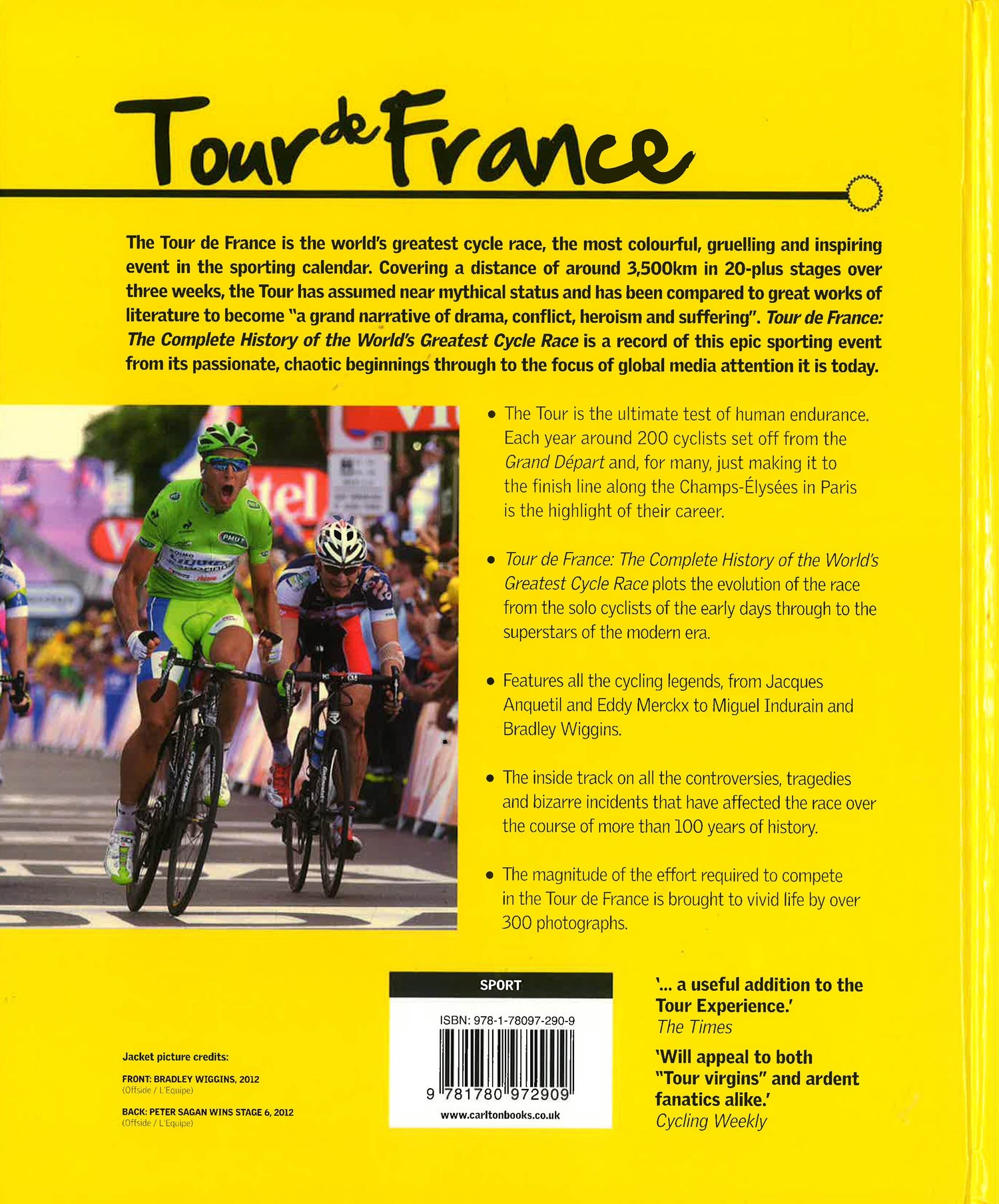Tour de France: The Complete History of the World's Greatest Cycle Race" plots the evolution of this great event, covering every Tour up to the milestone 100th running of the race in 2013. It features legends such as Jacques Anquetil, Eddie Merckx, Miguel Indurain, seven-time winner Lance Armstrong and the new generation of riders such as Alberto Contador and British heroes Bradley Wiggins and Mark Cavendish. Covering every aspect of the Tour from its beginnings and early heroes to its incredible feats of endurance and fierce rivalries, this is the complete history of one of the world's greatest sporting events.