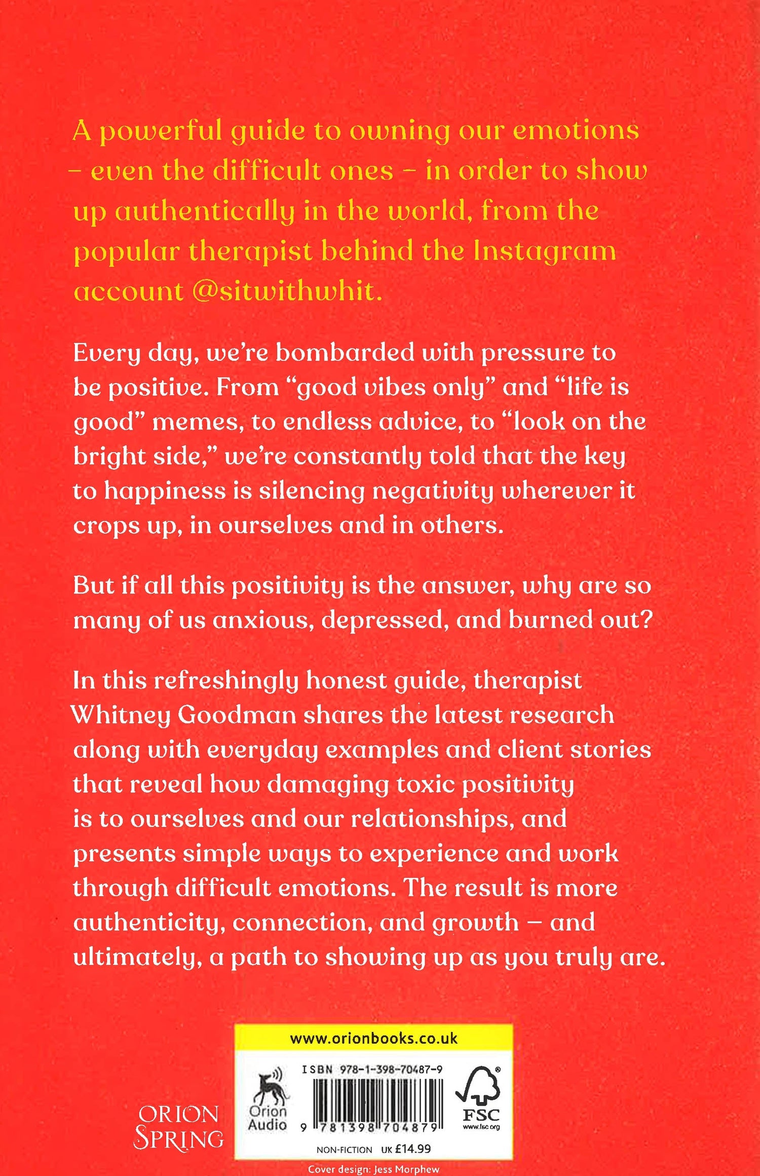 In this refreshingly honest guide, sought-after therapist Whitney Goodman shares the latest research along with everyday examples and client stories that reveal how damaging toxic positivity is to ourselves and our relationships, and presents simple ways to experience and work through difficult emotions. The result is more authenticity, connection, and growth - and ultimately, a path to showing up as you truly are.