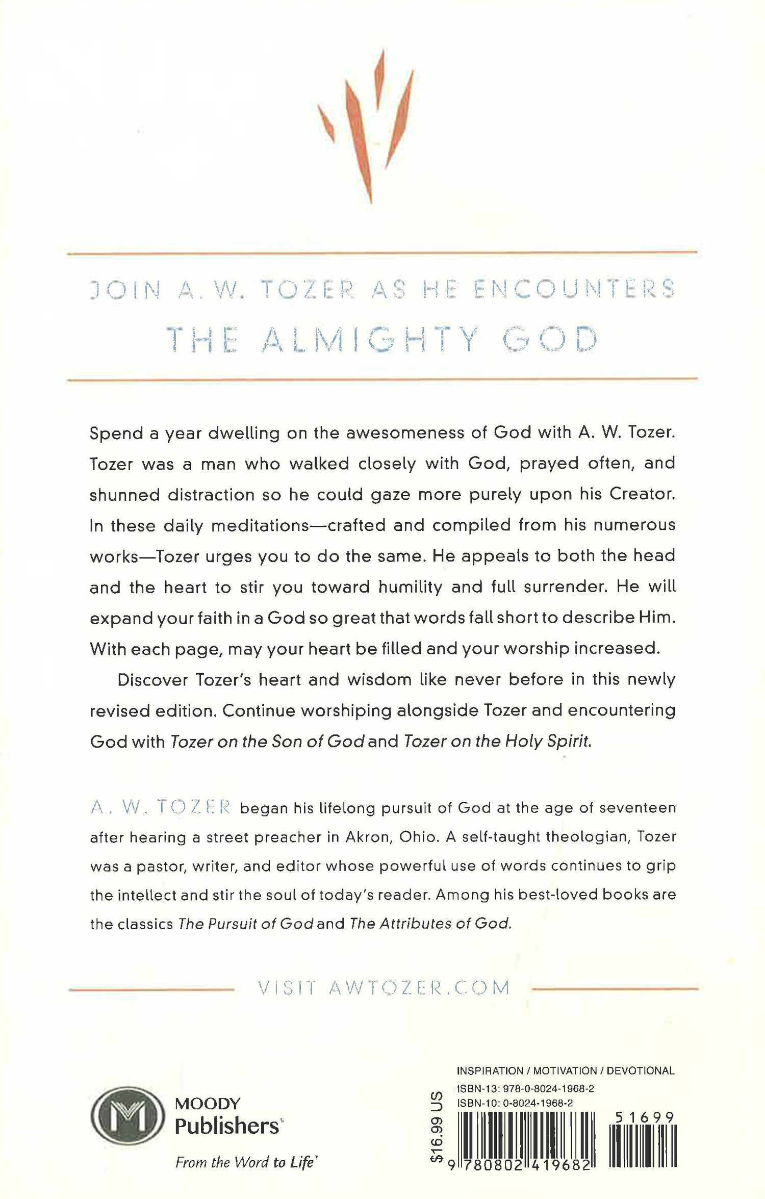 Encounter Tozer's heart and wisdom like never before in this newly revised edition. Continue worshipping alongside Tozer with the rest of his Trinitarian devotions: Tozer on the Son of God and Tozer on the Holy Spirit. With each page, may your heart be filled and your worship increased.