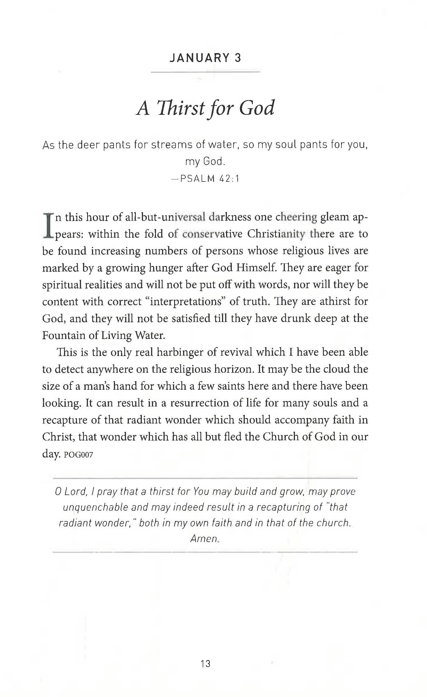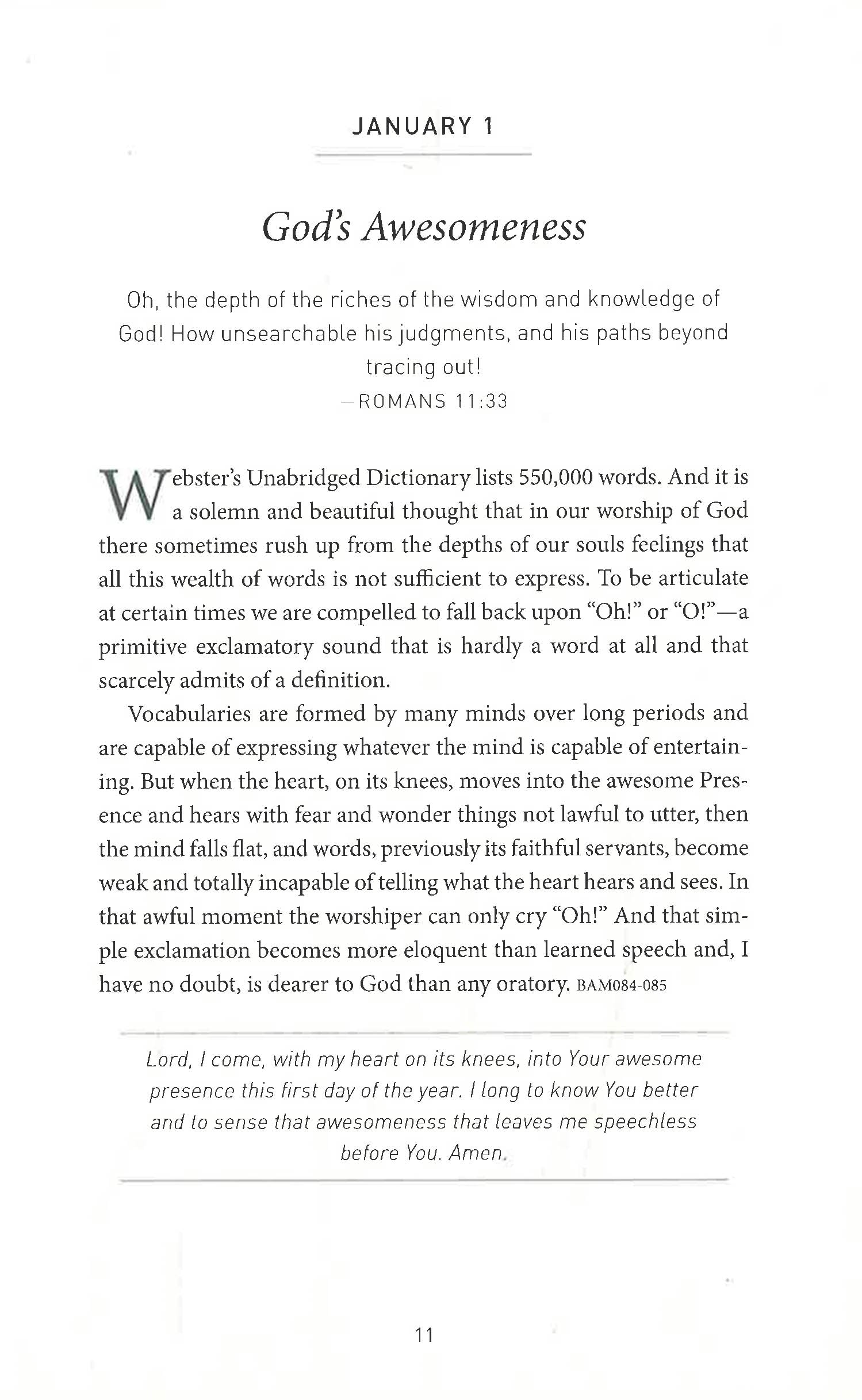 Spend a year dwelling on the awesomeness of God with A.W. Tozer. Tozer was a man who walked closely with God, who prayed often and shunned distraction so he could gaze more purely upon his Creator. In these daily meditations on Scripture, Tozer urges you to do the same. He will stir you toward humility and full surrender. He will expand your faith in a God so great that words fall short to describe Him. He will nourish you with truth.