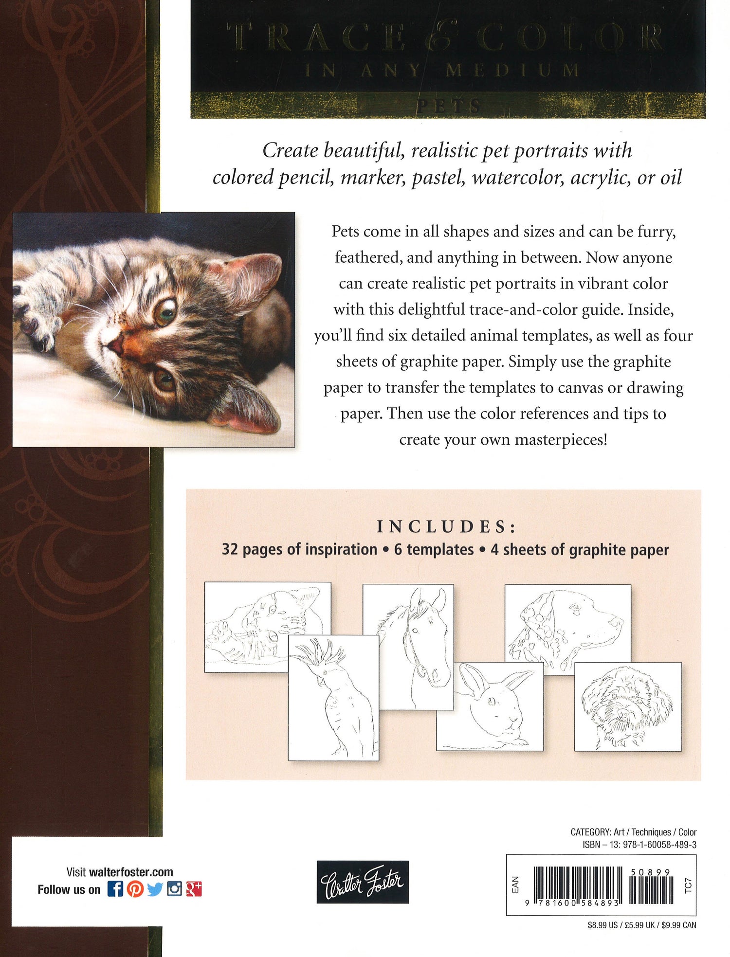 Pets come in all shapes and sizes and can be furry, feathered, and anything in between. Now anyone can discover how to create realistic pet portraits in vibrant color with this delightful trace-and-color guide. Inside, six detailed templates are provided to help the beginning artist get started with a line drawing that they can color or paint in the medium of their choice. Artists can simply transfer the template line drawings to paper or canvas with the included graphite paper. Then, using the color references and tips in the book, they can add color and create their own pet portrait masterpiece! The book includes 32 pages of instruction and inspiration, providing basic information about color theory, as well as an introduction to several different color mediums - colored pencil, oil, acrylic, watercolor, pastel, and marker. The overview for each medium covers the essential tools and materials an artist may need, including what types of paper or canvas can be used and any other special materials, as well as how to use various techniques to achieve effects. With a variety of animals and settings, art enthusiasts will find everything they need to create their own lifelike portraits. Includes six removable templates featuring detailed pet artwork and four reusable sheets of graphite paper for transferring.