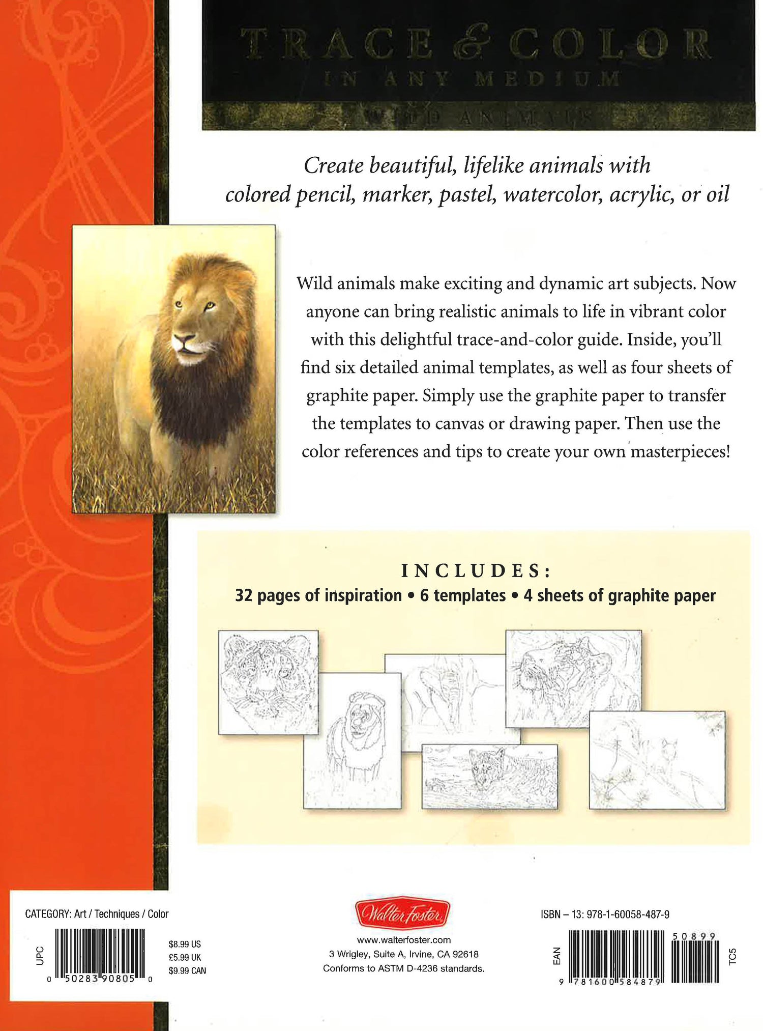 Wild animals make exciting and dynamic art subjects. Now anyone can bring realistic animals to life in vibrant color with this delightful trace-and-color guide. Inside, six detailed templates are provided to help the beginning artist get started with a line drawing that they can color or paint in the medium of their choice. Artists can simply transfer the template line drawings to paper or canvas with the included graphite paper. Then, using the color references and tips in the book, they can add color and create their own wild animal masterpiece! The book includes 32 pages of instruction and inspiration, providing basic information about color theory, as well as an introduction to several different color mediums - colored pencil, oil, acrylic, watercolor, pastel, and marker.