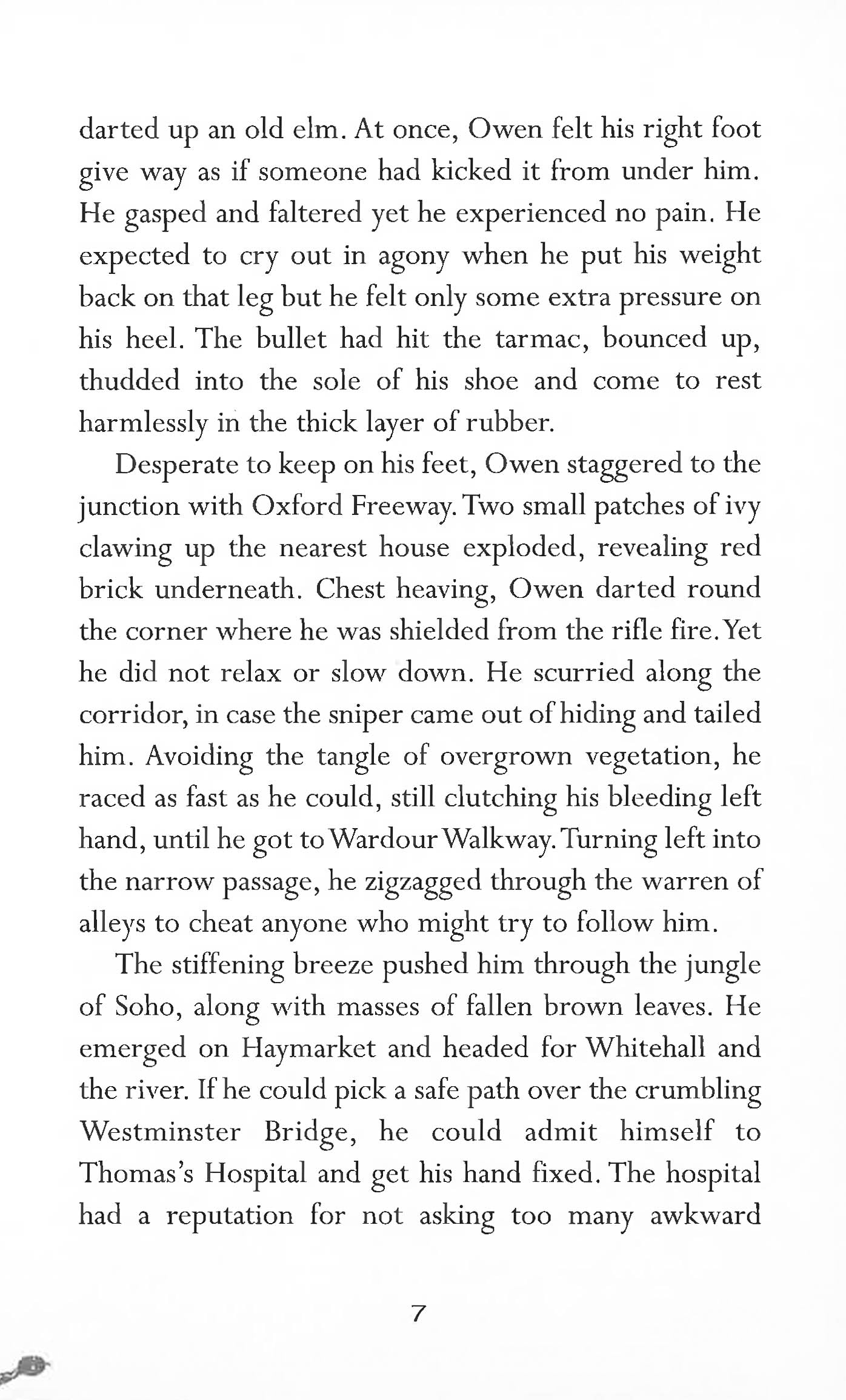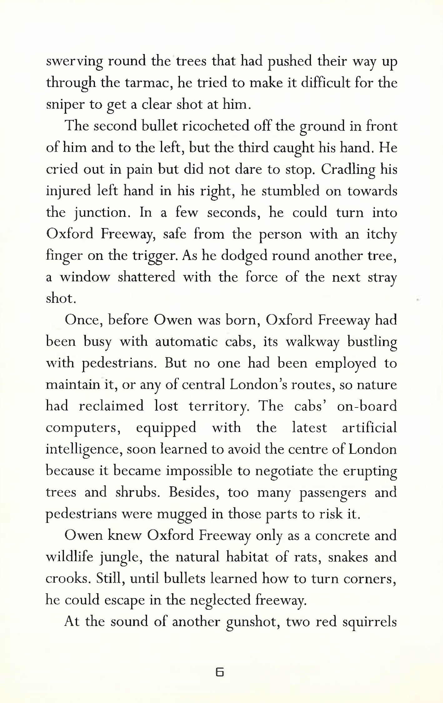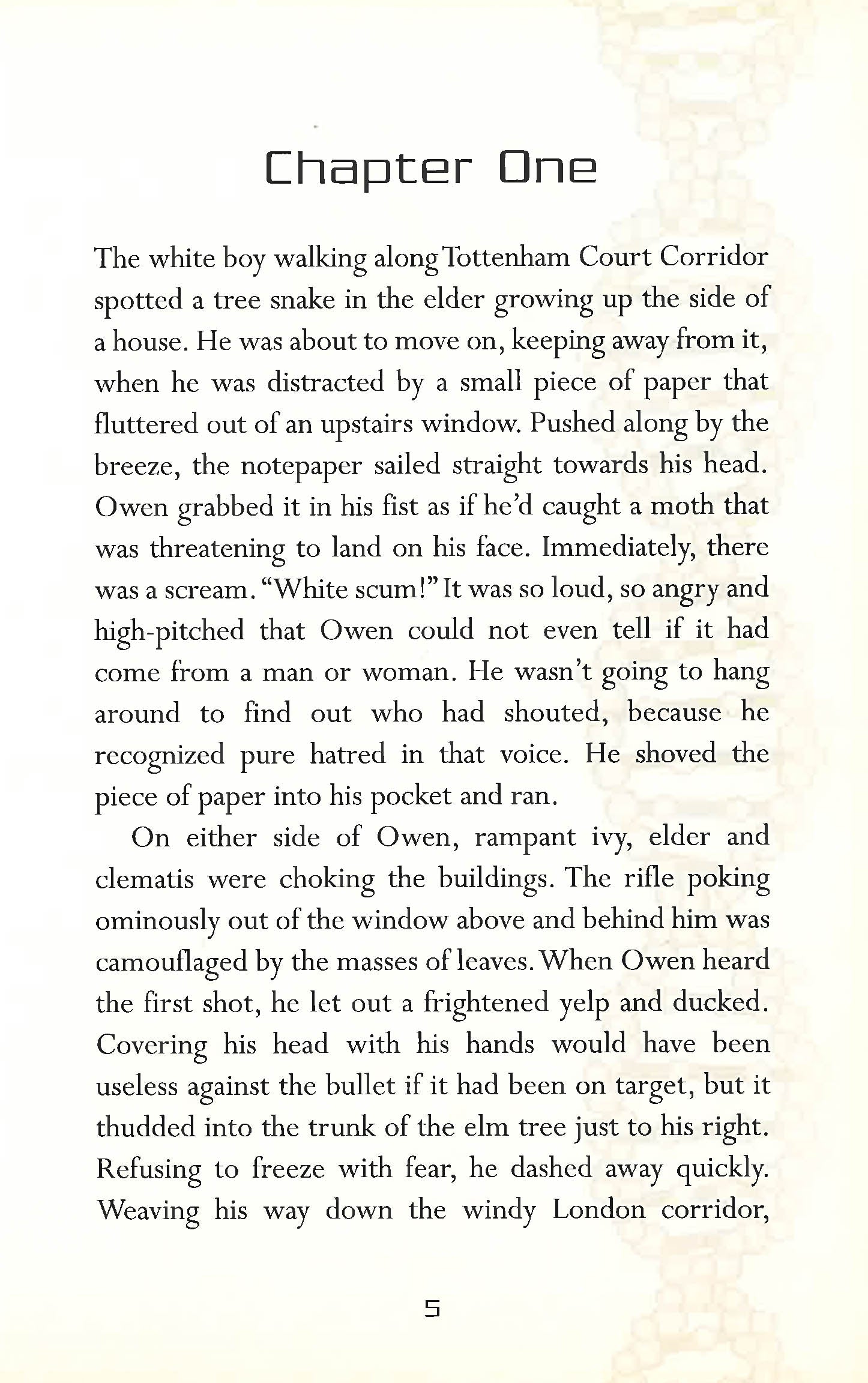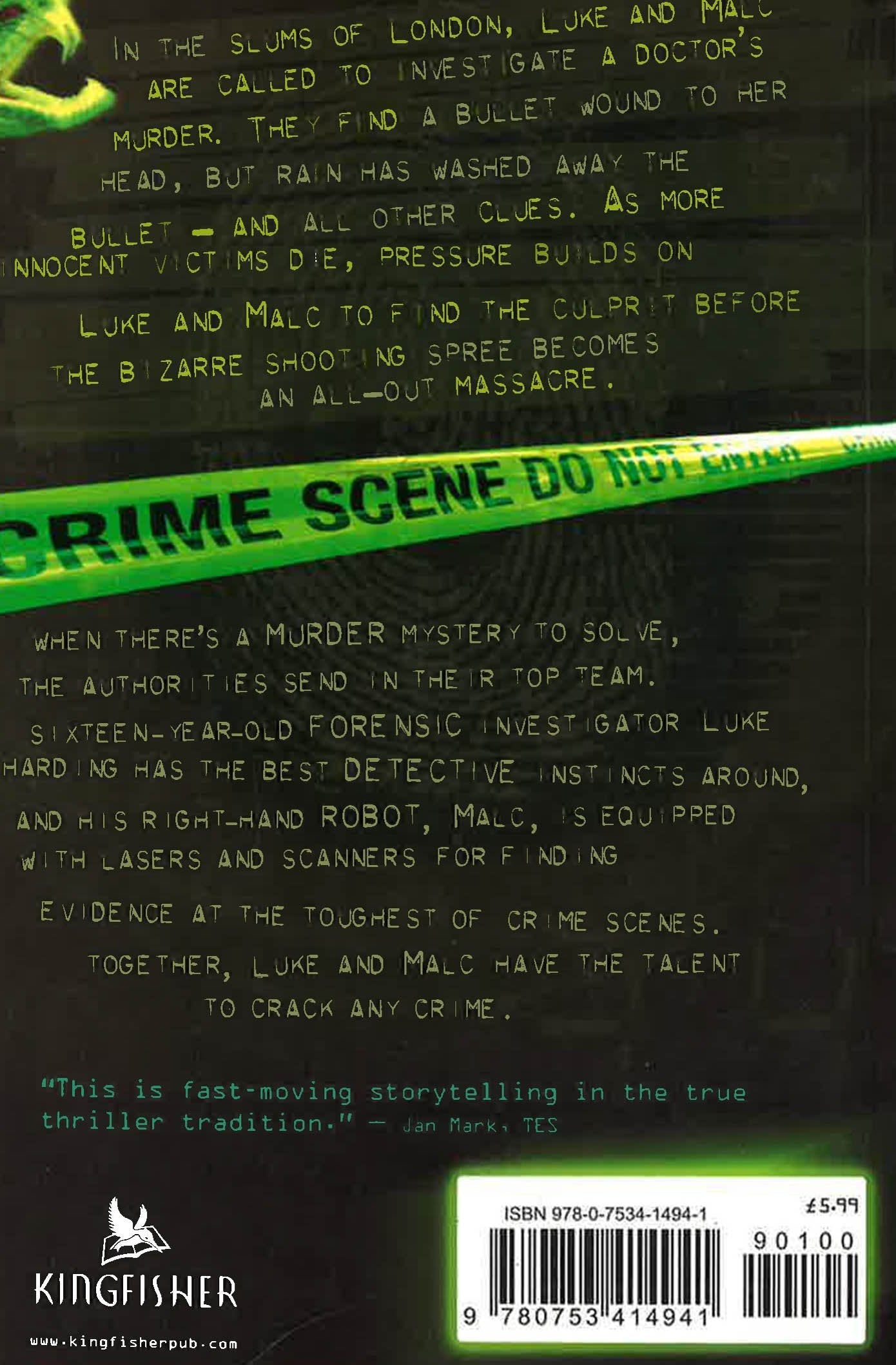 In the slums of London, Luke and Malc investigate a doctor's murder. They find a bullet wound to her head, but rain has washed away the bullet - and all other clues. As more innocent victims die, pressure builds on Luke and Malc to find the culprit before the bizarre shooting spree becomes an all-out massacre. Imagine a place where technology rules...where London is a slum and the North is a cultural capital...where from the age of five, the authorities decide your future. In this fascinating parallel world, quick-thinking Luke Harding is the youngest Forensic Investigator ever, aged just 16. Luke and his right-hand robot, Malc, make a top team. Together, they have the talent to crack any crime - and a good joke, too. Doctor Anna Suleman is ruthlessly shot dead leaving work one evening. Luke and Malc are put on the case by The Authorities. Luke discovers Owen Goode was shot at too, nearby, at a similar time. Teenage runaway Goode shows Luke the pamphlet that fell from the high-rise window of the person who shot at him. It gives details of a religious cult called the Visionaries. The cult disapproves of doctors and pairing committees as they believe they interfere with god's chosen path for humans. Luke suspects the unhinged Ethan Roach, leader of the Visionaries, who uses snakes for Luke's scary initiation ceremony into the cult. Luke's other suspects include Dr Coppard who is Anna's partner (she had been having an affair) and Alex Foxton, Anna's boss, was against her illicit work with conjoined twins. Then another doctor and a pairing committee are murdered. Luke feels he has many leads but is getting nowhere. Out of the blue Luke and Malc suffer a violent attack in a lift shaft. Malc is obliterated but with painstaking work is rebuilt. He just managed to catch a picture of the killer - Reece Morgan, receptionist at Luke's hotel and covert Visionaries member. He had attended services in disguise so Luke never recognised him. Despite Luke and Malc thinking they were getting nowhere it was their actual extreme proximity that made Morgan attack Luke and Malc and thus reveal himself. The case is solved.