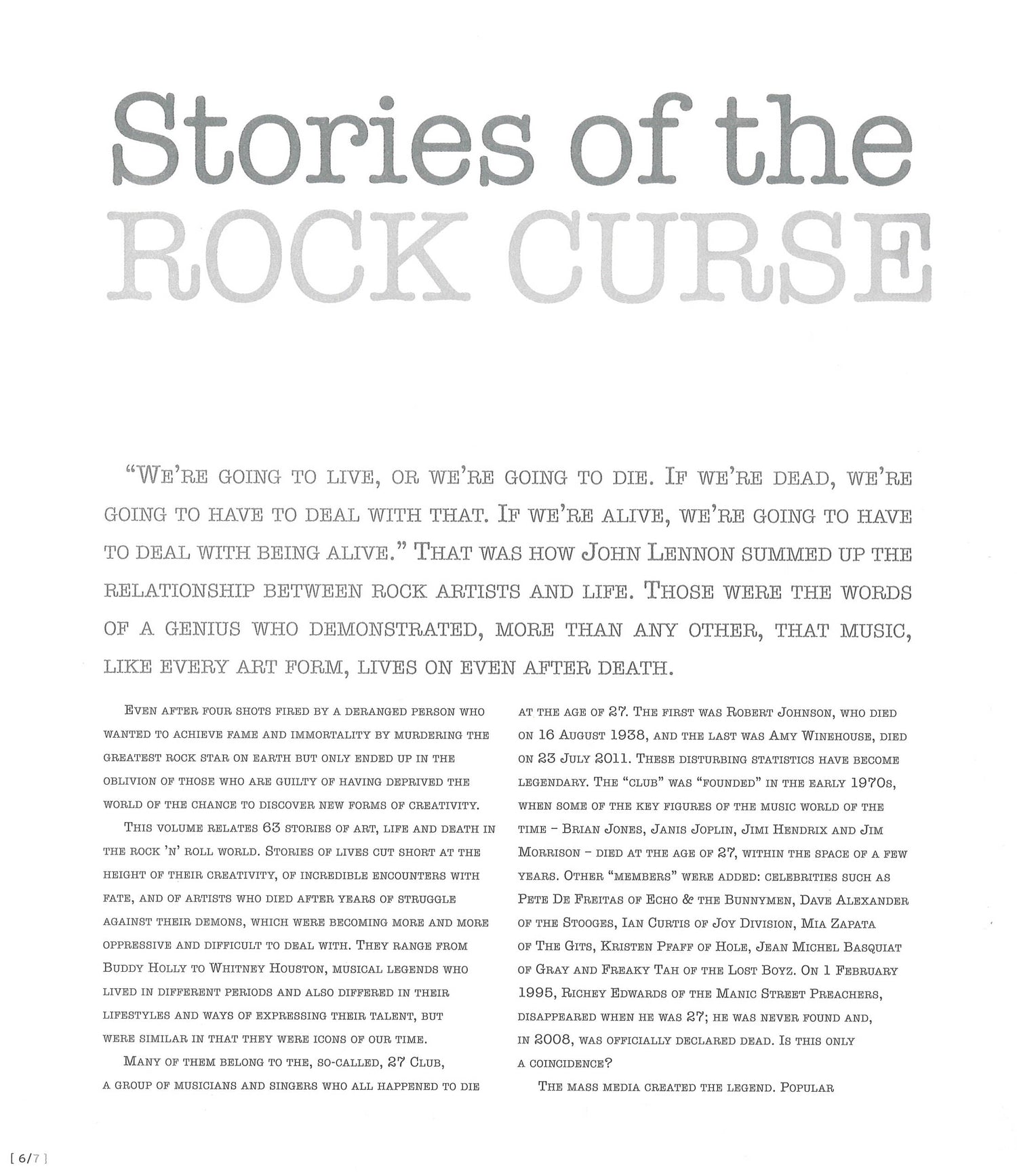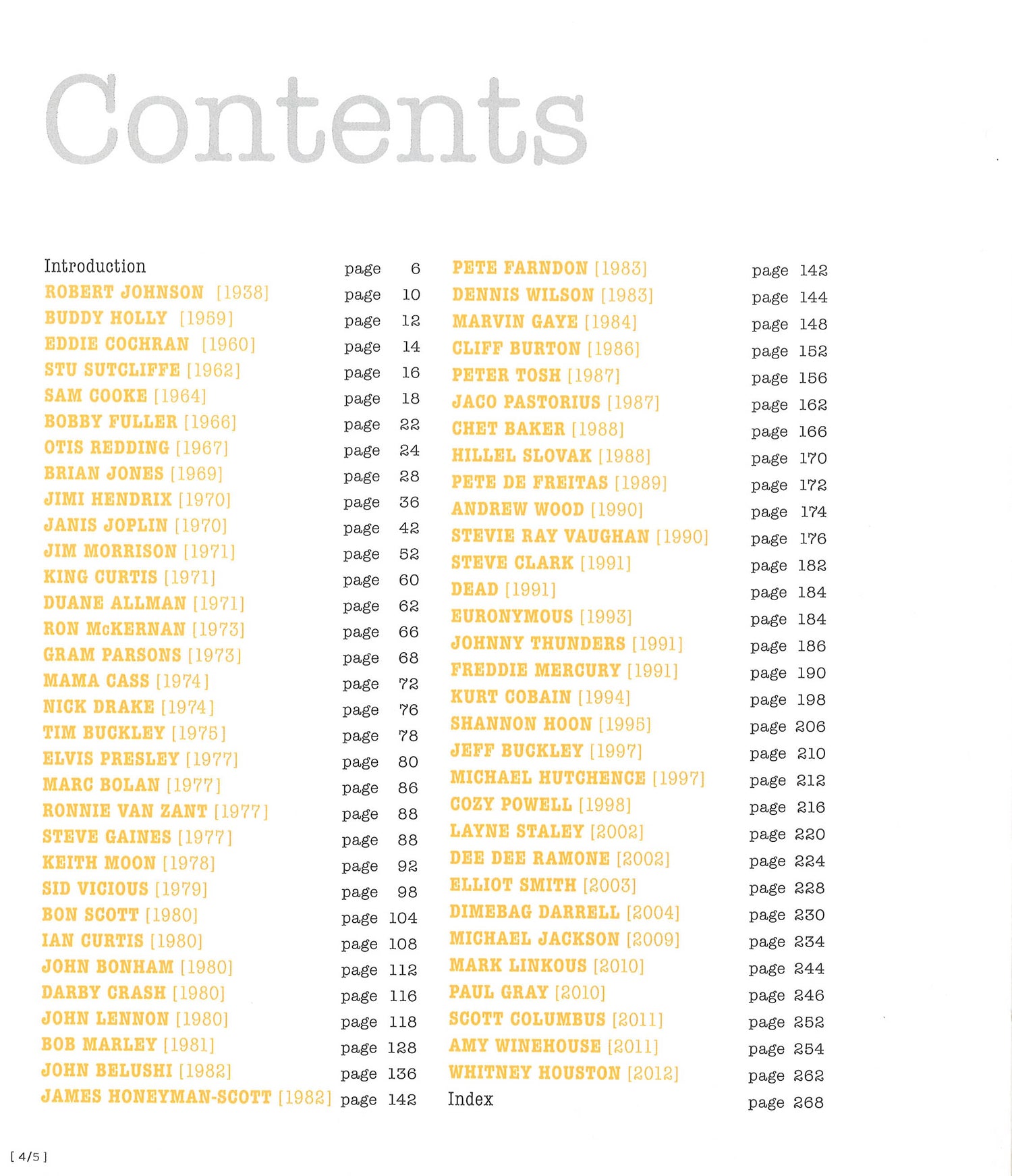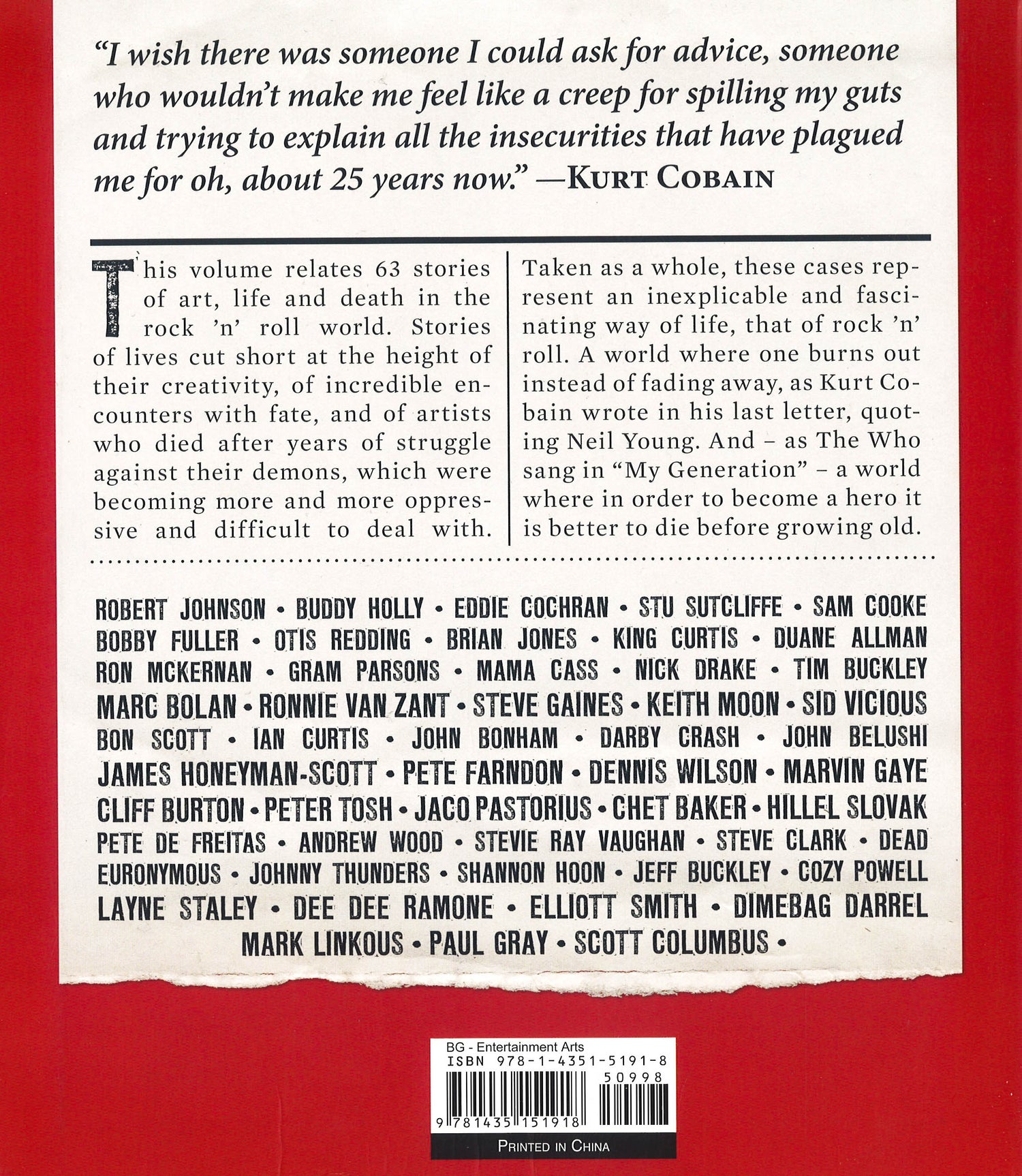 "I wish there was someone I could ask for advice, someone who wouldn't make me feel like a creep for spilling my guts and trying to explain all the insecurities that have plagued me for oh, about 25 years now." -Kurt Cobain This volume relates 63 stories of art, life and death in the rock 'n' roll world. Stories of lives cut short at the height of their creativity, of incredible encounters with fate, and of artists who died after years of struggle against their demons, which were becoming more and more oppressive and difficult to deal with. Taken as a whole, these cases represent an inexplicable and fascinating way of life, that of rock 'n' roll. A world where one burns out instead of fading away, as Kurt Cobain wrote in his last letter, quoting Neil Young. And - as The Who sang in "My Generation" - a world where in order to become a hero it is better to die before growing old. ROBERT JOHNSON BUDDY HOLLY EDDIE COCHRAN STU SUTCLIFFE SAM COOKE BOBBY FULLER OTIS REDDING BRIAN JONES KING CURTIS DUANE ALLMAN RON MCKERNAN GRAM PARSONS MAMA CASS NICK DRAKE TIM BUCKLEY MARCBOLAN RONNIE VAN ZANT STEVE GAINES KEITH MOON SID VICIOUS BON SCOTT IAN CURTIS JOHN BONHAM DARBY CRASH JOHN BELUSHI JAMESHONEYMAN-SCOTT PETE FARNDON DENNIS WILSON MARVIN GAYE CLIFFBURTON PETER TOSH JACO PASTORIUS CHET BAKER HILLEL SLOVAK PETE DE FREITAS ANDREW WOOD STEVIE RAY VAUGHAN STEVE CLARK DEAD EURONYMOUS JOHNNY THUNDERS SHANNON HOON JEFF BUCKLEY COZY POWELL LAYNE STALEY DEE DEE RAMONE ELLIOTT SMITH DIMEBAG DARREL MARKLINKOUS PAUL GRAY SCOTT COLUMBUS