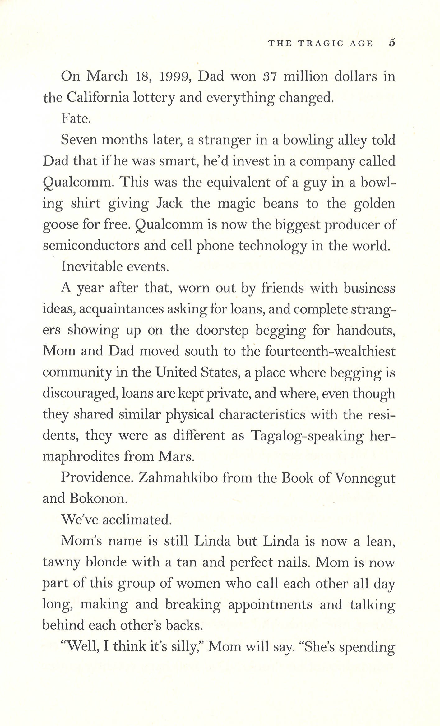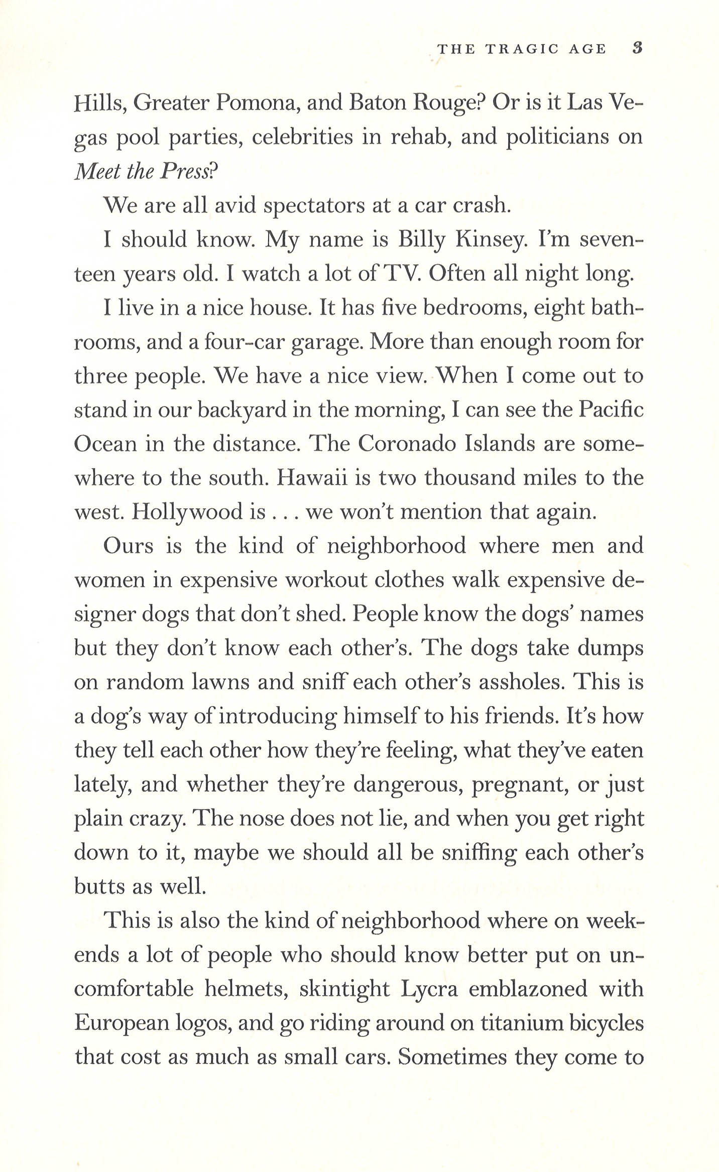 This is the story of Billy Kinsey, heir to a lottery fortune, part genius, part philosopher and social critic, full time insomniac and closeted rock drummer. Billy has decided that the best way to deal with an absurd world is to stay away from it. Do not volunteer. Do not join in. Billy will be the first to tell you it doesn't always work - not when your twin sister, Dorie, has died, not when you're unhappy parents are at war with one another, not when frazzled soccer moms in two ton SUVs are more dangerous than atom bombs, and not when your guidance counsellor keeps asking why you haven't applied to college. Billy's life changes when two people enter his life. Twom Twomey is a charismatic renegade who believes that truly living means going a little outlaw. Twom and Billy become one another's mutual benefactor and friend. At the same time, Billy is reintroduced to Gretchen Quinn, an old and adored friend of Dorie's. It is Gretchen who suggests to Billy that the world can be transformed by creative acts of the soul. With Twom, Billy visits the dark side. And with Gretchen, Billy experiences possibilities.