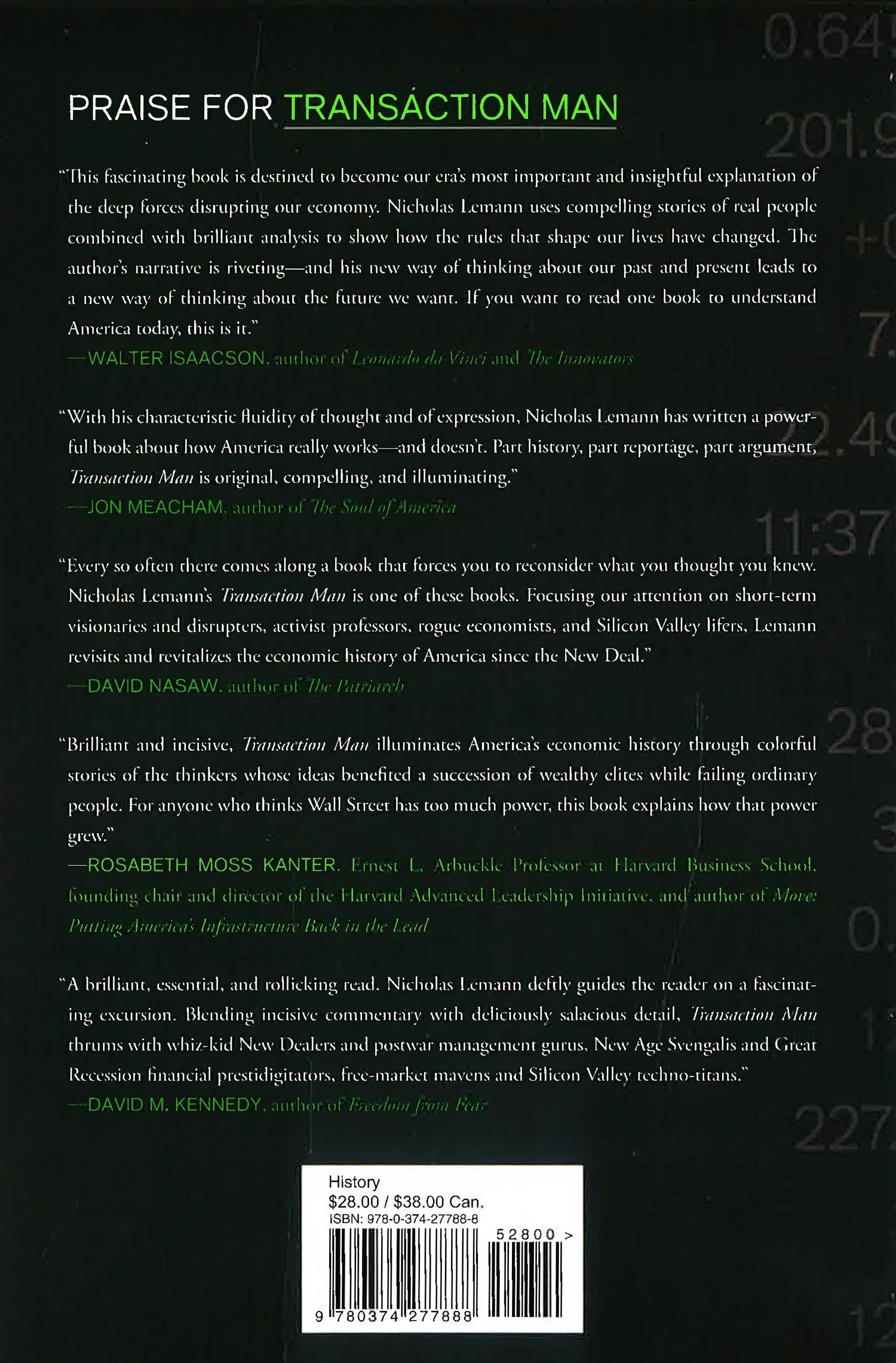 Lemann interweaves these fresh and vivid profiles with a history of the Morgan Stanley investment bank from the 1930s through the financial crisis of 2008, while also tracking the rise and fall of a working-class Chicago neighborhood and the family-run car dealerships at its heart. Incisive and sweeping, Transaction Man is the definitive account of the reengineering of America and the enormous impact it has had on us all.