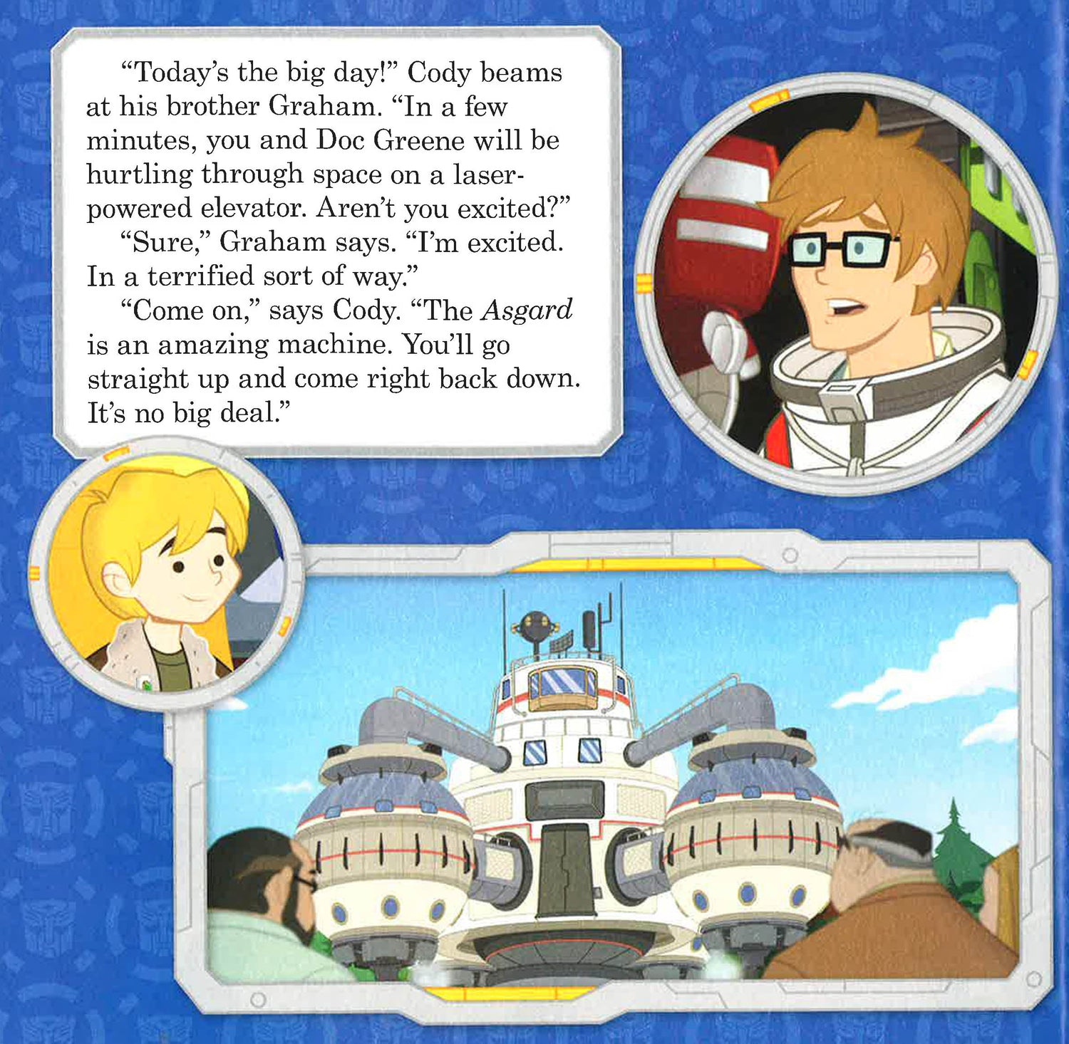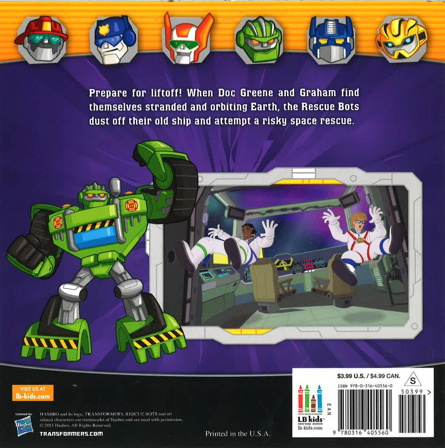When Doc Greene and Graham find themselves stranded, orbiting the Earth, the Rescue Bots dust off their old ship and attempt a risky space rescue. Can the Bots work together in zero-gravity? (c) 2015 Hasbro. All Rights Reserved.