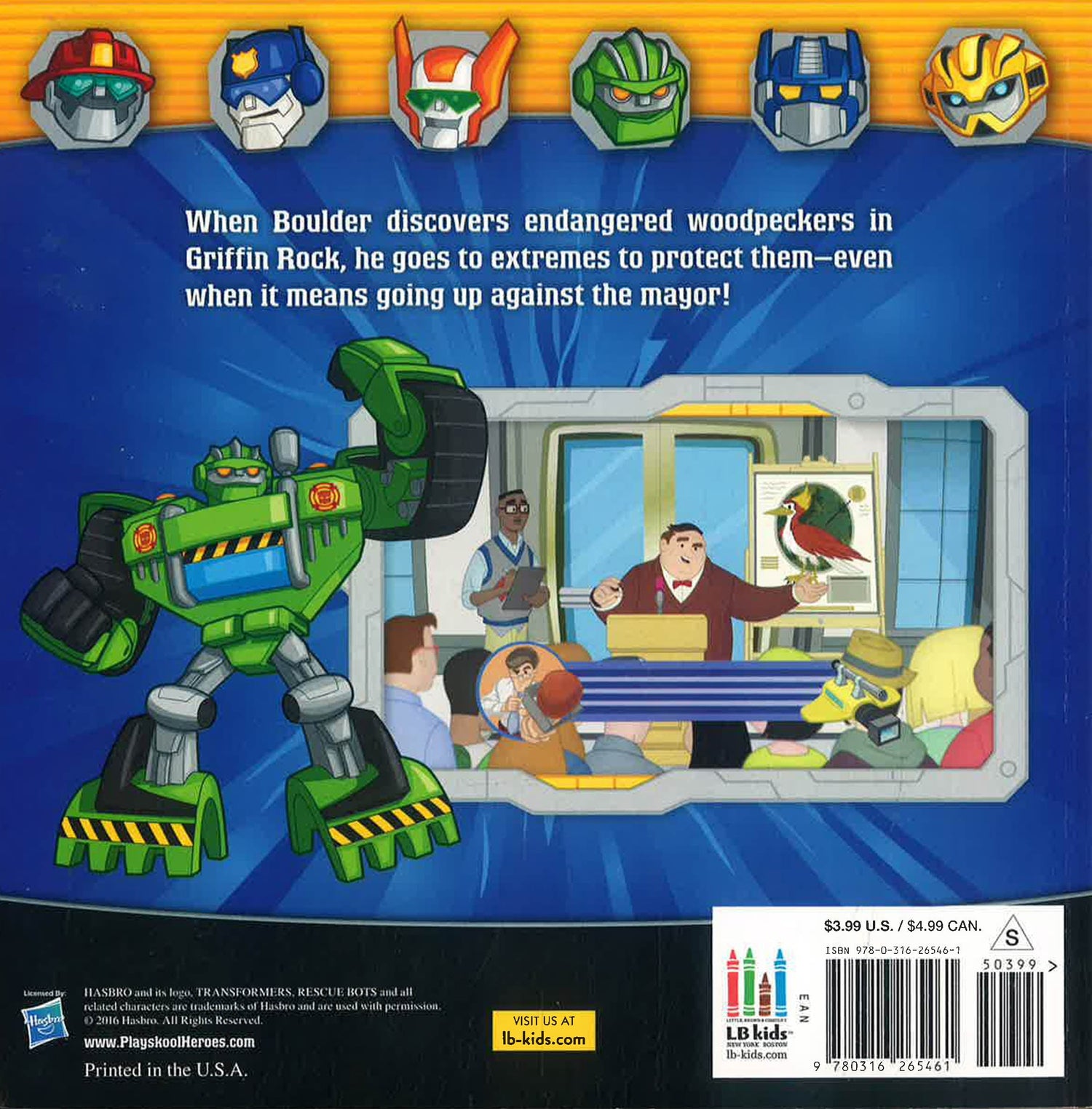 Of all the Rescue Bots, it's Boulder who has the kindest heart. So when he discovers an endangered species of woodpeckers living in Griffin Rock, he goes to extremes to protect them-even when it means going up against the mayor!