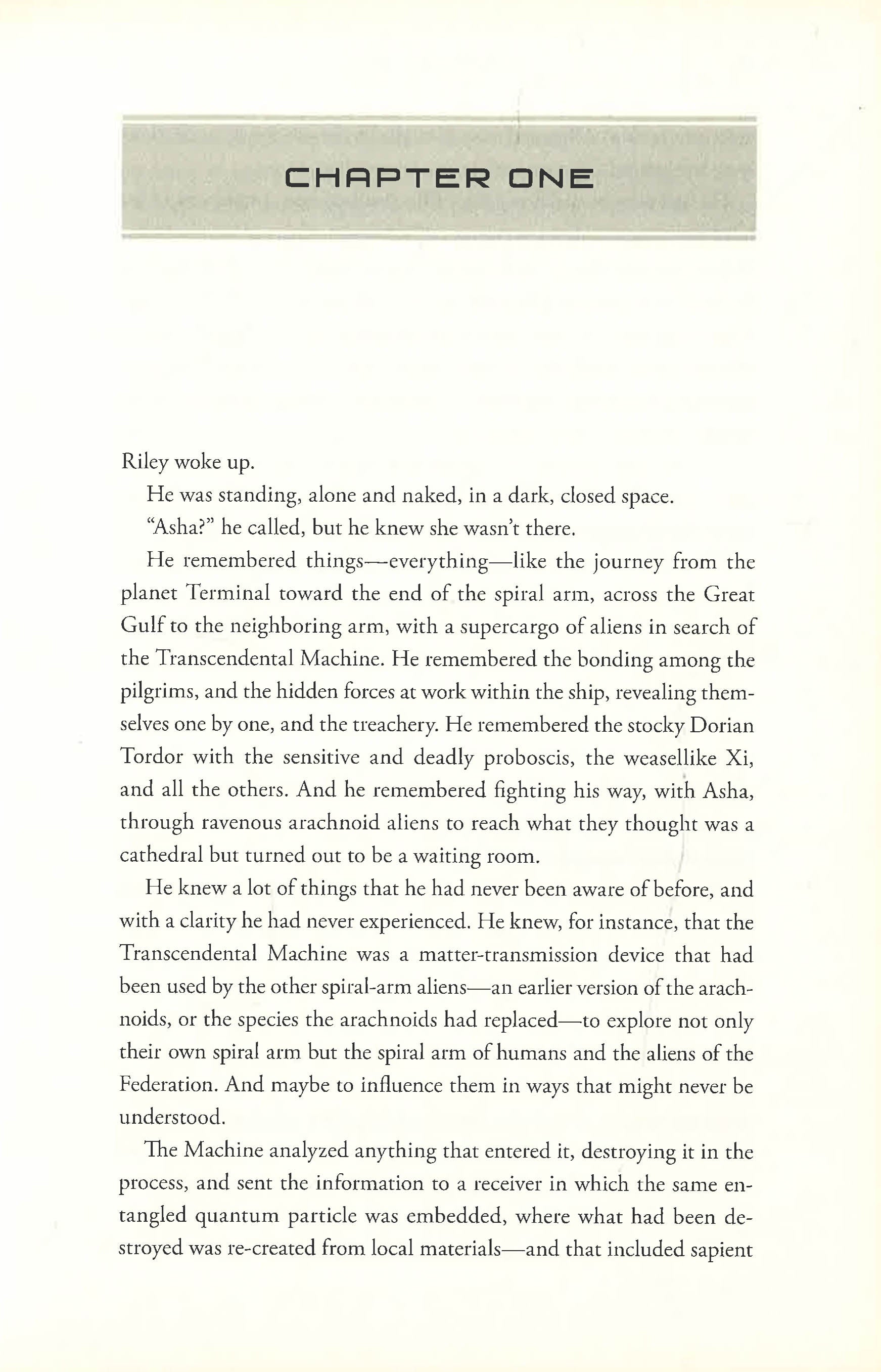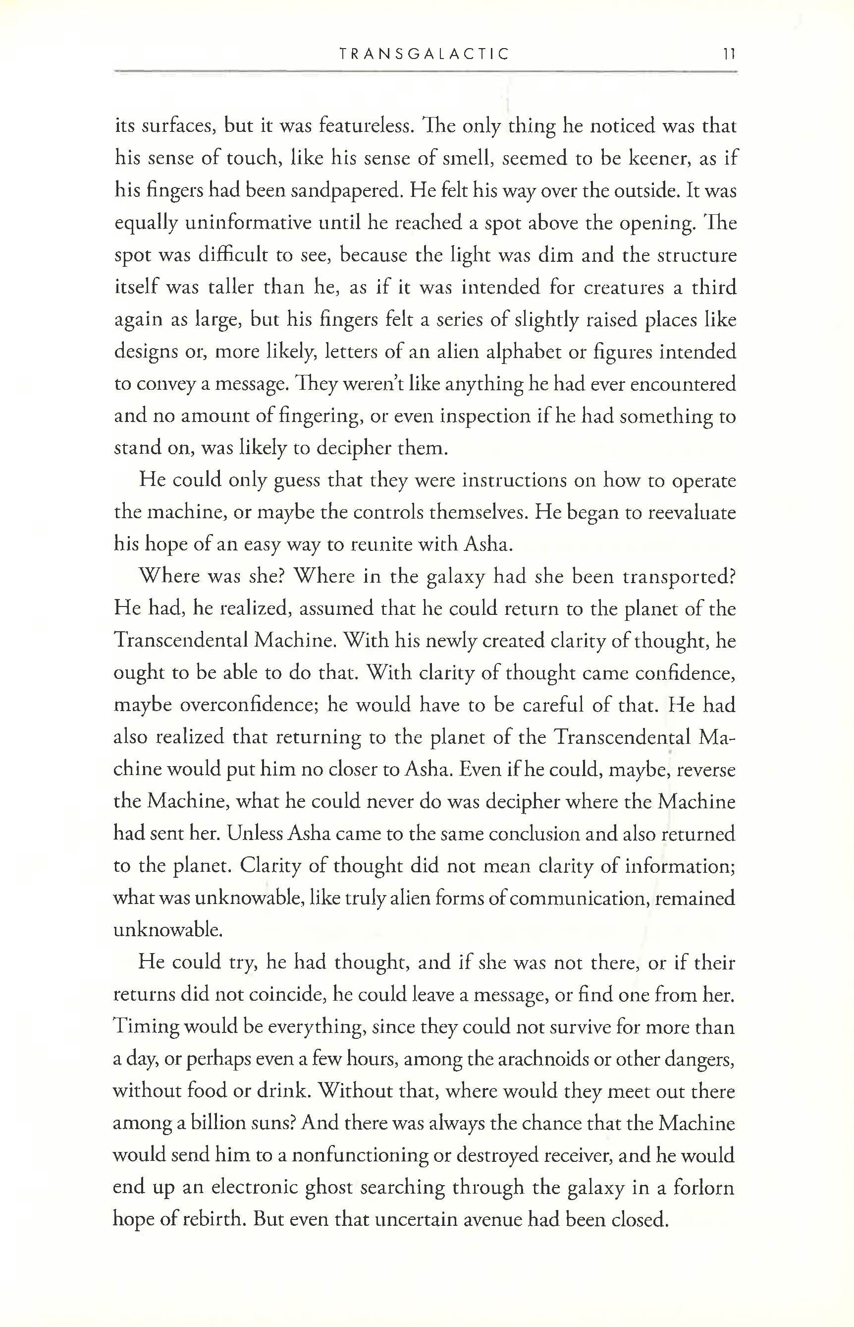 When Riley and Asha finally reached the planet Terminal and found the Transcendental Machine, a matter transmission device built by an ancient race, they chose to be "translated." Now in possession of intellectual and physical powers that set them above human limitations, the machine has transported them to two, separate, unknown planets among a possibility of billions. Riley and Asha know that together they can change the galaxy, so they attempt to do the impossible - find each other.