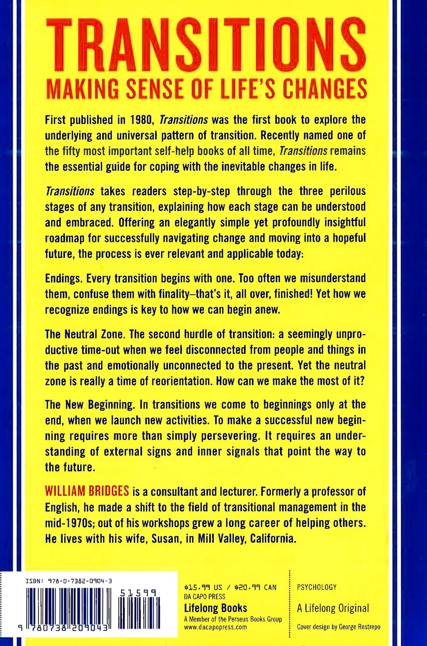 Whether it is chosen or thrust upon you, change brings both opportunities and turmoil. Since first published 25 years ago, Transitions has helped hundreds of thousands of readers cope with these issues by providing an elegantly simple yet profoundly insightful roadmap of the transition process. With the understanding born of both personal and professional experience, William Bridges takes readers step by step through the three stages of any transition: The Ending, The Neutral Zone, and, in time, The New Beginning. Bridges explains how each stage can be understood and embraced, leading to meaningful and productive movement into a hopeful future. With a new introduction highlighting how the advice in the book continues to apply and is perhaps even more relevant today, and a new chapter devoted to change in the workplace, Transitions will remain the essential guide for coping with the one constant in life: change.