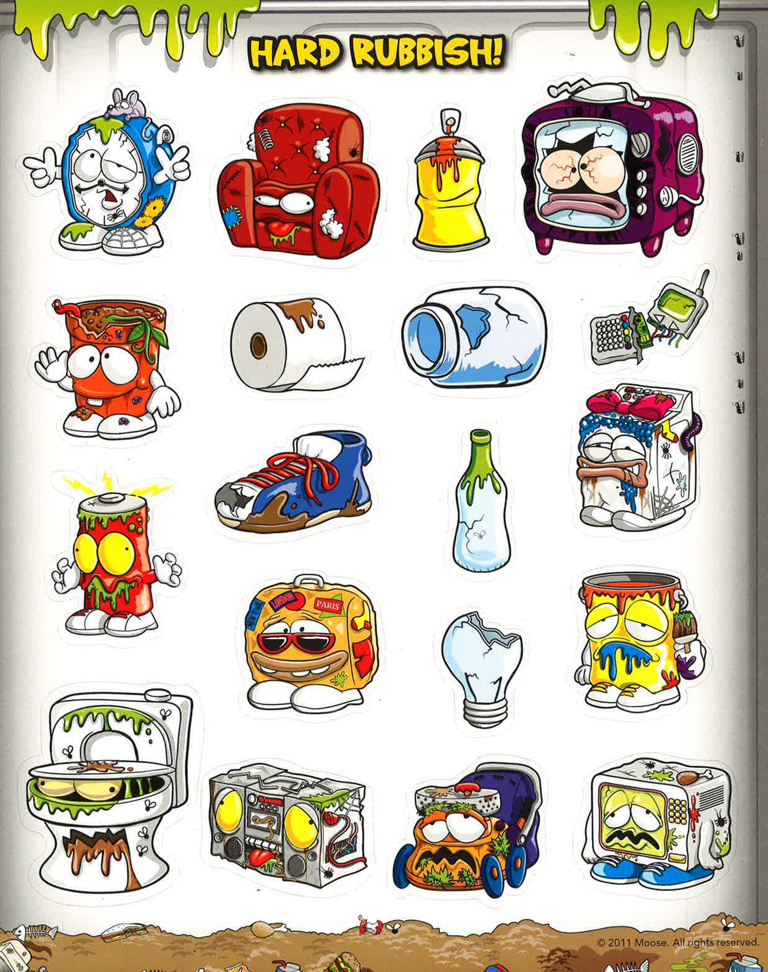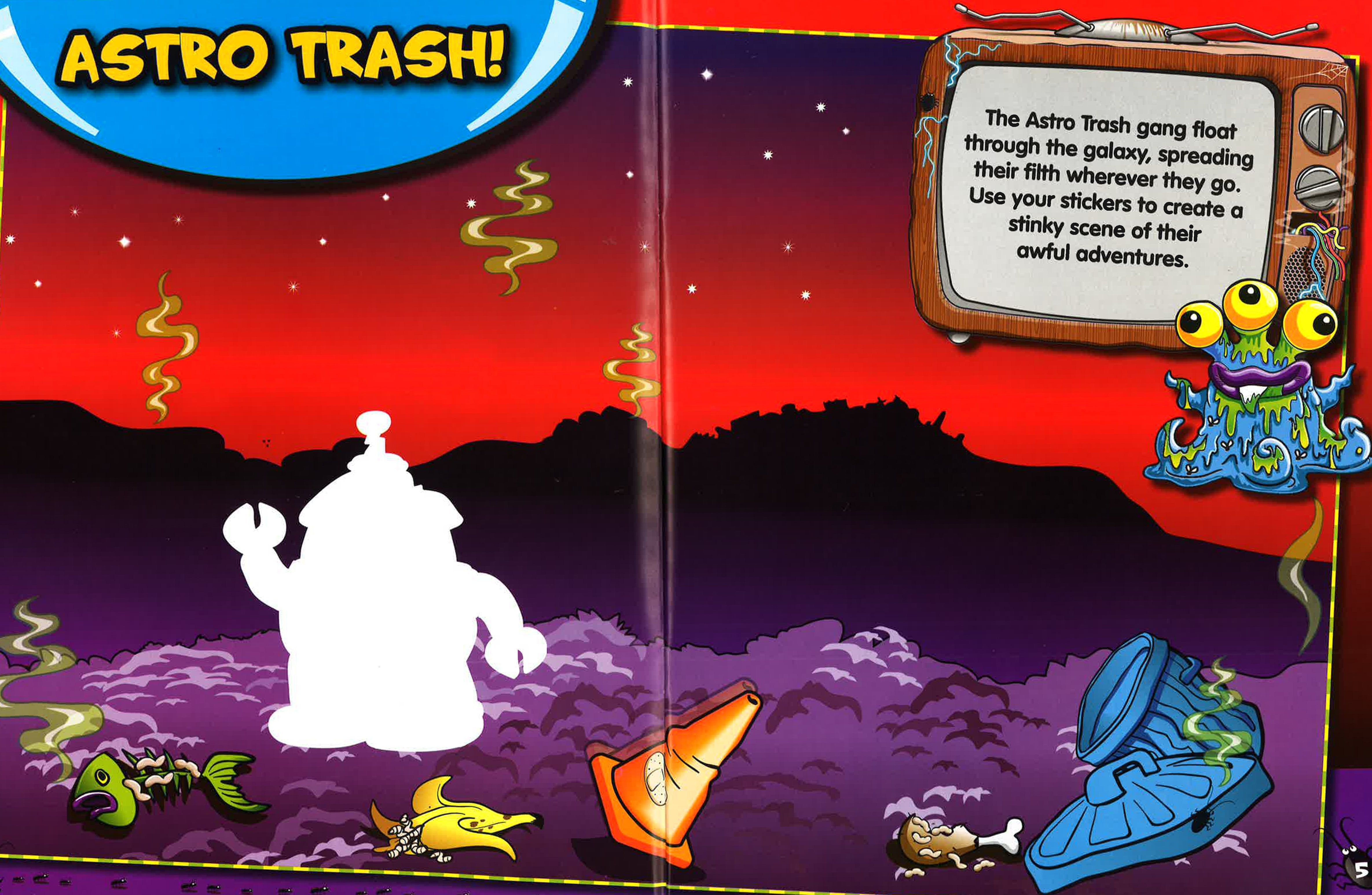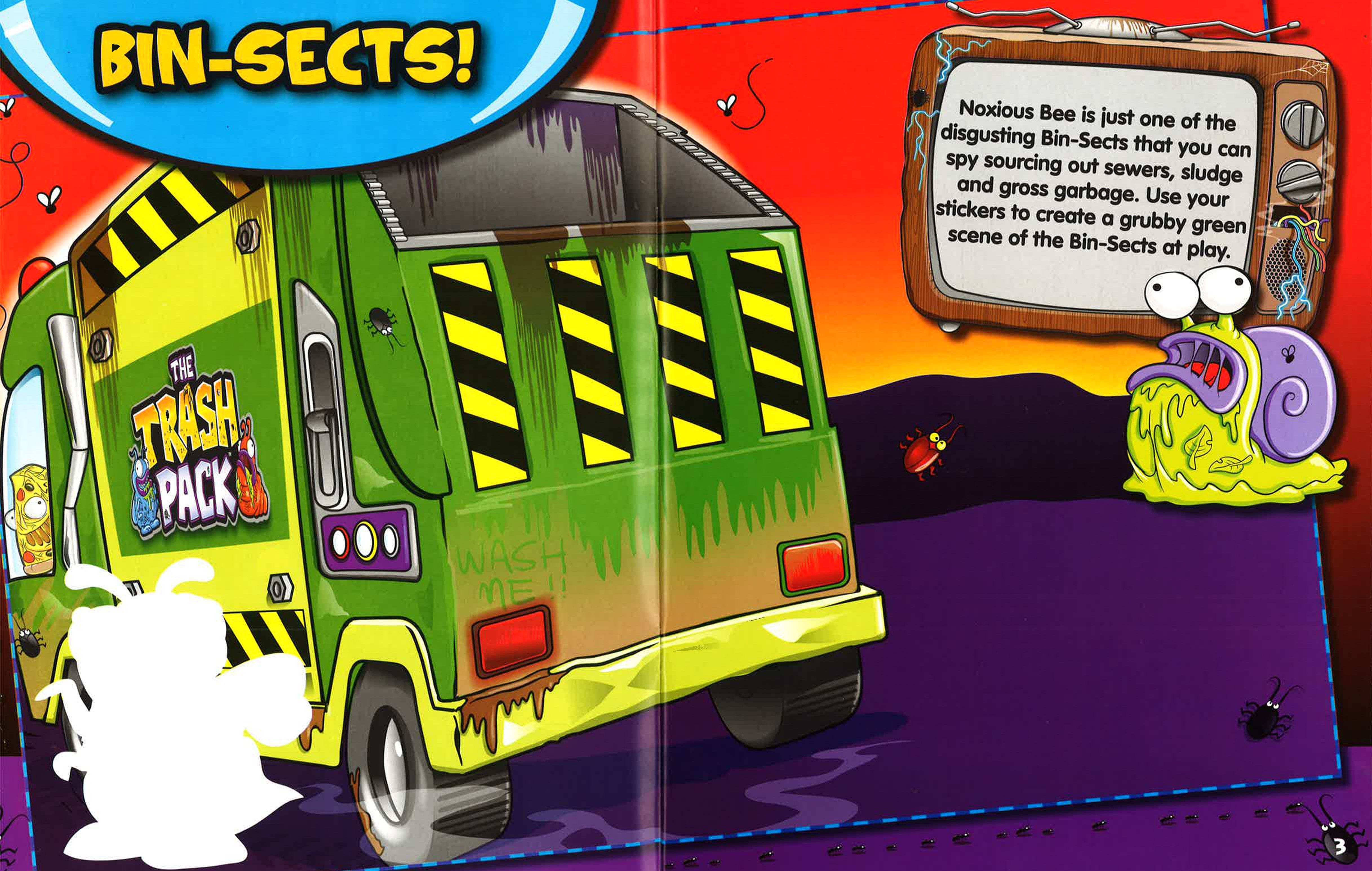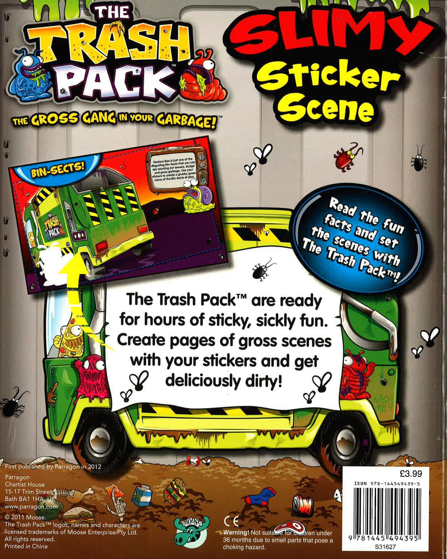 Trash Pack. The Gross Gang in your Garbage! The Trash Pack are ready for hours of sticky, sickly fun! Create pages of gross scenes with your cool stickers of the grossest, slimiest Trashies! Characters include Bin-sects like Mucky Maggot, Germ Worm, Trash-a-pillar, Rancid Roach and many more. This fun sticker activity book contains 6 double-page scenes and 3 pages of stickers.