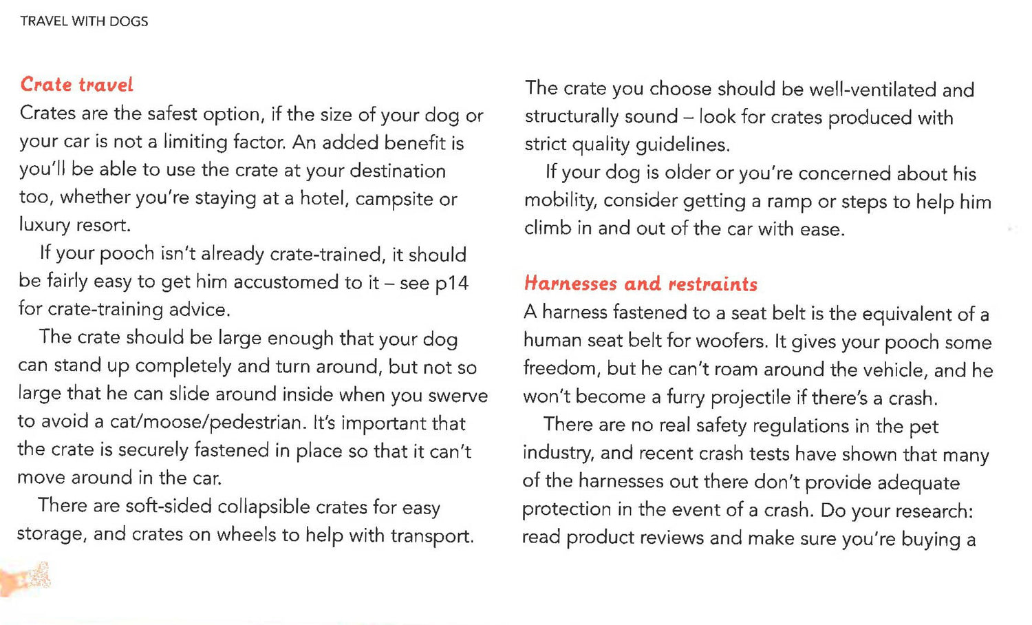 The handy pocket-sized book starts with giving the reasons why readers will enjoy taking their dog on their travels and how to decide what your dog is capable of. The golden rules of dog travel are listed. Next Lonely Planet provides explanations of what type of vaccinations, health certificates and documents are needed for travel around the Americas, Europe and Australia with a dog.