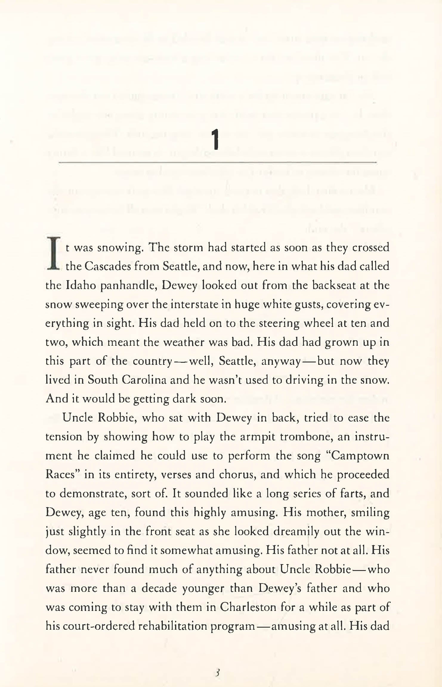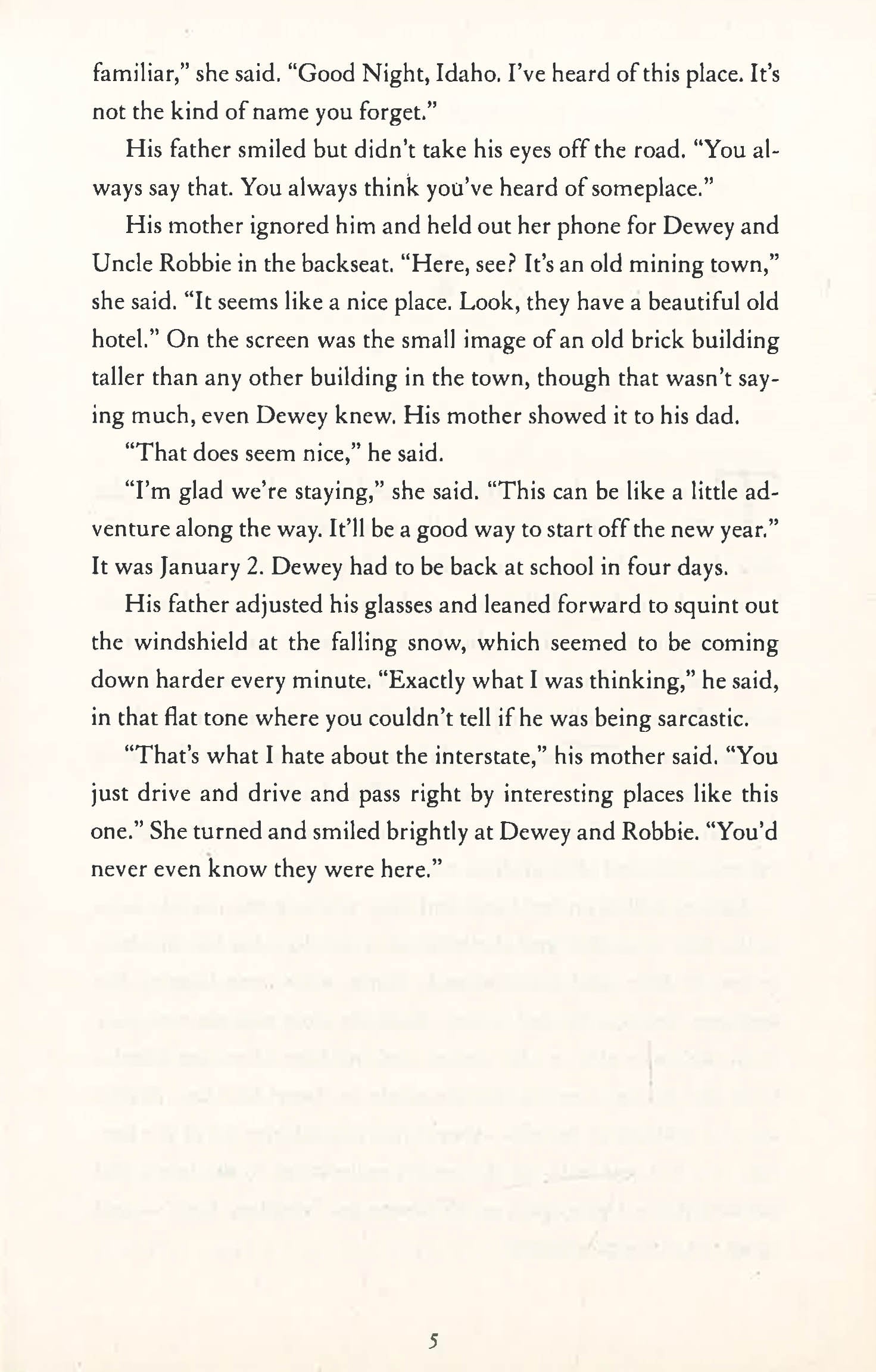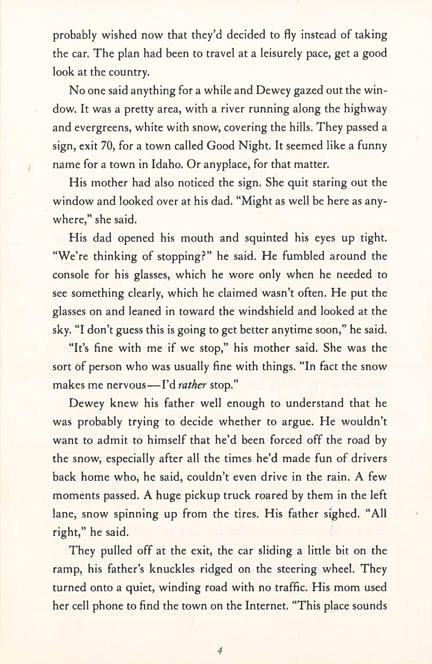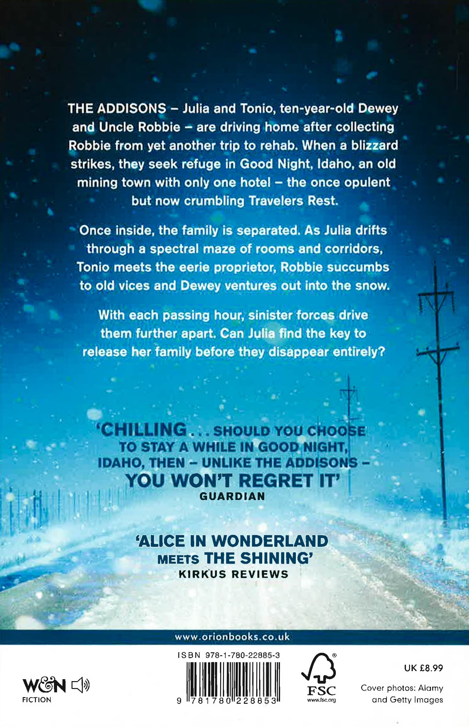The Addisons - Julia and Tonio, ten-year-old Dewey, and Uncle Robbie - are driving home after collecting Robbie from yet another trip to rehab. When a terrifying blizzard strikes outside the town of Good Night, Idaho, they seek refuge at the Travelers Rest, a formerly opulent but now crumbling hotel.