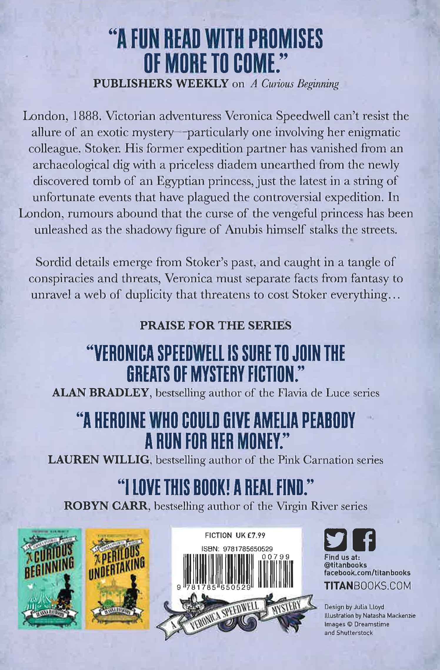 London, 1888. Victorian adventuress Veronica Speedwell can't resist the allure of an exotic mystery-particularly one involving her enigmatic colleague, Stoker. His former expedition partner has vanished from an archaeological dig with a priceless diadem unearthed from the newly discovered tomb of an Egyptian princess, just the latest in a string of unfortunate events that have plagued the controversial expedition. In London, rumours abound that the curse of the vengeful princess has been unleashed as the shadowy figure of Anubis himself stalks the streets. Sordid details emerge from Stoker's past, and caught in a tangle of conspiracies and threats, Veronica must separate facts from fantasy to unravel a web of duplicity that threatens to cost Stoker everything...