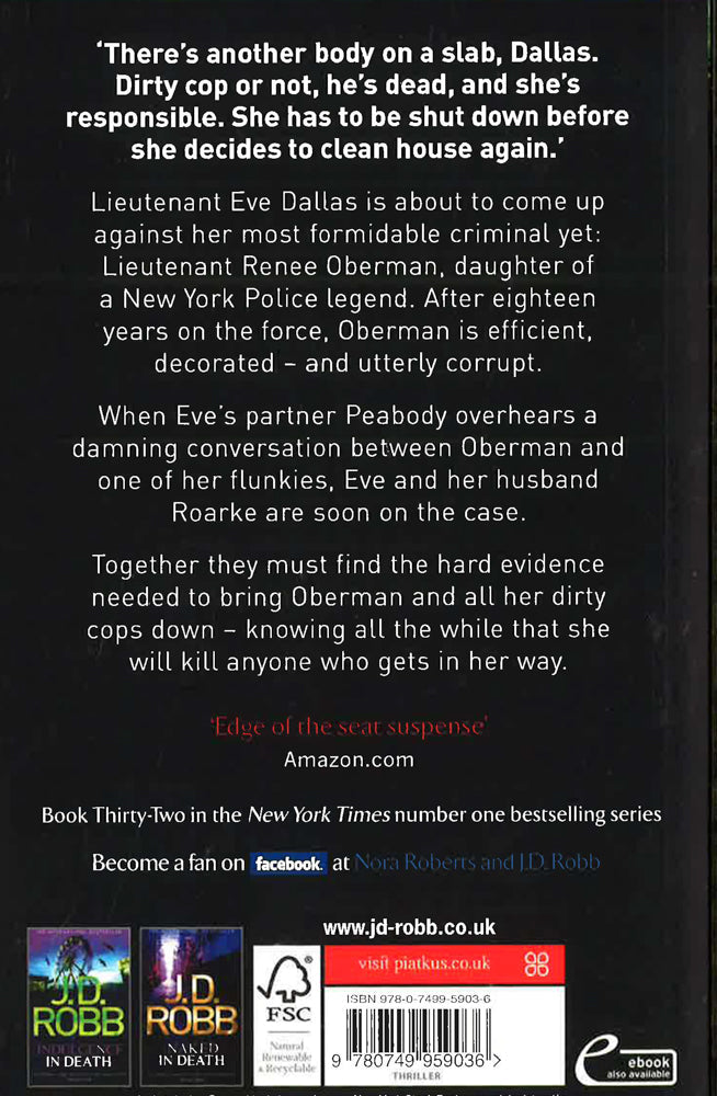 The new and reissued J. D. Robb classic from the 'In Death' series, where Eve Dallas specialises in tracking down those who break the law - including the ones sworn to uphold it. There's another body on a slab, Dallas. Dirty cop or not, he's dead, and she's responsible. She has to be shut downbefore she decides to clean house again.'Lieutenant Eve Dallas is about to come up against her most formidable criminal yet: Lieutenant Renee Oberman, daughter of a New York Police legend. After eighteen years on the force, Oberman is efficient, decorated - and utterly corrupt.When Eve's partner Peabody overhears a damning conversation between Oberman and one of her flunkies, Peabody, Eve and her husband Roarke are soon on the case.Together they must find the hard evidence needed to bring Oberman and all her dirty cops down - knowing all the while that she will kill anyone who gets in her way.
