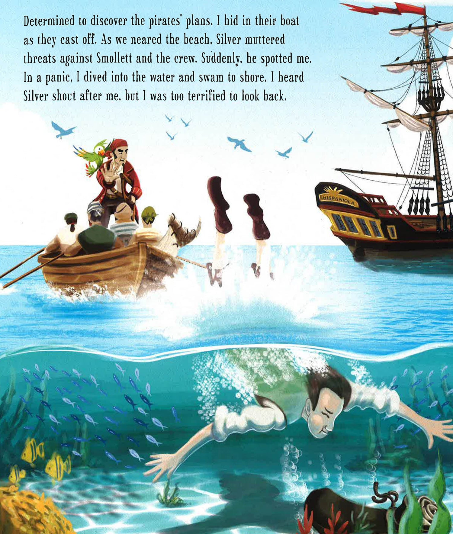 Set sail on a rip-roaring adventure in this classic tale of pirates and treasure. Join Jim Hawkins, Captain Smollett and the bold buccaneer Long John Silver as they tackle unsettled seas and pirate mutinies in search of buried treasure. This swashbuckling tale, with stunning original illustrations, is perfect for a thrilling and exciting storytime.