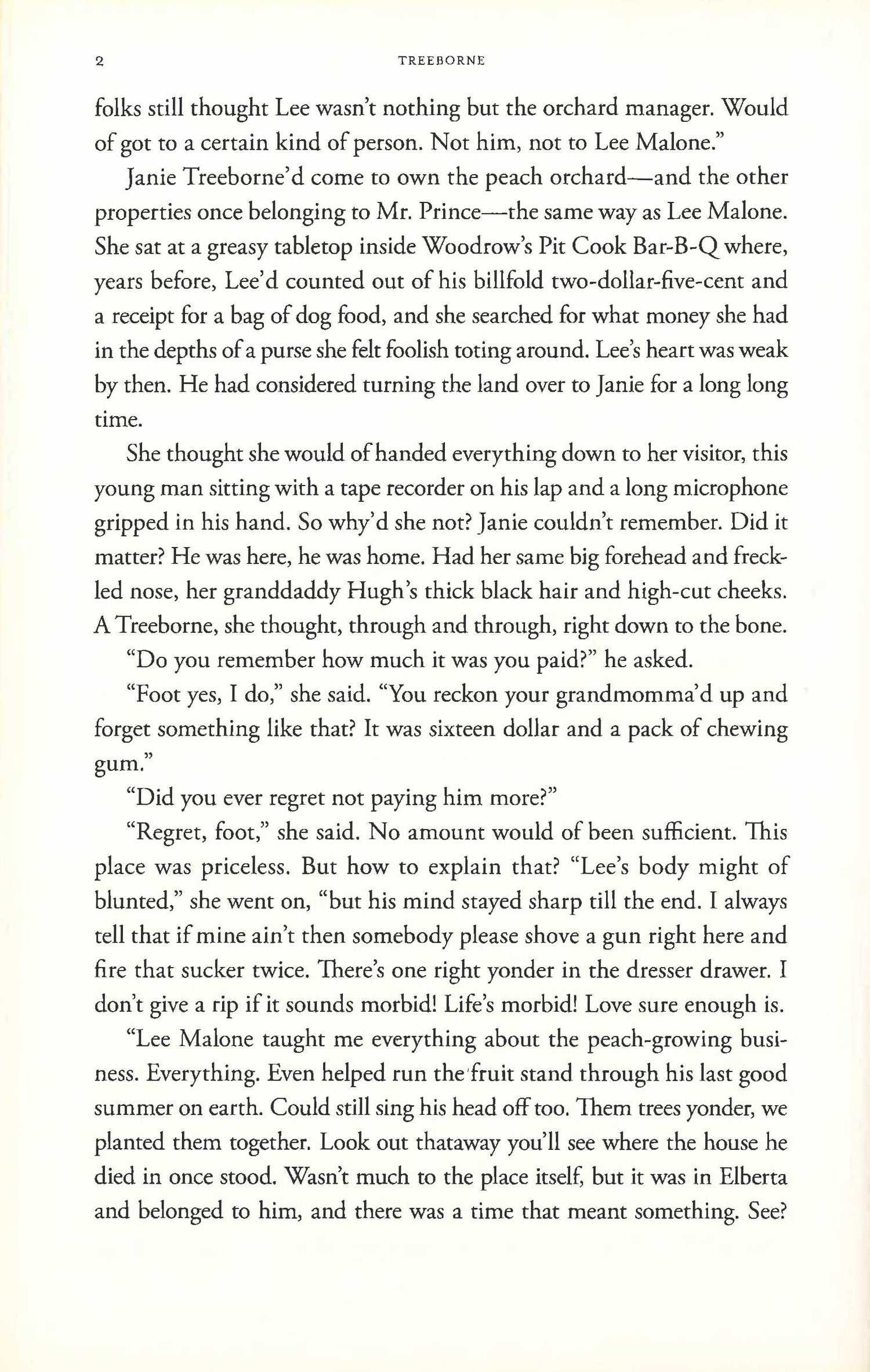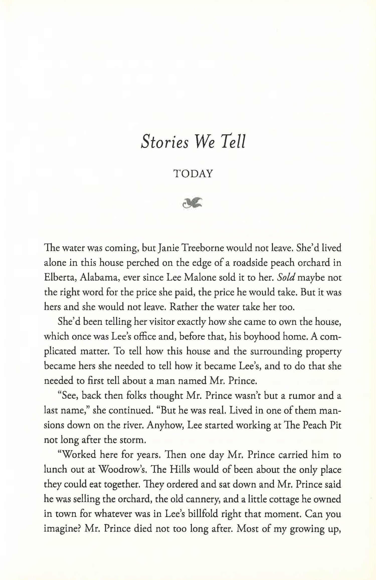 Janie Treeborne lives on an orchard at the edge of Elberta, Alabama, and in time, she has become its keeper. A place where conquistadors once walked, and where the peaches they left behind now grow, Elberta has seen fierce battles, violent storms, and frantic change--and when the town is once again threatened from without, Janie realizes it won't withstand much more. So she tells the story of its people: of Hugh, her granddaddy, determined to preserve Elberta's legacy at any cost; of his wife, Maybelle, the postmaster, whose sudden death throws the town into chaos; of her lover, Lee Malone, a black orchardist harvesting from a land where he is less than welcome; of the time when Janie kidnapped her own Hollywood-obsessed aunt and tore the wrong people apart.