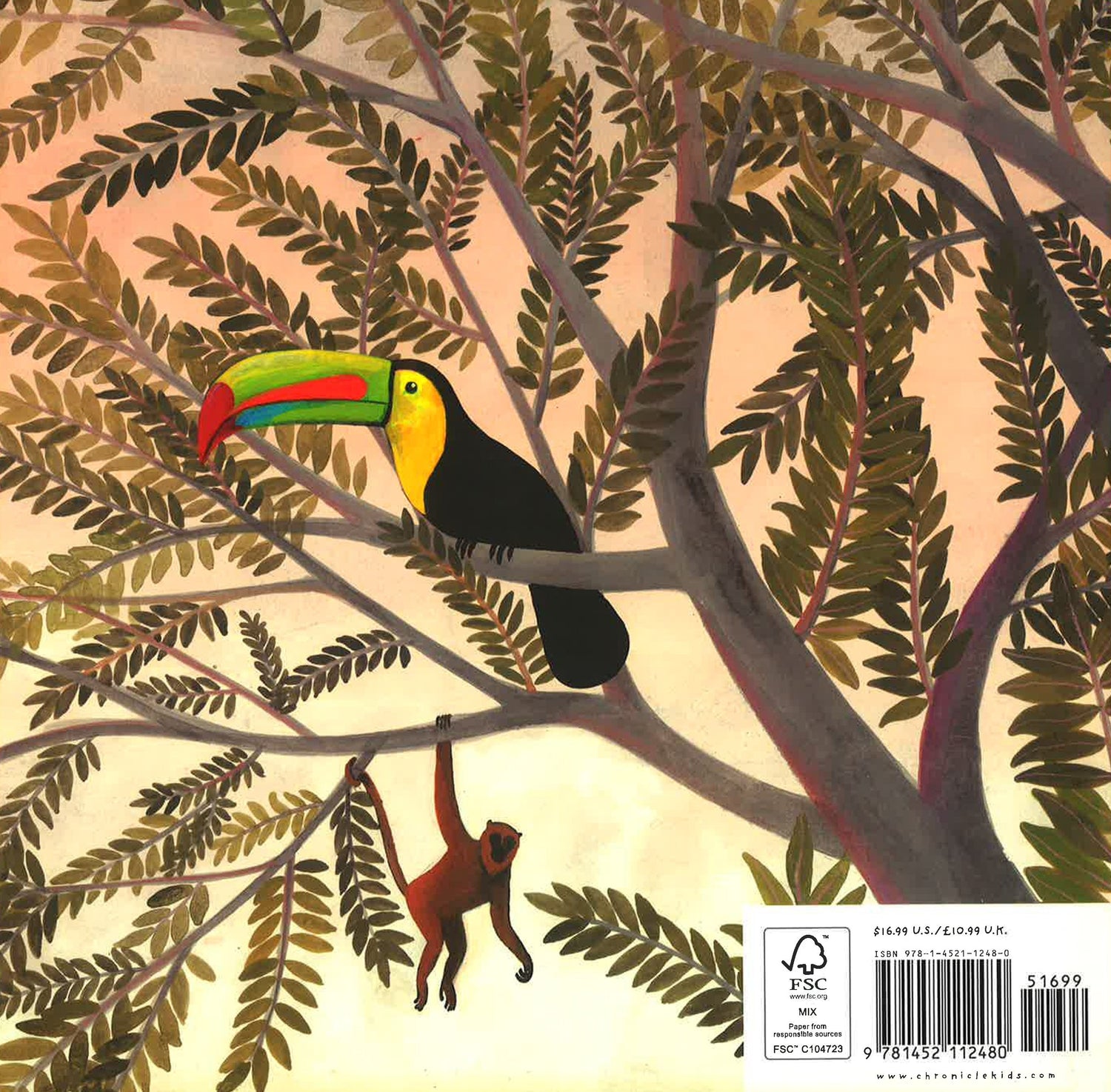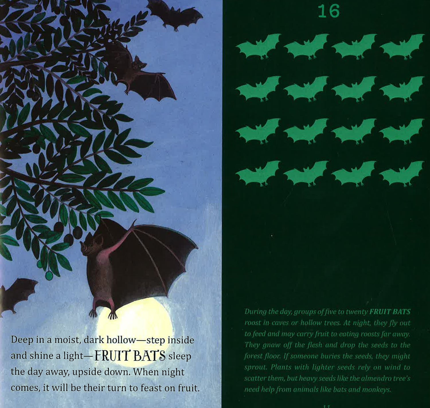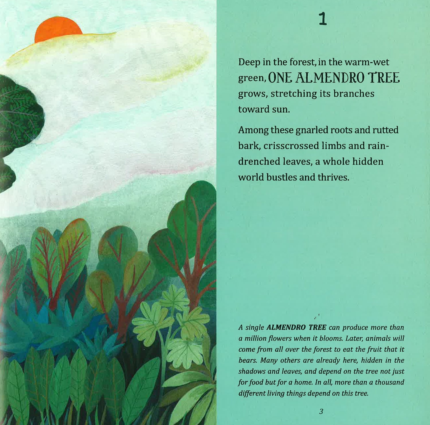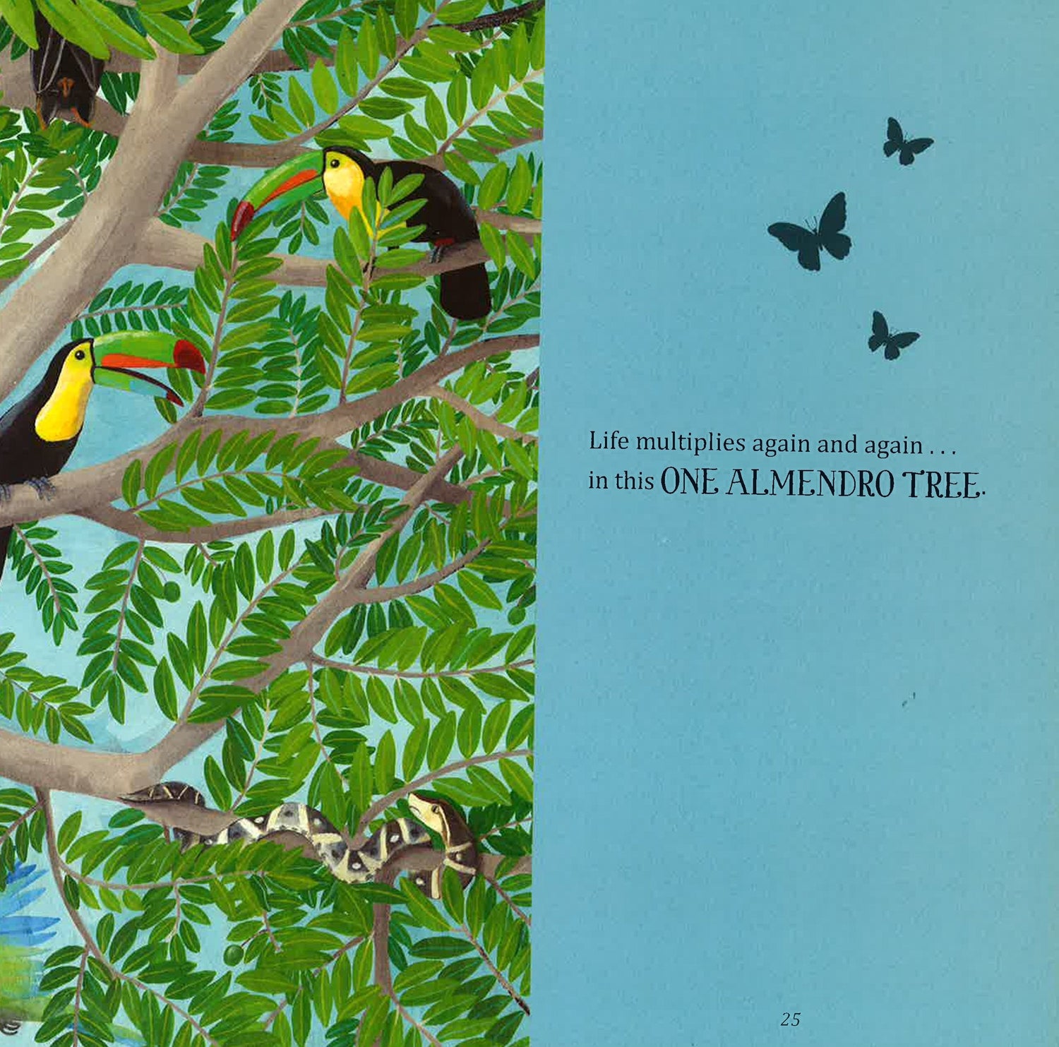 Deep in the forest, in the warm-wet green, 1 almendro tree grows, stretching its branches toward the sun. Who makes their homes here? 2 great green macaws, 4 keel-billed toucans, 8 howler monkeys, 16 fruit bats, 32 fer-de-lance vipers, 64 agoutis, 128 blue morpho butterflies, 256 poison dart frogs, 512 rusty wandering spiders, 1,024 leafcutter ants. Count each and every one as life multiplies again and again in this lush and fascinating book about the rainforest.