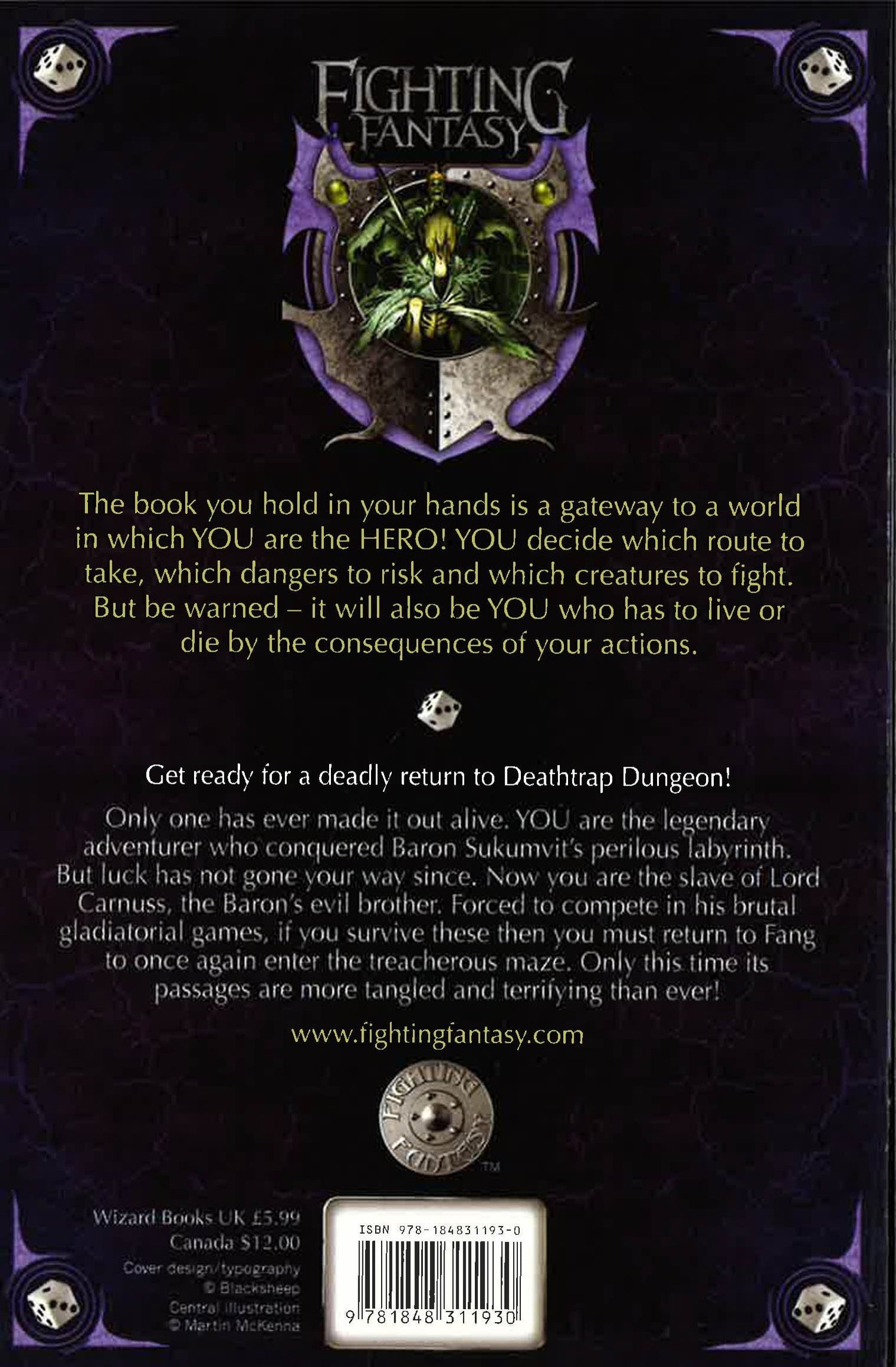 Get ready for a deadly return to Deathtrap Dungeon! Only one ever made it out alive. YOU are the legendary adventurer who conquered Baron Sukumvit's perilous labyrinth. But luck has not gone your way since. Now you are the slave of Lord Carnuss, the Baron's evil brother. Forced to compete in his brutal gladiatorial games, if you survive these then you must return to Fang to once again enter the treacherous maze. But the warped, twisted mind of Baron Sukumvit has completely redesigned the twisting underground passages. New traps and terrors await you at every turn. Even for you, this is a challenge like no other. Can YOU survive this Trial of Champions and free yourself from slavery?