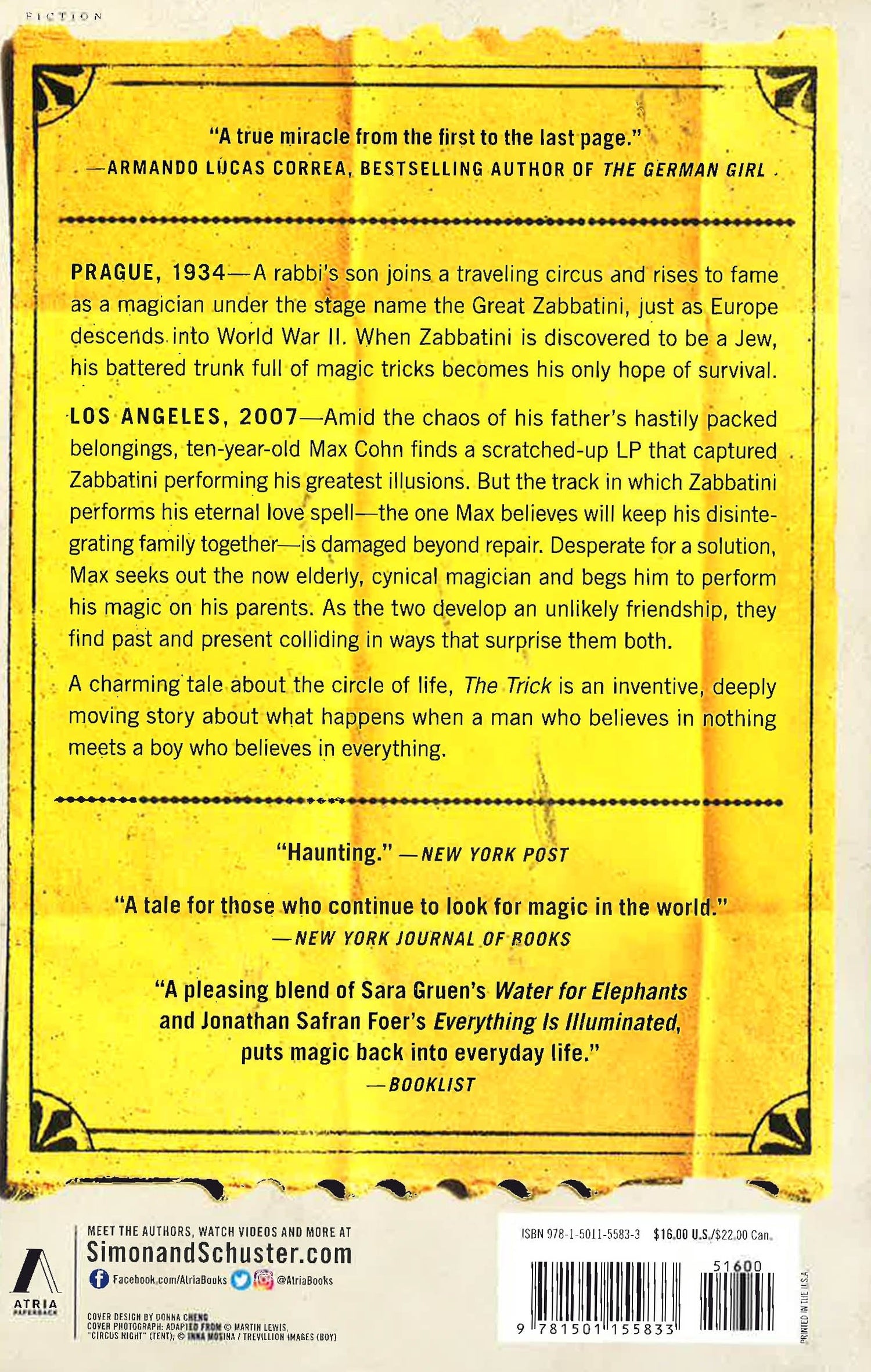 Sweeping between Prague during World War II and modern-day Los Angeles, "The Trick is a lyrical, uplifting, and funny story that will tug at all of your heartstrings" (Armando Lucas Correa, bestselling author of The German Girl) that follows a young boy seeking out a cynical, old magician in the hopes that his spells might keep his family together. In 1934, a rabbi's son in Prague joins a traveling circus, becomes a magician, and rises to fame under the stage name the Great Zabbatini, just as Europe descends into World War II. When Zabbatini is discovered to be a Jew, his battered trunk full of magic tricks becomes his only hope for survival.