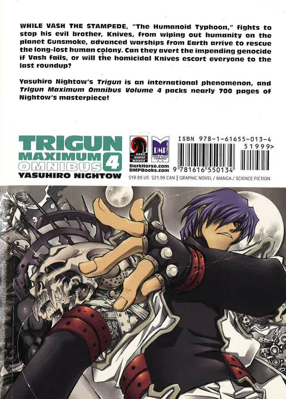 While Vash the Stampede, "The Humanoid Typhoon," fights to stop his evil brother, Knives, from wiping out humanity on the planet Gunsmoke, advanced warships from Earth arrive to rescue the long-lost human colony. Can they avert the impending genocide if Vash fails, or will the homicidal Knives escort everyone to the last roundup? The value-priced Trigun Maximum Omnibus Volume 4 collects nearly 700 pages of Yasuhiro Nightow's international hit manga that spawned a smash animated series, feature film, toys, games, and more. Collects previously published Trigun Maximum volumes 10, 11, and 12.
