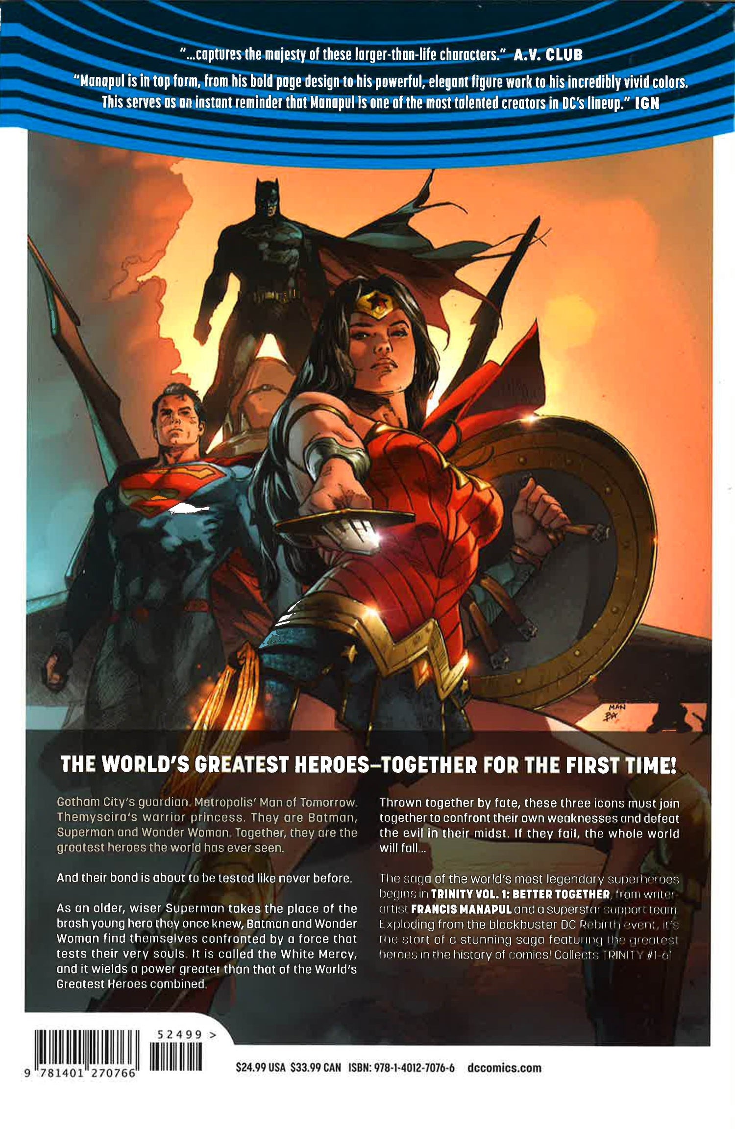 Gotham City's guardian. Metropolis' Man of Tomorrow. Themyscira's warrior princess. They are Batman, Superman and Wonder Woman. Together, they are the greatest heroes the world has ever seen.And their bond is about to be tested like never before.As an older, wiser Superman takes the place of the brash young hero they once knew, Batman and Wonder Woman find themselves confronted by a force that tests their very souls. It is called the White Mercy, and it wields a power greater than that of the World's Greatest Heroes combined.Thrown together by fate, these three icons must join together to confront their own weaknesses and defeat the evil in their midst. If they fail, the whole world will fall...This start of a stunning saga features the greatest heroes in the history of comics from author-artist Francis Manapul in TRINITY VOL. 1: BETTER TOGETHER! Collects TRINITY #1-6!