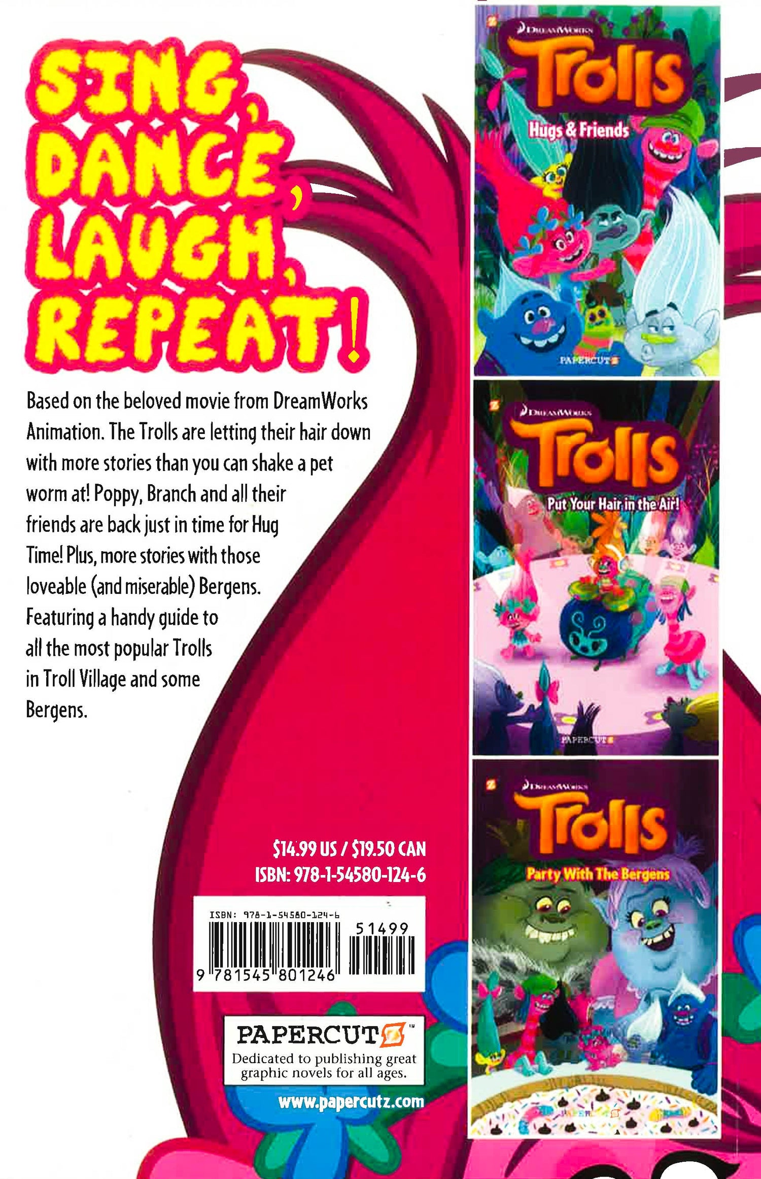 Three stories in one thick, value-priced volume! Hug time was just the beginning! Join Poppy, Branch and the rest of the Trolls for nonstop hair-raising adventure! The party doesn't stop there! The Bergens are also in town! You can't stop that feel good feeling from reading these stories based on the DreamWorks Trolls animated feature film! Recollecting stories from the first three TROLLS graphic novels, published by Papercutz.