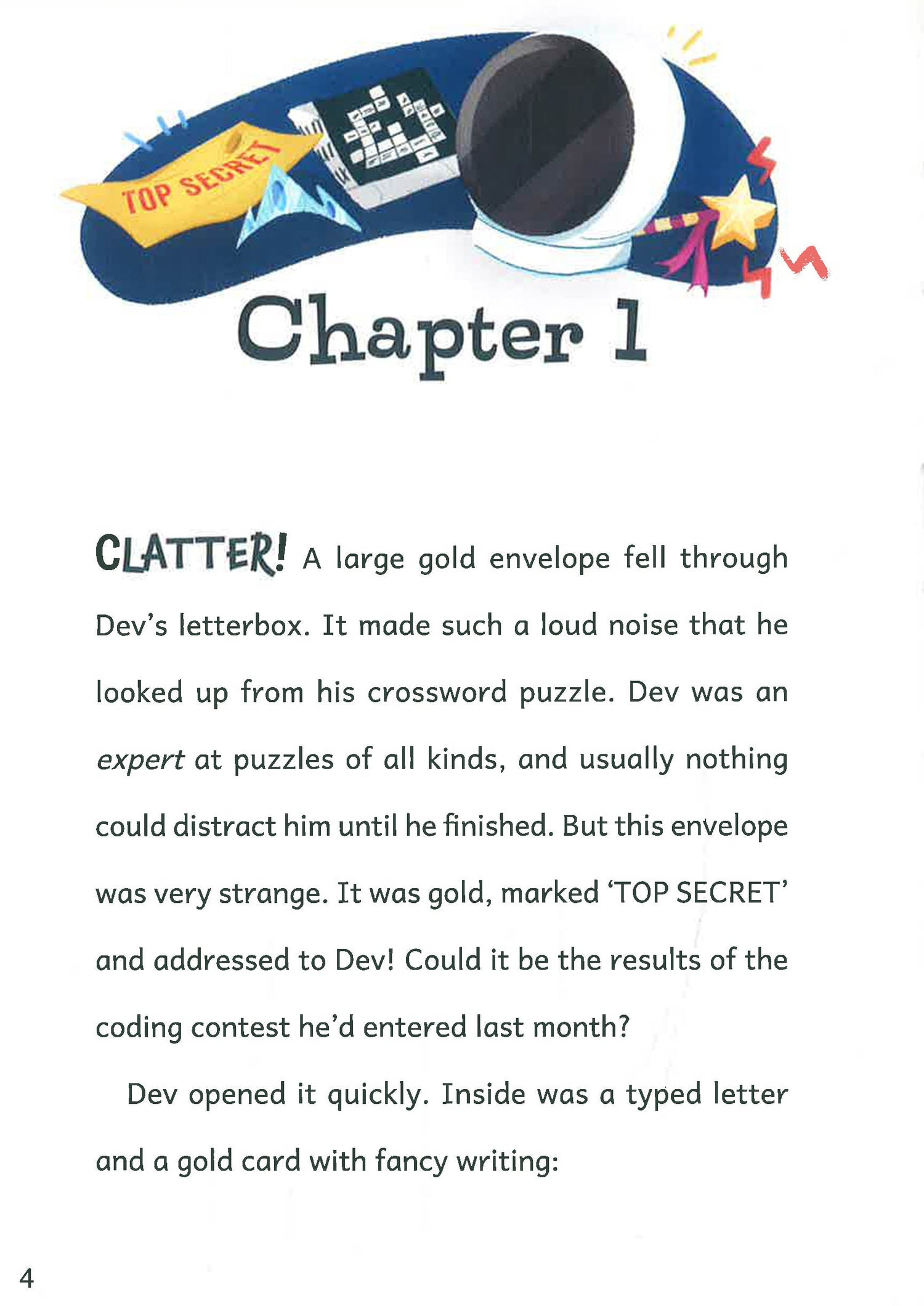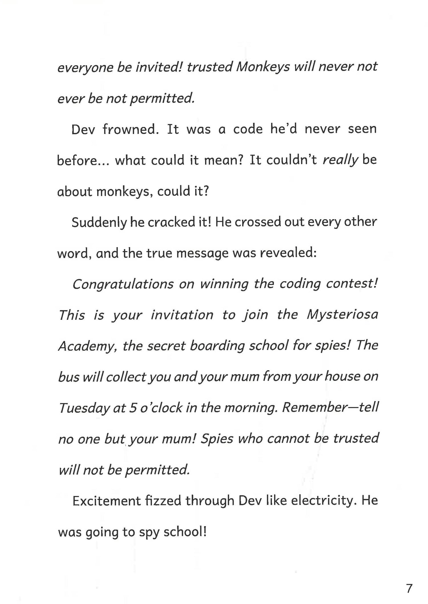 Dev loves cracking codes, but he never expected to crack a code and enrol in a school for spies! He loves his new school, where he learns about disguises and gadgets. When the headmasters calls him and his friends, Anya and Mo, to their first mission, Dev can't wait to prove himself. But things don't quite add up... can Dev figure out what's really going on?