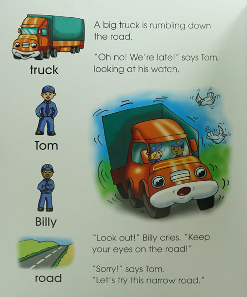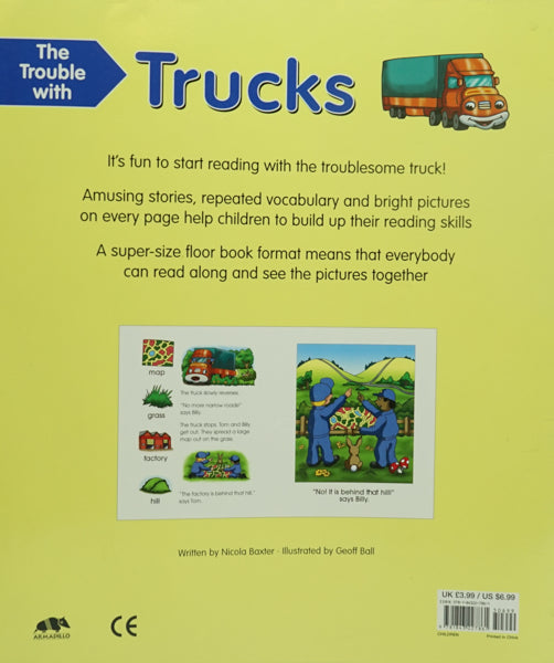 This is a super-size first reading book for 3-5 year olds, with an engaging story, colourful pictures and point-and-say words to learn. A super-size floor book format means that everybody can read along and see the pictures. It includes amusing stories, repeated vocabulary and brightly coloured pictures on every page help children to feel confident as they build up their reading skills. Other titles in this series include "The Trouble with Tractors", "The Trouble with Tippers" and "The Trouble with Trains". It helps you to follow the troublesome truck through its day, causing chaos as it takes a short cut and gets stuck in a country lane, turns up late at the factory and then spills lunch all over everyone. The fun colourful pictures and silly story in this book help to make reading at home successful and enjoyable. This book can be used in several ways to help beginning readers gain confidence. Start by reading the illustrated words at the edge of each left-hand page with your child, then have fun trying to spot the same words and pictures in the story itself. Finally, the illustrated words can be found at the end of this book so that you can check all the words that have been learnt.