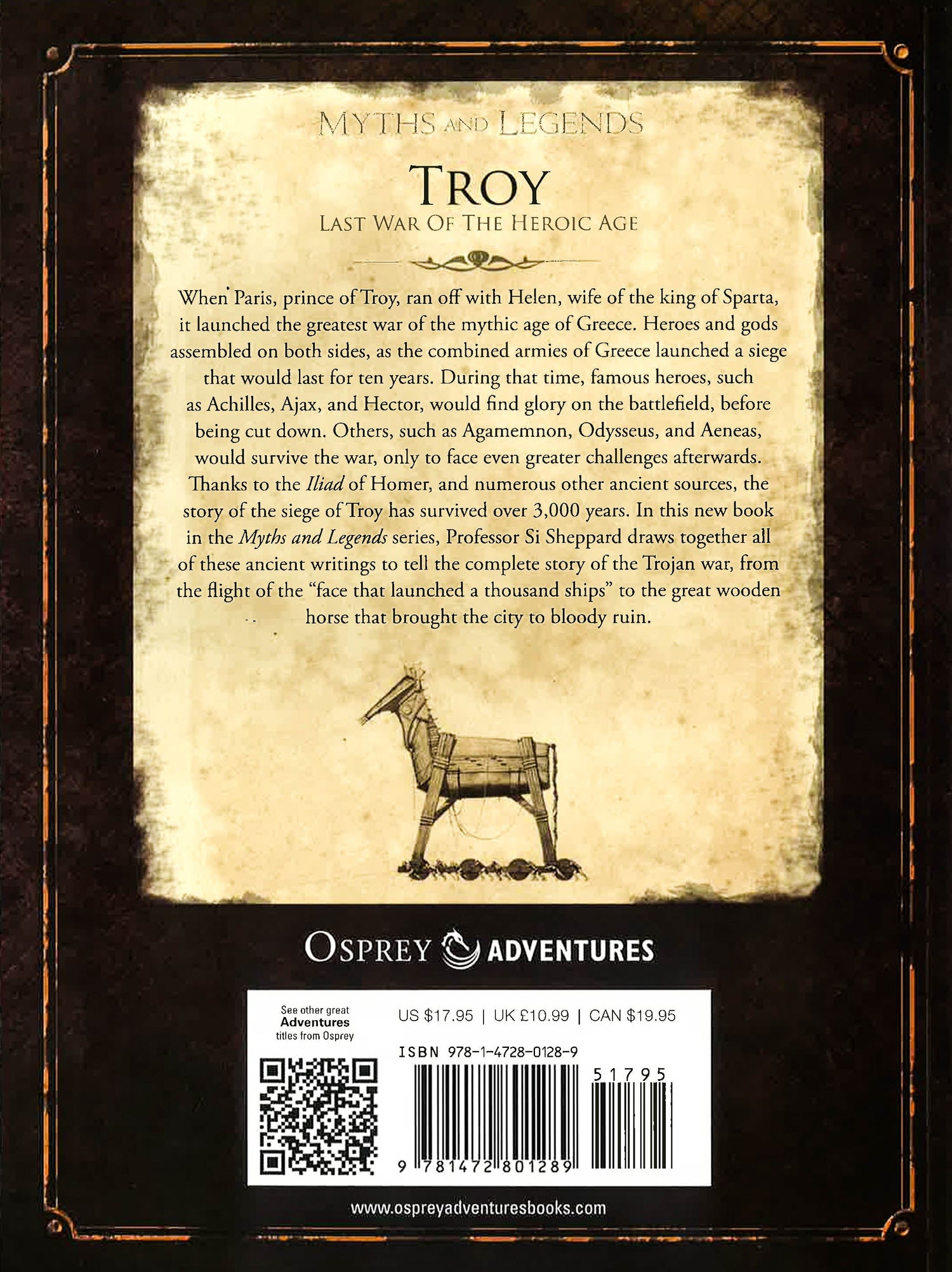 When Paris, prince of Troy, ran off with Helen, wife of the king of Sparta, it launched the greatest war of the mythic age of Greece. Heroes and gods assembled on both sides, as the combined armies of Greece launched a siege that would last for ten years. During that time, famous heroes, such as Achilles, Ajax, and Hector, would find glory on the battlefield, before being cut down. Others, such as Agamemnon, Odysseus, and Aeneas, would survive the war, only to face even greater challenges afterwards. Thanks to the Iliad of Homer, and numerous other ancient sources, the story of the siege of Troy has survived over 3,000 years. In this new book in the Myths and Legends series, Professor Si Sheppard draws together all of these ancient writings to tell the complete story of the Trojan war, from the flight of the "face that launched a thousand ships" to the great wooden horse that brought the city to bloody ruin.