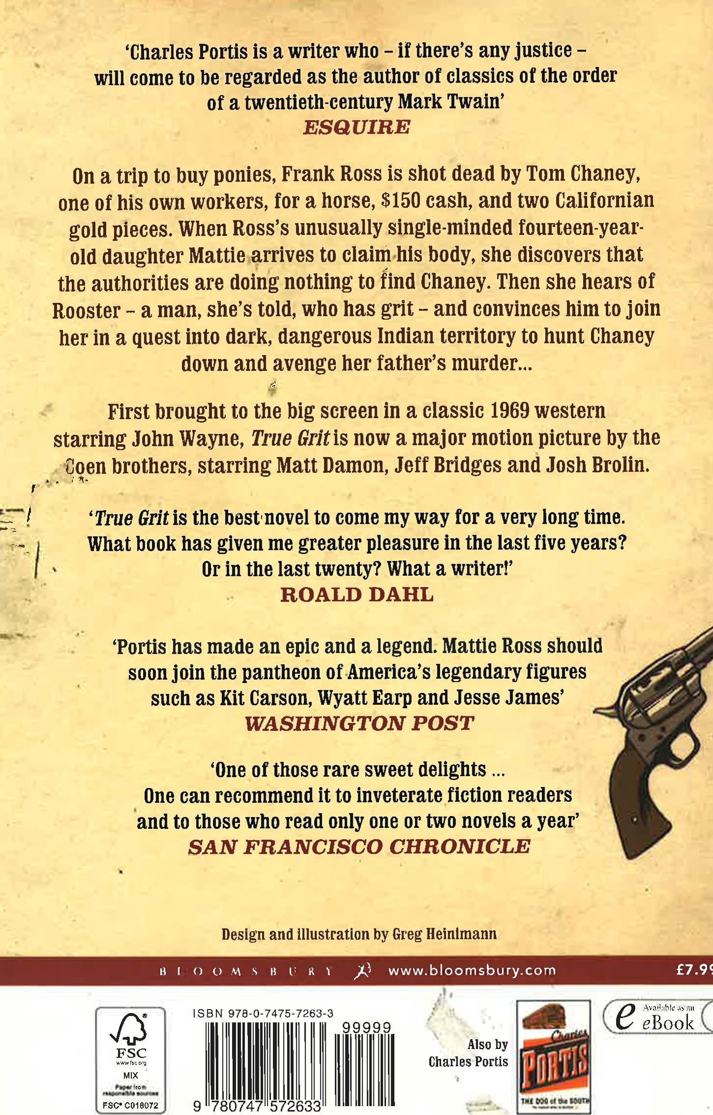 There is no knowing what lies in a man's heart. On a trip to buy ponies, Frank Ross is killed by one of his own workers. Tom Chaney shoots him down in the street for a horse, $150 cash, and two Californian gold pieces. Ross's unusually mature and single-minded fourteen-year-old daughter Mattie travels to claim his body, and finds that the authorities are doing nothing to find Chaney. Then she hears of Rooster - a man, she's told, who has grit - and convinces him to join her in a quest into dark, dangerous Indian territory to hunt Chaney down and avenge her father's murder.