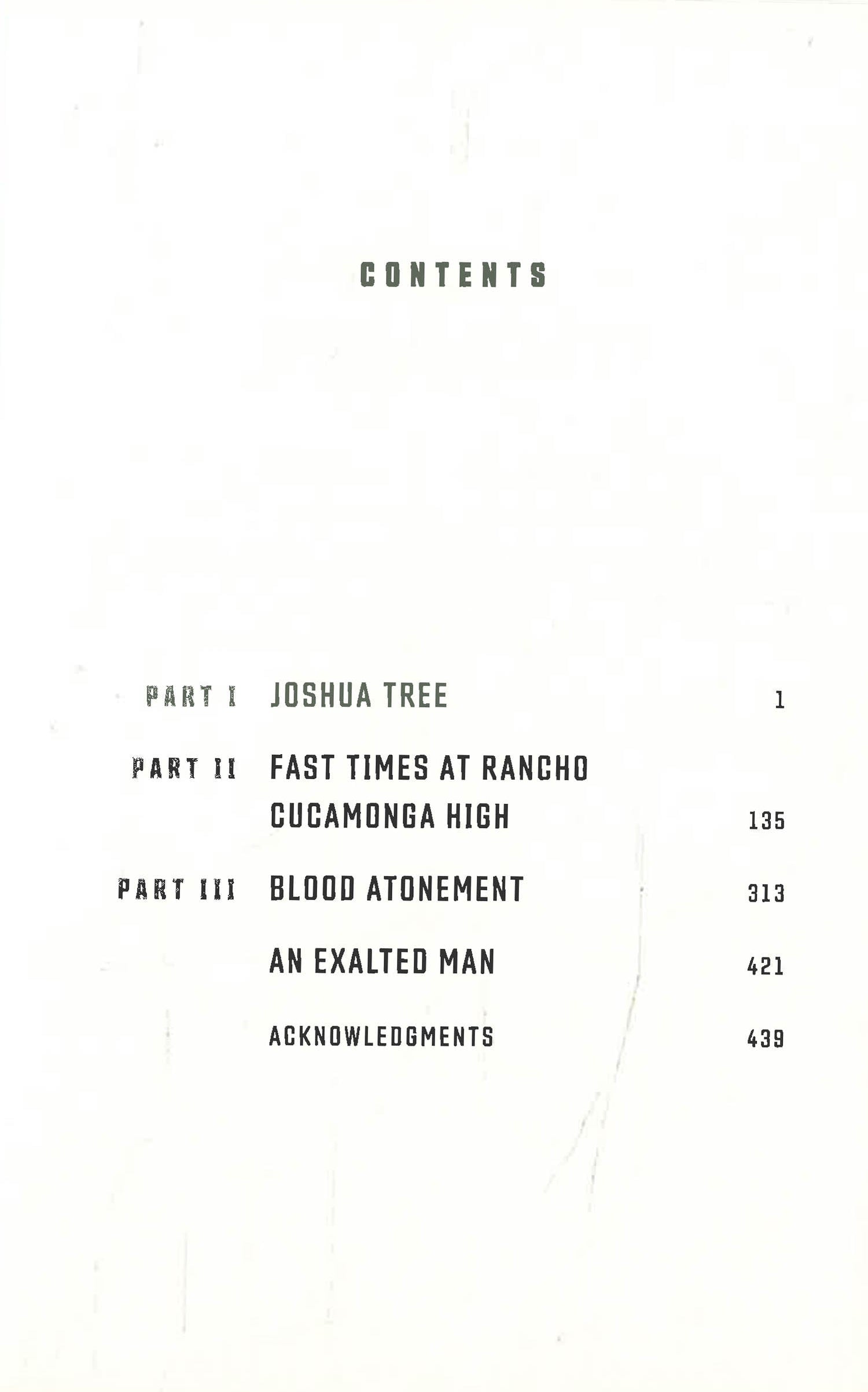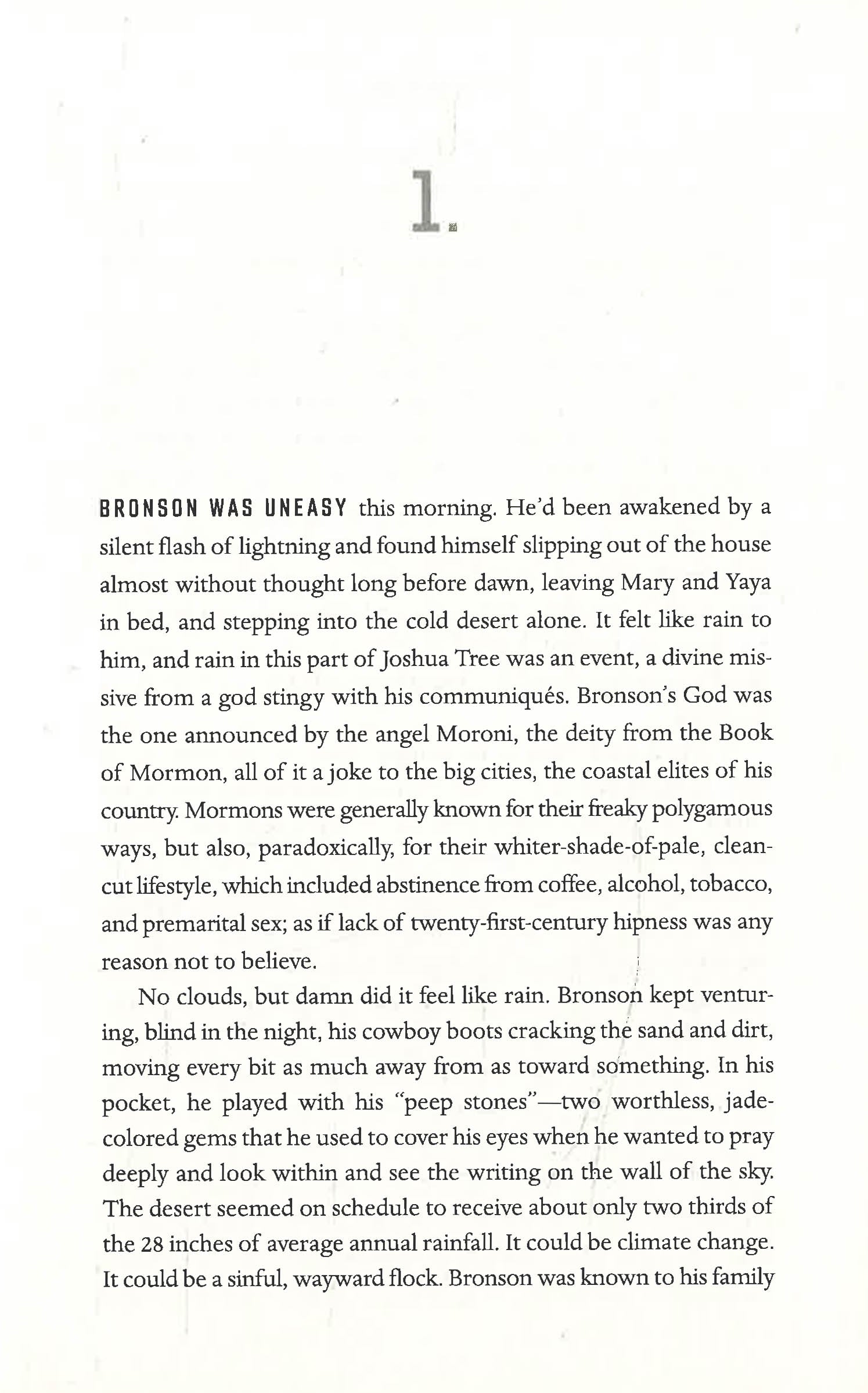 For the past twenty years, Bronson Powers, former star Hollywood stuntman and converted Mormon, has been homesteading deep in the uninhabited desert outside Joshua Tree with his three wives and ten children. Bronson and his wives, Yalulah, Mary, and Jackie, have been raising their family away from the corruption and evils of the modern world. Their insular existence—controversial, difficult, but Edenic—is upended when an ambitious young property developer, Maya Abbadessa, stumbles upon their land. Hoping to make a profit, she crafts a wager with the family that sets in motion a cataclysmic chain of events.