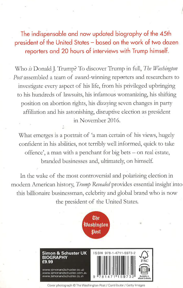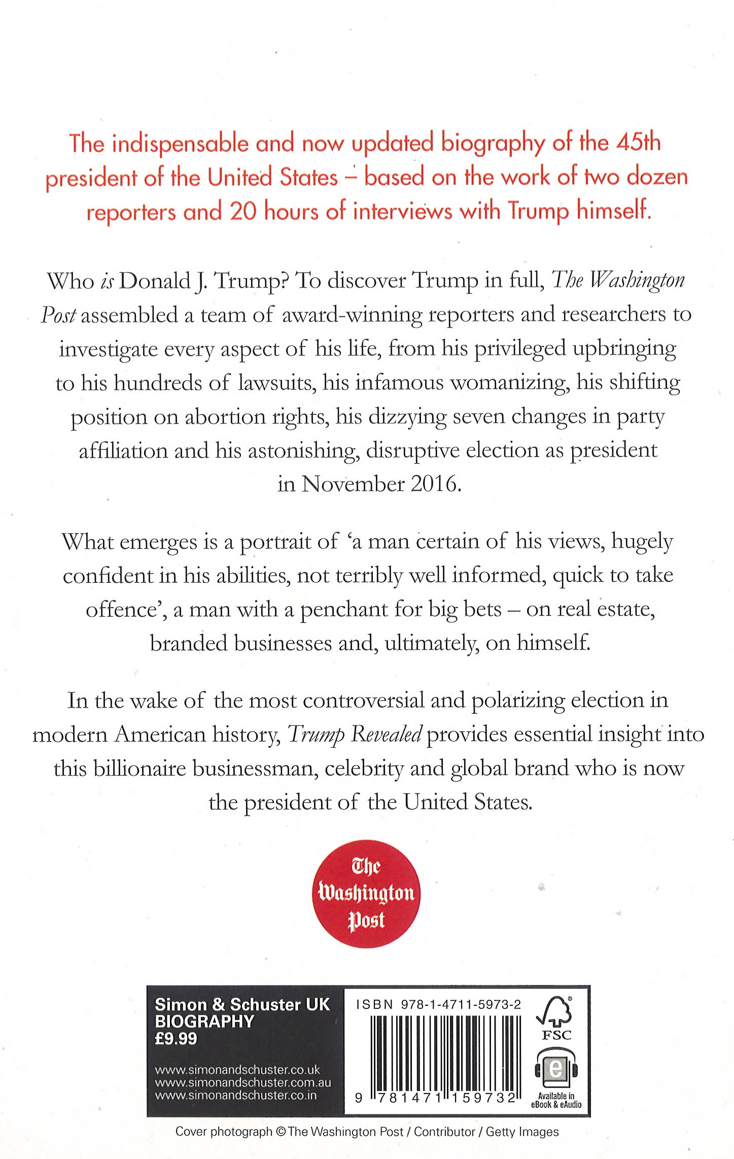 **NEW YORK TIMES BESTSELLER** 'Excellent book... skilful and meticulous' David Aaronovitch, The Times Hailed as 'authoritative' and 'essential', Trump Revealed is the indispensable and updated biography of the 45th president of the United States. Co-authored by Michael Kranish and Marc Fisher, the investigation was guided by the team who inspired the Academy Award-winning film Spotlight, which stars Michael Keaton, Mark Ruffalo and Rachel McAdams.WHO IS DONALD J. TRUMP? To discover Trump in full, the Washington Post assembled a team of award-winning reporters and researchers to investigate every aspect of his life, from his privileged upbringing, his lawsuits, his infamous womanizing, his ever-changing party affiliation, and his astonishing, disruptive election as president in November 2016. What emerges is a portrait of an indecisive man with a penchant for big bets - on property, branded businesses, and, ultimately, on himself.Trump Revealed provides essential insight into this billionaire businessman, celebrity, and global brand who is now the president of the United States.'Useful, vigorously reported' New York Times