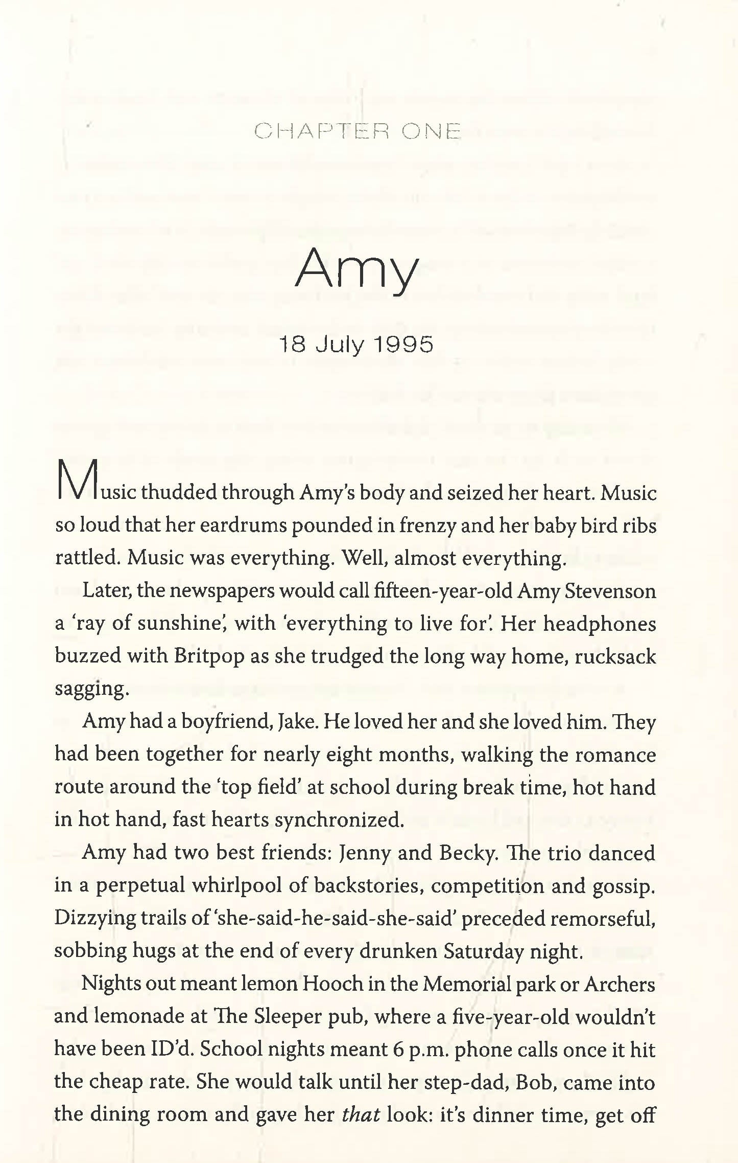 Amy is lost. When she was fifteen, she was attacked and left for dead in a park. Her attacker was never found. Since then, she has drifted in a lonely, timeless place. She's as good as dead, but not even her doctors are sure how much she understands.