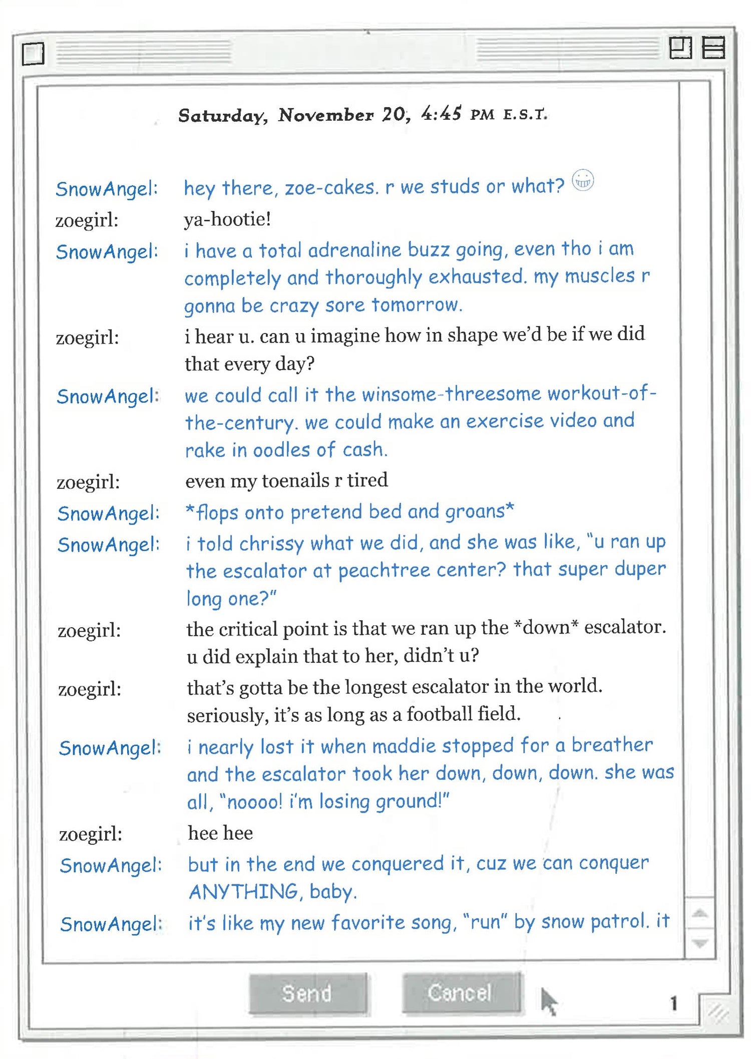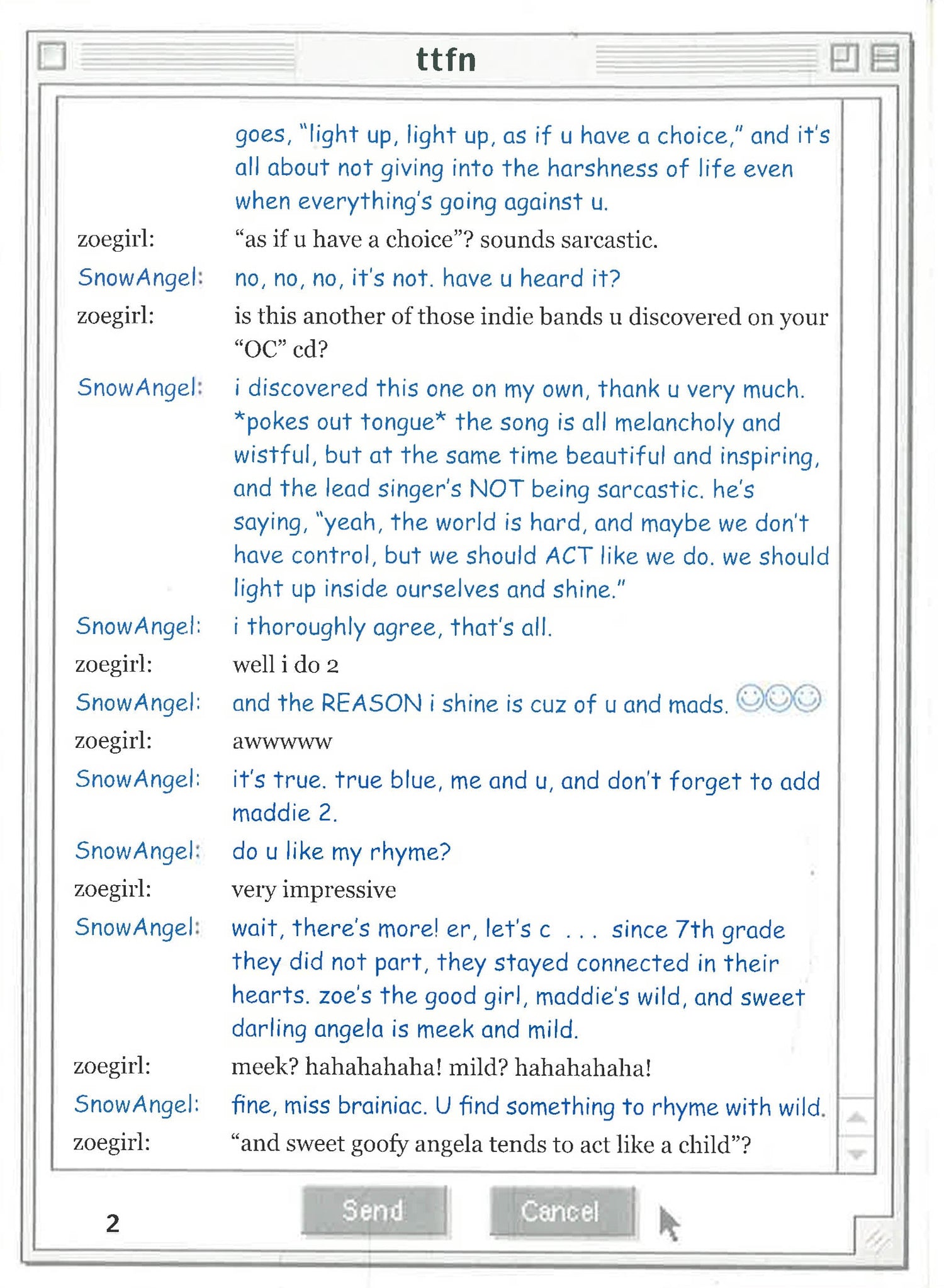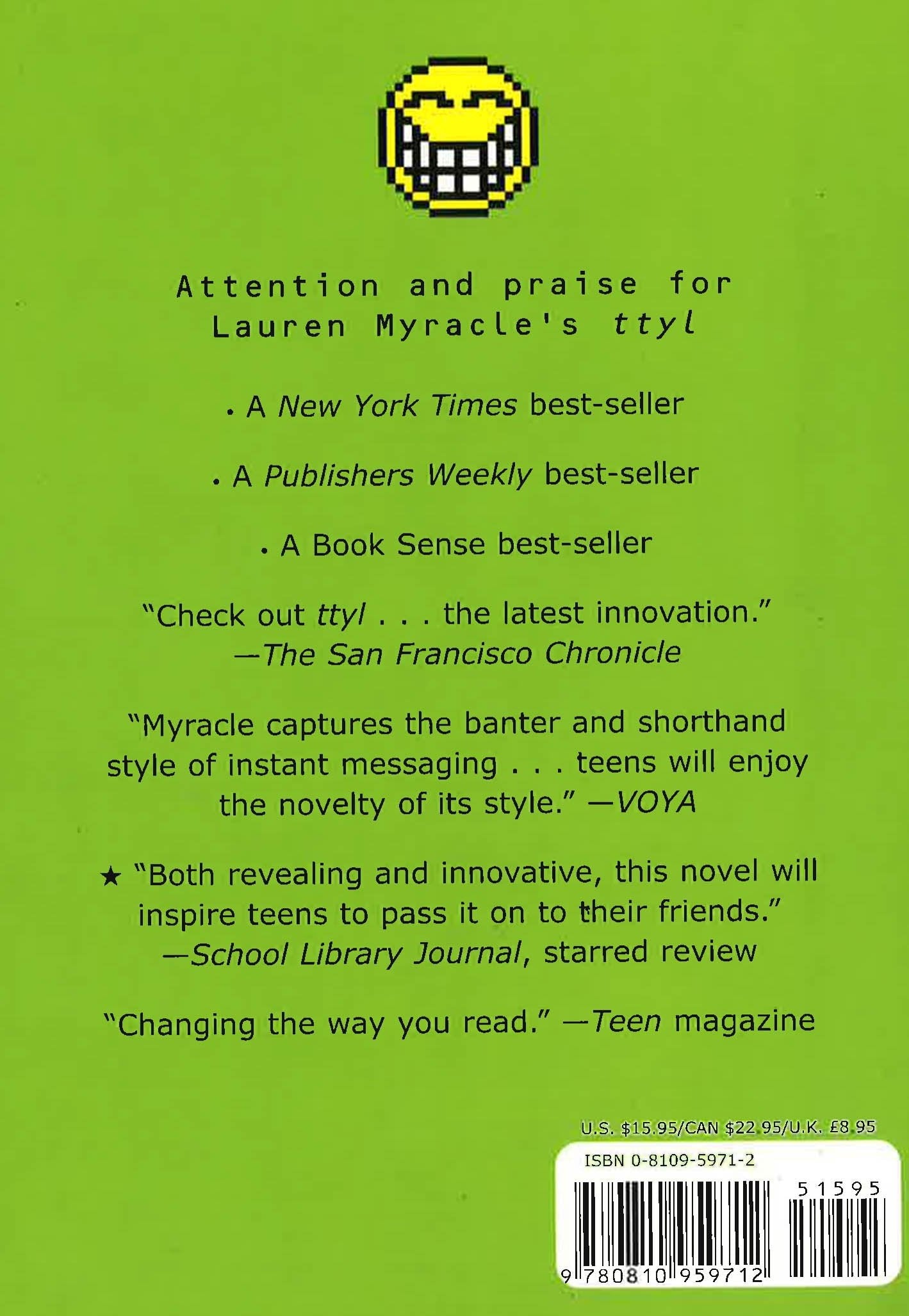 This sequel to the breakout bestseller, ttyl (a novel told entirely in instant messages), follows Maddie, Zoe, and Angela through their next year in high school, 11th grade. There's trouble and lots of IMs ahead for the Winsome Threesome.