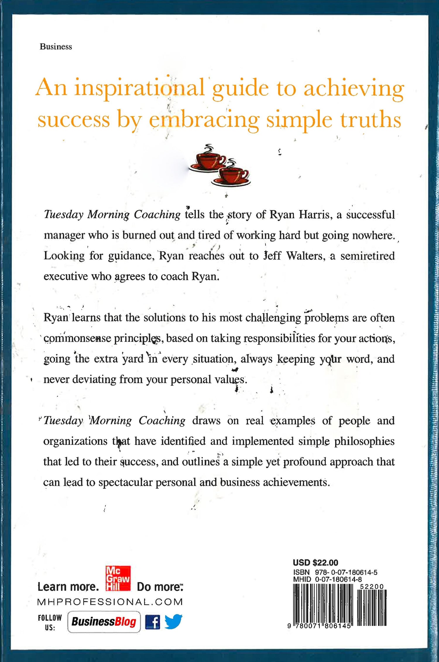 From the author of the bestselling Monday Morningseries--an instructive, inspiring story on rebooting your life and career with the power of simple truthsRyan Harris has been floundering for too long. His career is off track, and his personal life is in shambles. In his own words, he feels like he has "been beaten up physically and emotionally for months." For the first time in his life, he knows he is unable to pull himself out of this funk by himself.Ryan turns to Jeff Walters, a personal coach and mentor he had once worked with. Ryan had always admired the way Jeff handled challenges and the success that always seemedto follow. Jeff agrees to coach Ryan every Tuesday morning for eight weeks.The story of Ryan's personal awakening, Tuesday Morning Coaching reveals the timeless truths anyone can rely on when success seems impossible. Jeff explains that real success lies in embracing the simple verities of life; it's more about how we live than what we do. Jeff reveals the eight basic truths of success, including:No Matter What . . . accept your responsibilities, maintain focus, and move forwardAnd Then Some . . . give a little more than people expectAbove All Else . . . know what is nonnegotiableat work and in lifeFrom Now On . . . learn from your failures and refuse to make the same mistake twiceConsider It Done . . . deliver on your word, without failYou will learn, as Ryan does, that you have been getting in your own way. Attaining overall success isn't about solving a specific problem; it's about basing your life on what is true and behaving accordingly.When you hit career roadblocks, burn out on stress, and arrive at crossroads in your personal relationships--well, that's just life. Only when you follow a path paved on eternal human truths will you live a quality life.Read Tuesday Morning Coaching and take your first steps to a life of richness, fulfillment, and overall career and life success.Tuesday Morning Coaching tells the story of Ryan Harris, a successful manager who is burned out and tired of working hard but going nowhere. Looking for guidance, Ryan reaches out to Jeff Walters, a semiretired executive who agrees to coach Ryan. Ryan learns that the solutions to his most challenging problems are often commonsense principles, based on taking responsibilities for your actions, going the extra yard in every situation, always keeping your word, and never deviating from your personal values.Tuesday Morning Coaching draws on real examples of people and organizations that have identifi ed and implemented simple philosophies that led to their success, and outlines a simple yet profound approach that can lead to spectacular personal and business achievements.
