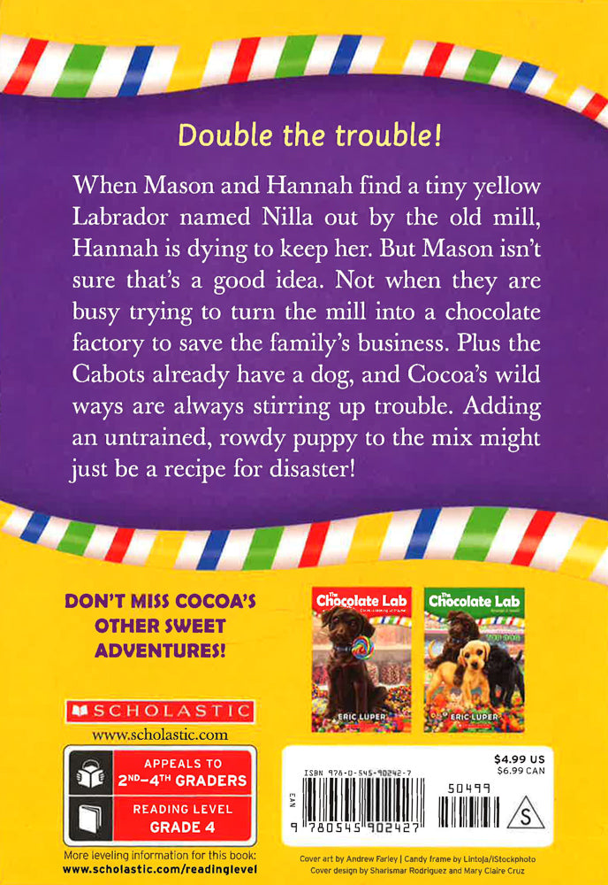 One candy-crazed Labrador plus one feisty puppy equals double the trouble!When Mason and Hannah find a tiny yellow Labrador named Nilla out by the old mill, Hannah is dying to keep her. But Mason isn't sure that's a good idea. Not when they are busy trying to turn the mill into a chocolate factory to save the family's business. Plus the Cabots already have a dog, and Cocoa's wild ways are always stirring up trouble. Adding an untrained, rowdy puppy to the mix might just be a recipe for disaster!